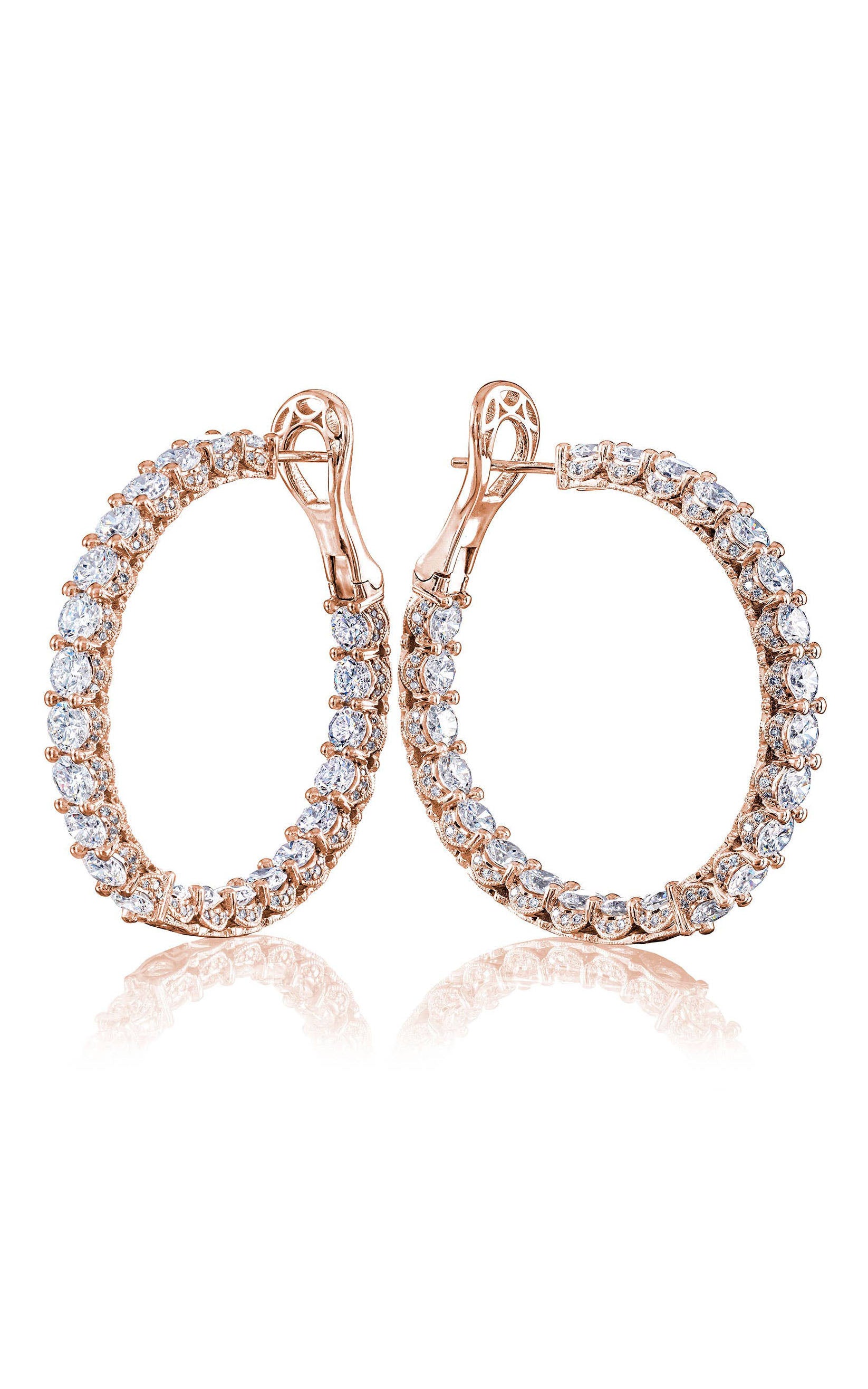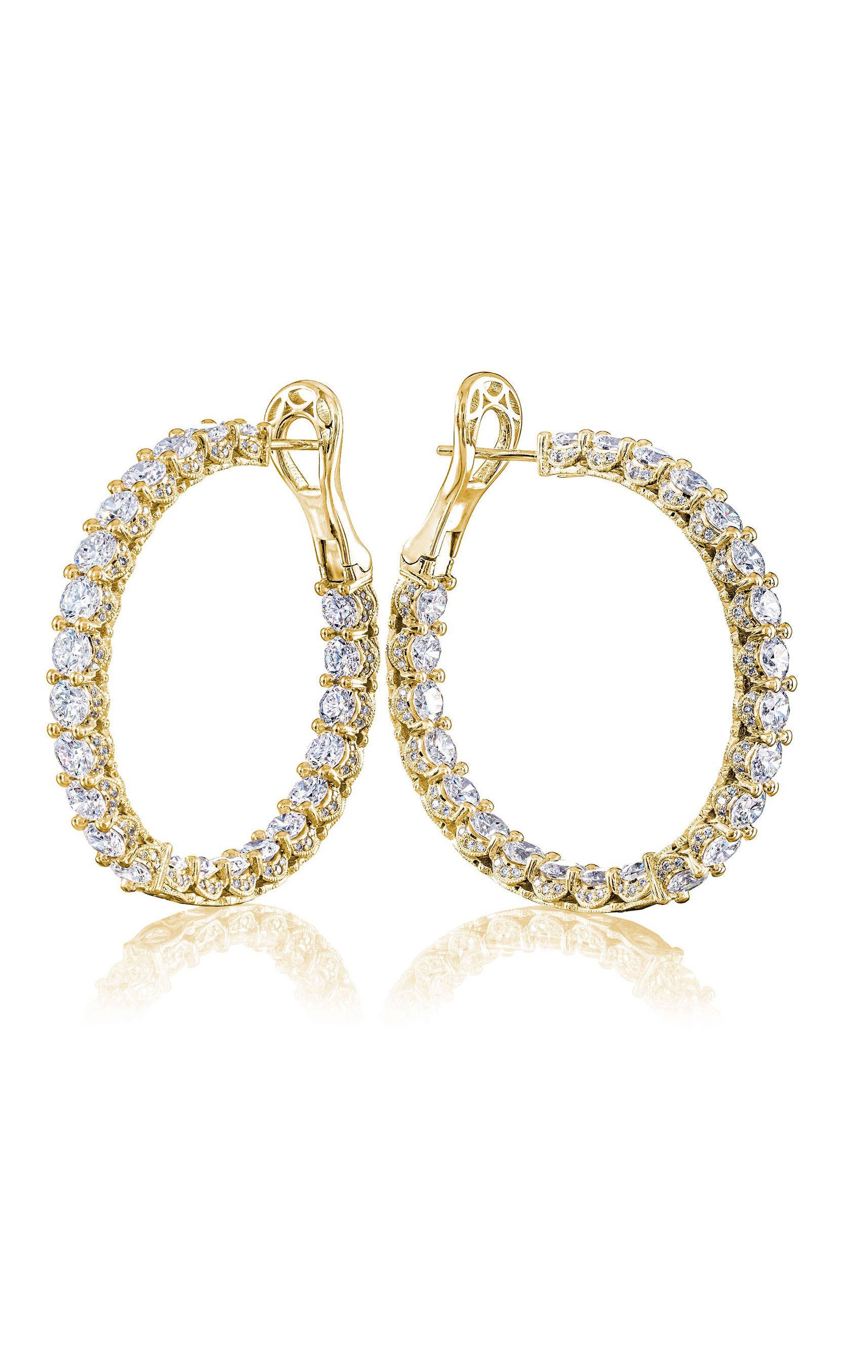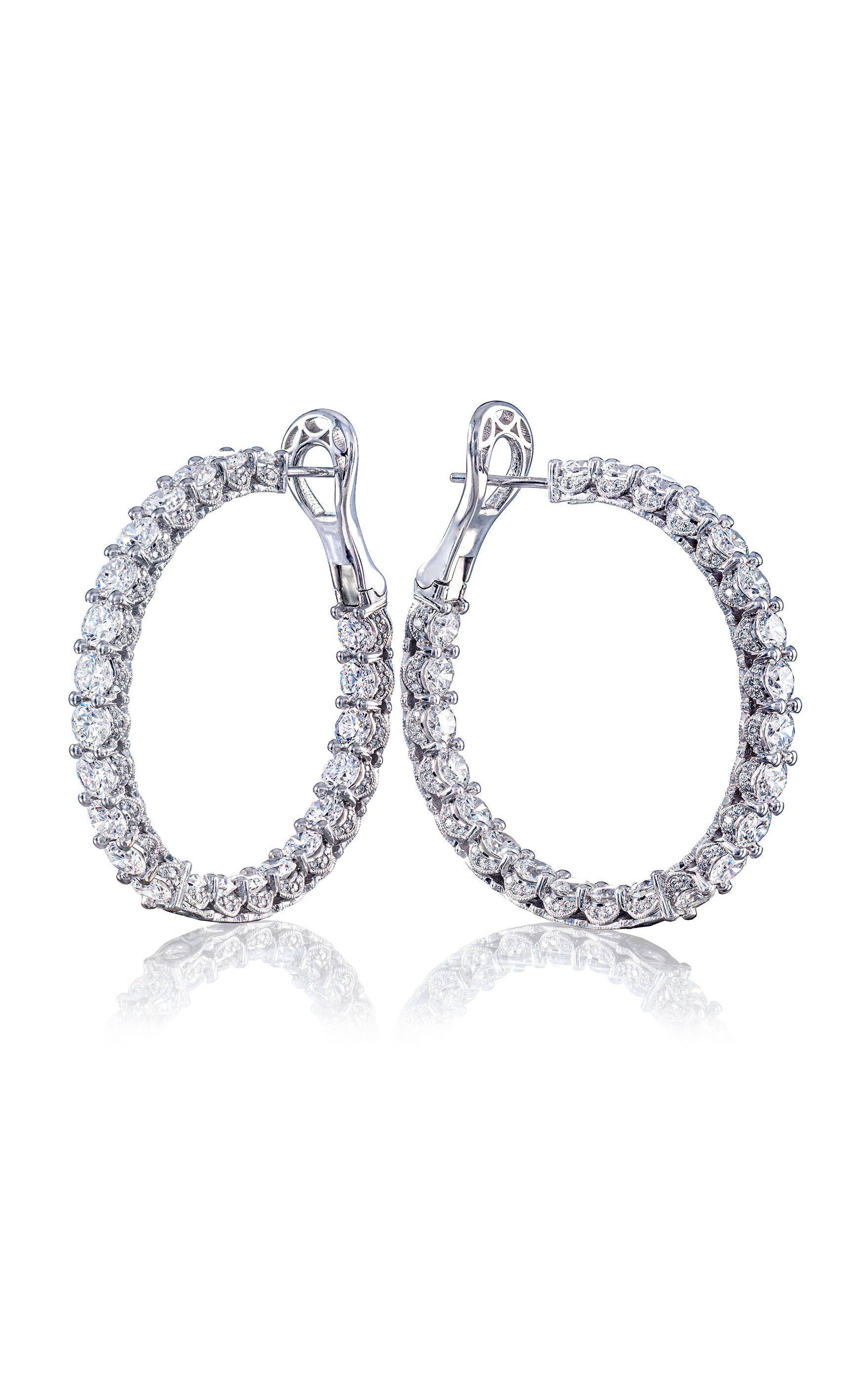 These diamond-intense hoop earrings patterned with baguette and round-brilliant shapes made even brighter with diamond accents on the side profile, creating an all-angle sparkle. Set into 18kt gold, hand-decorated with delicate milgrain.
