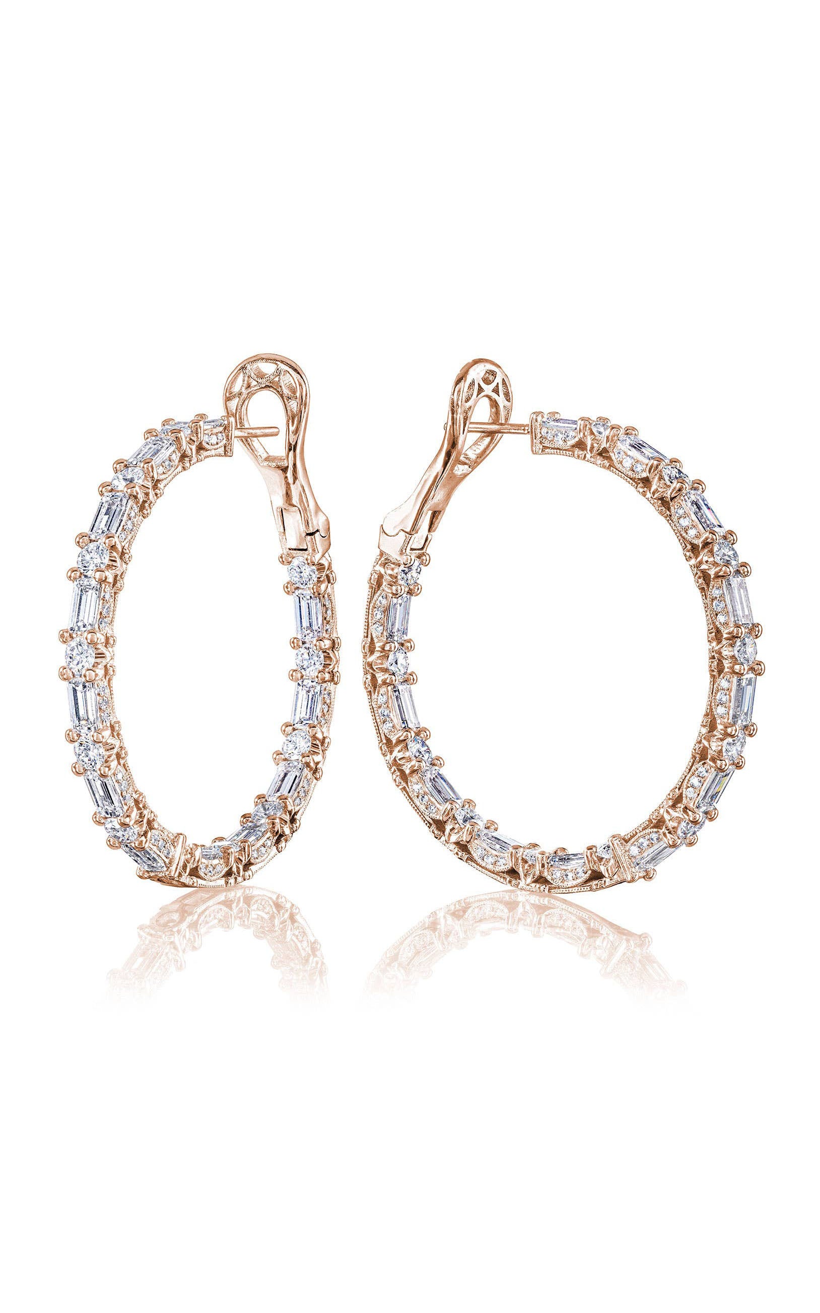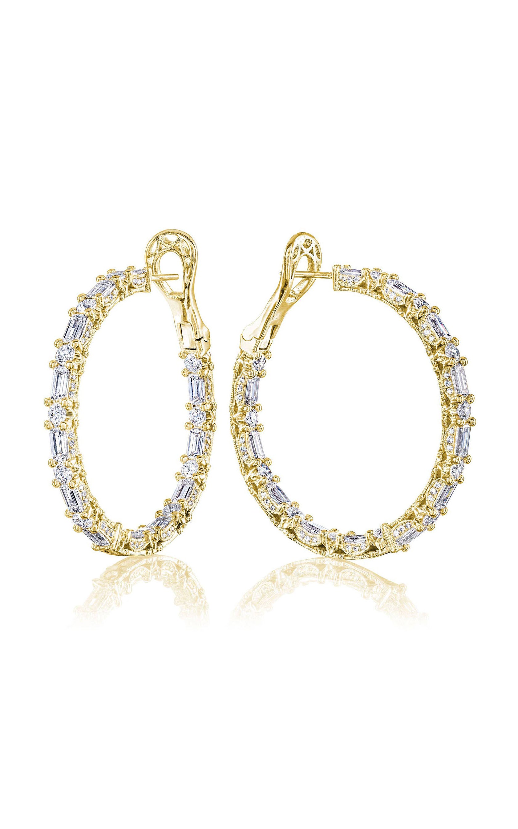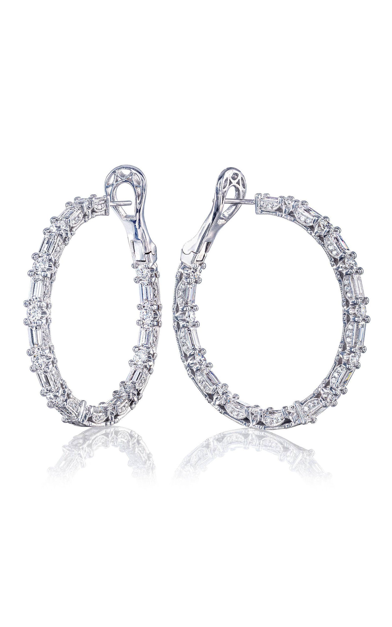 These diamond-intense hoop earrings patterned with baguette and round-brilliant shapes made even brighter with diamond accents on the side profile, creating an all-angle sparkle. Set into 18kt gold, hand-decorated with delicate milgrain.