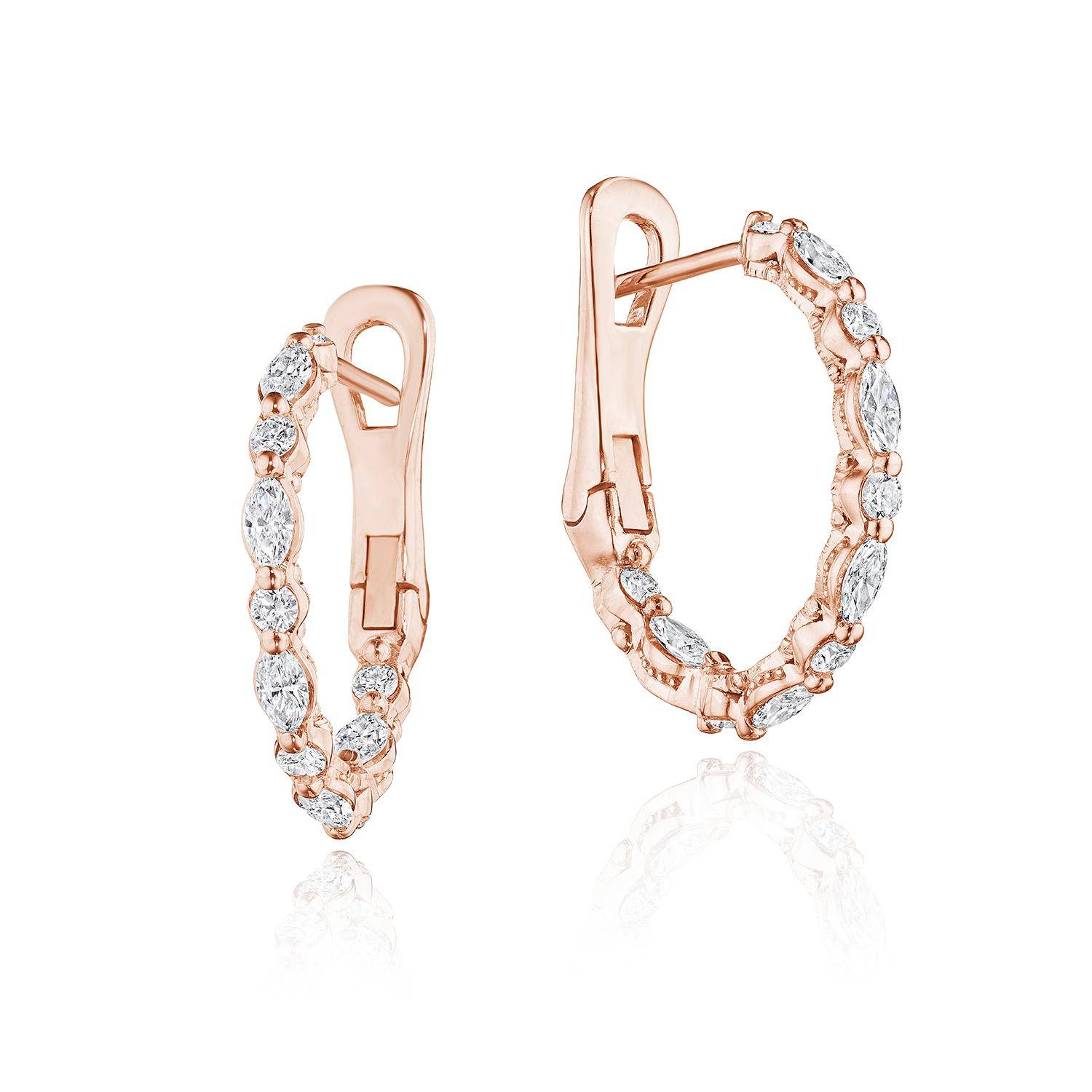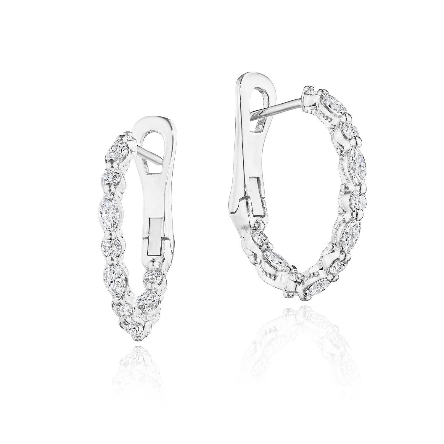 Oval hoop earrings of 18k White Gold are meticulously hand-set with marquise and round brilliant cut diamonds. Milgrain-studded TACORI Crescent detailing decorates the silhouette.