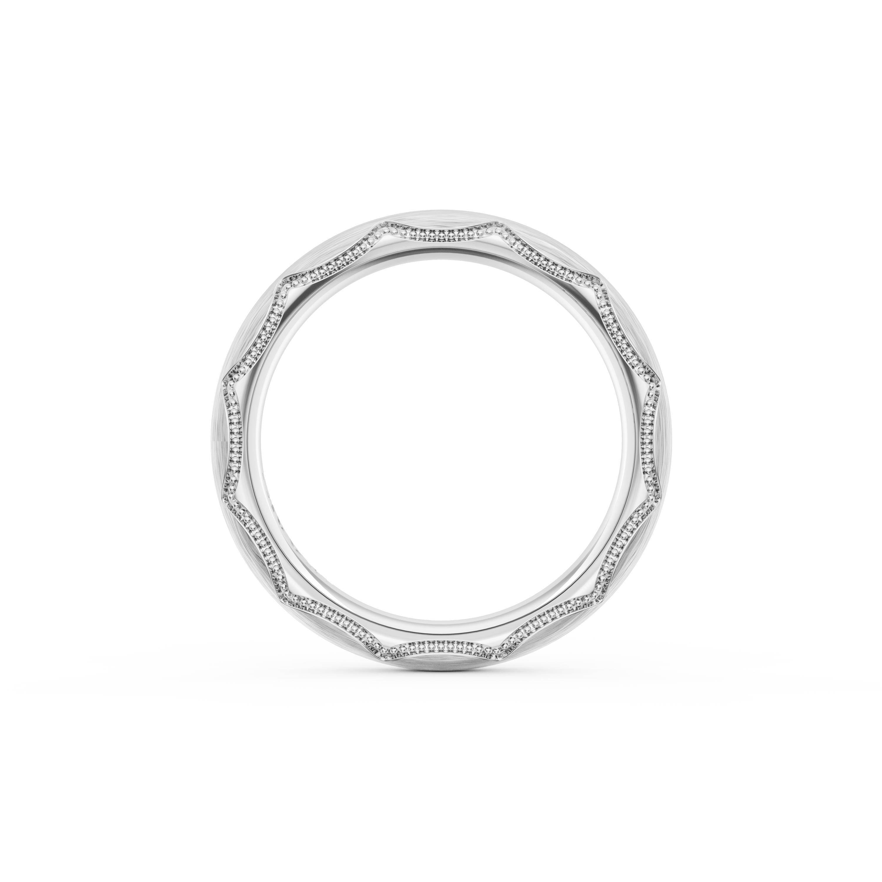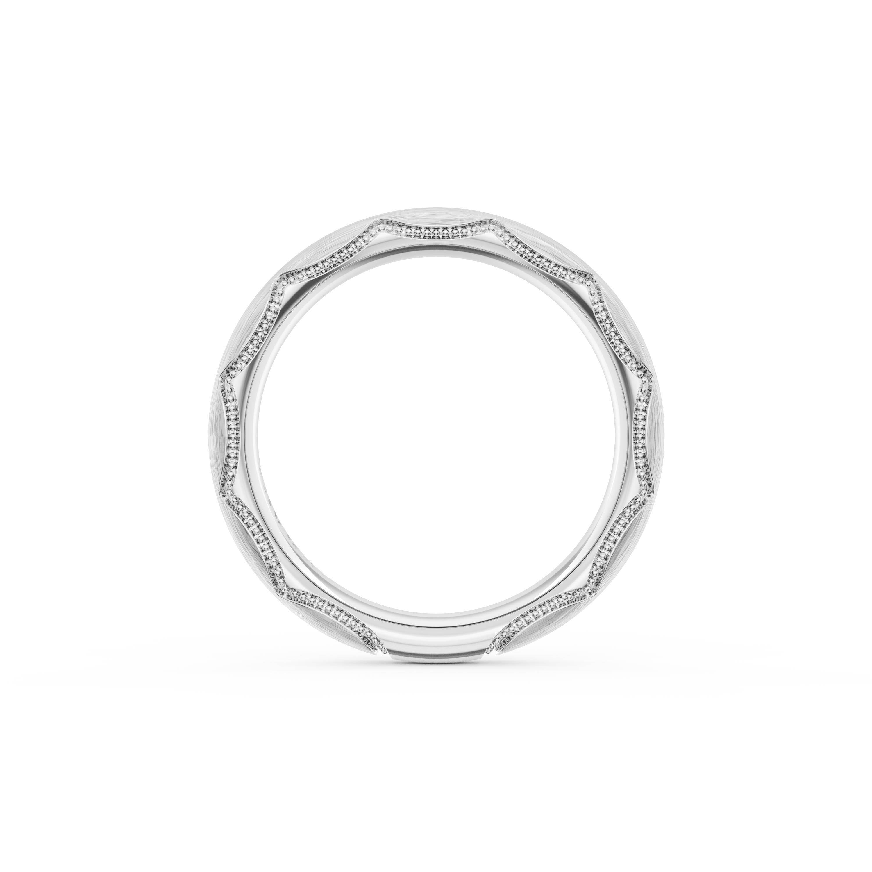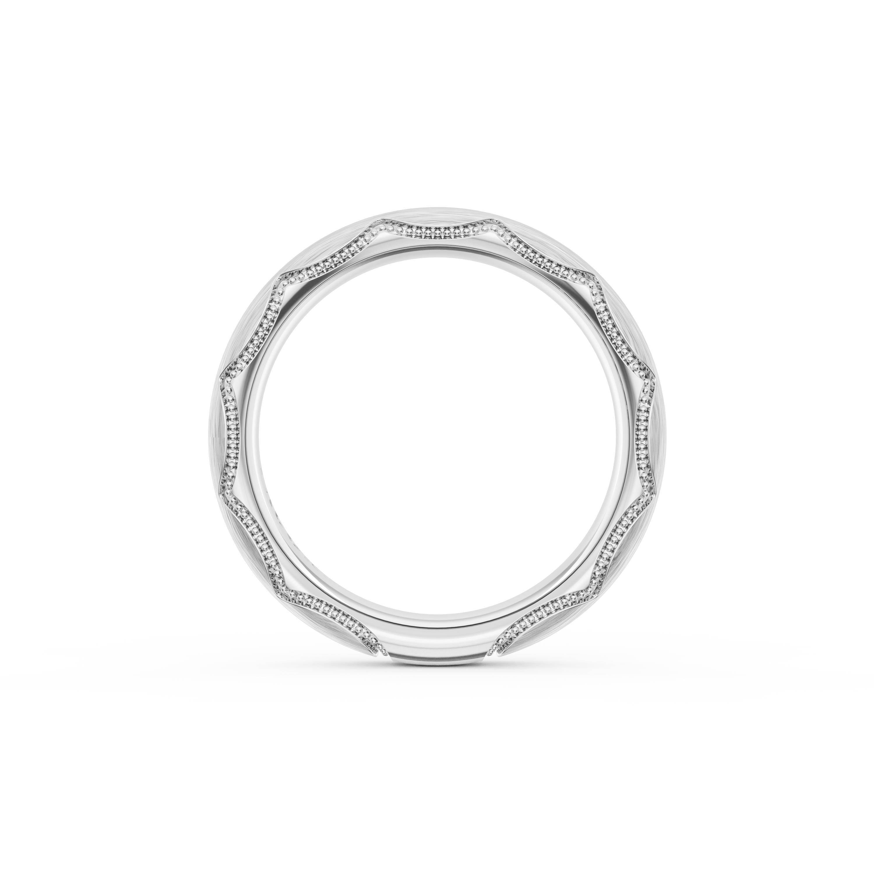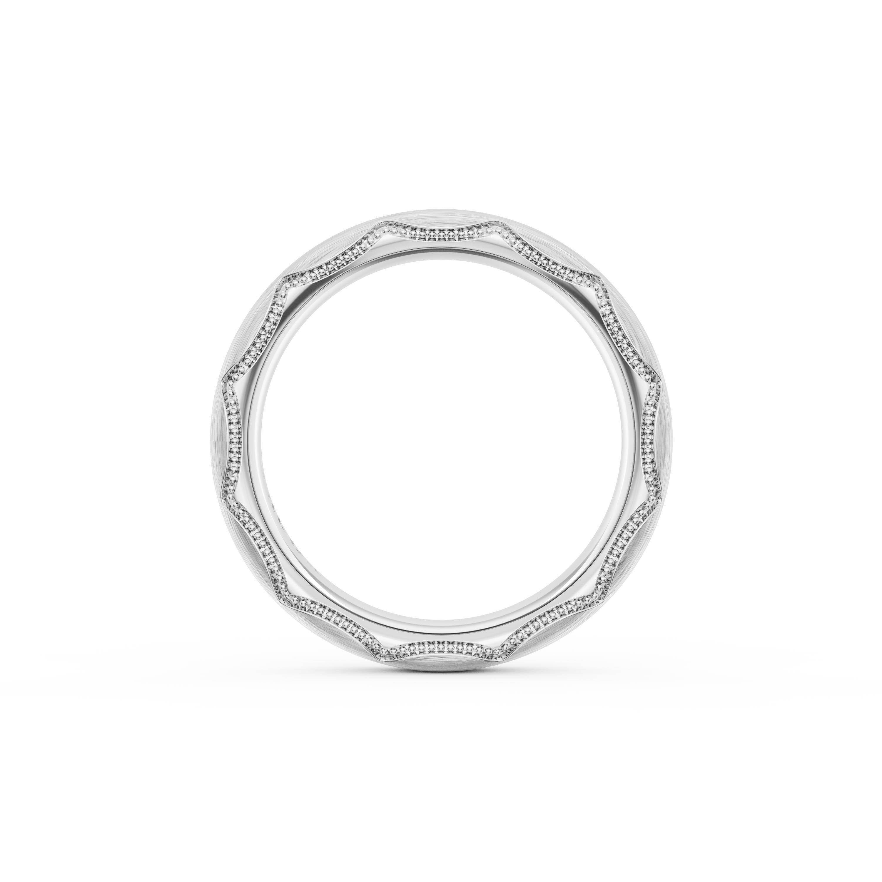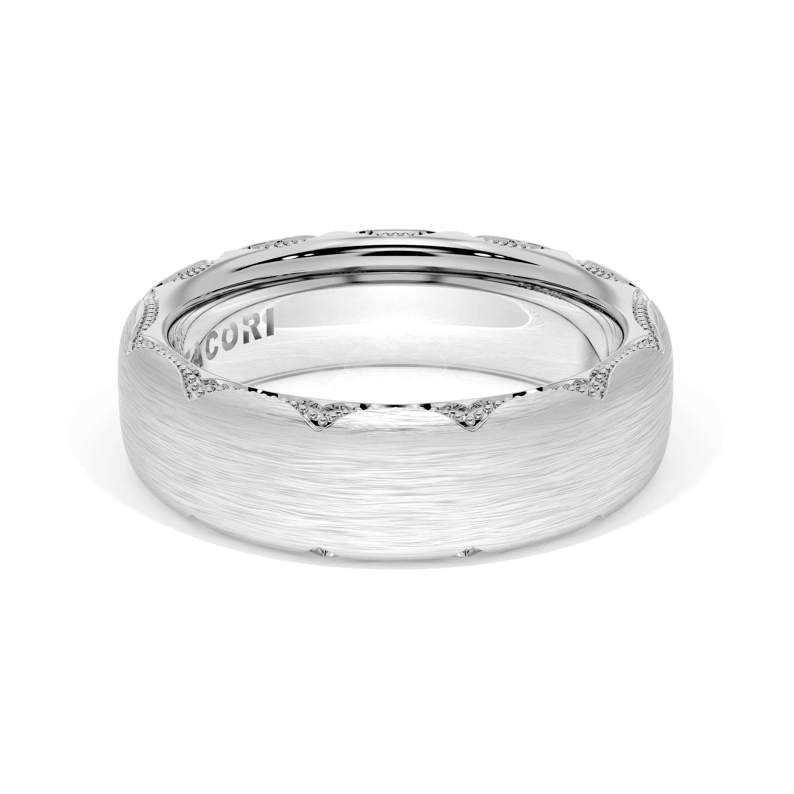 This bold and modern cigar-style band with clean lines gets a touch of texture from milgrain Crescent detailing on the silhouette.