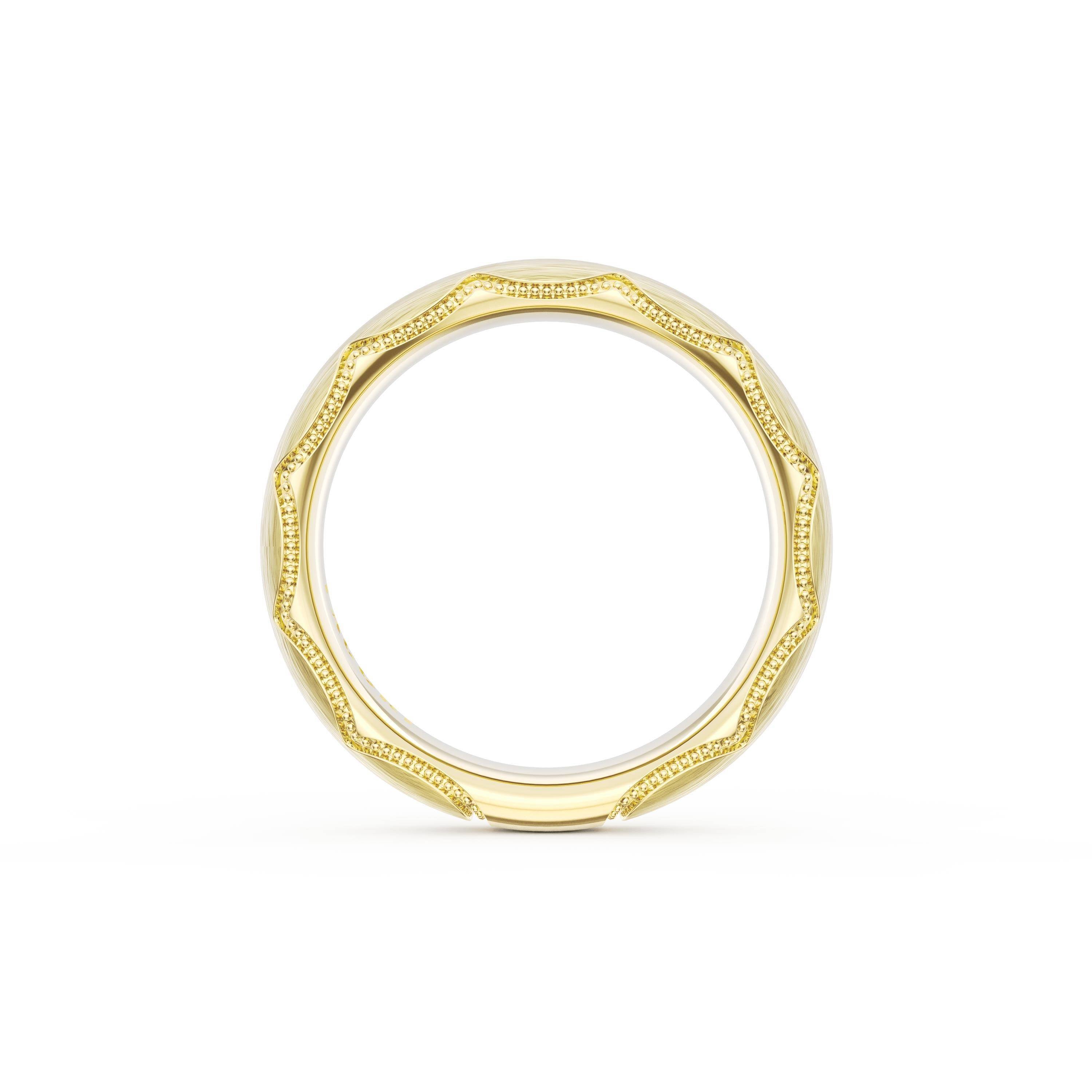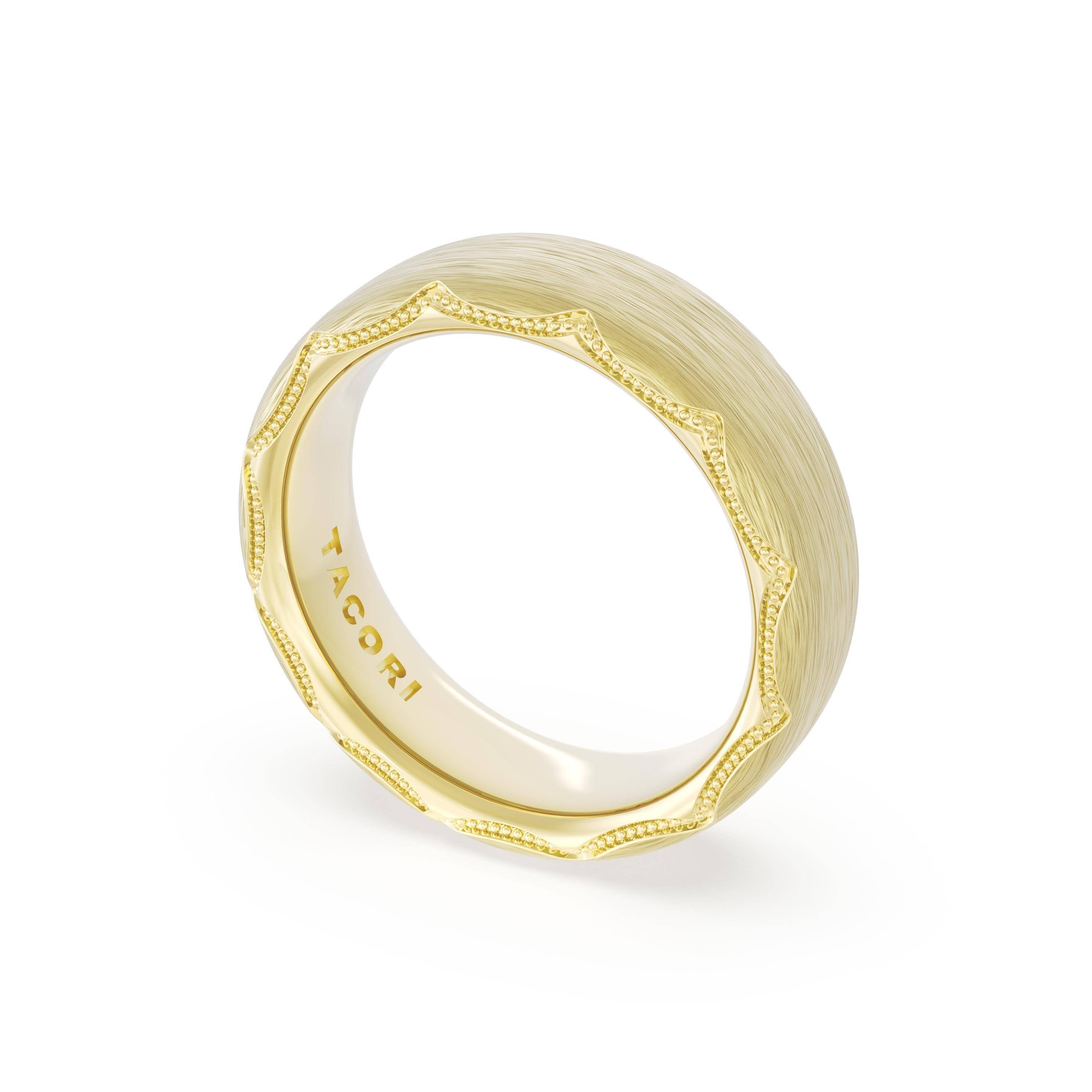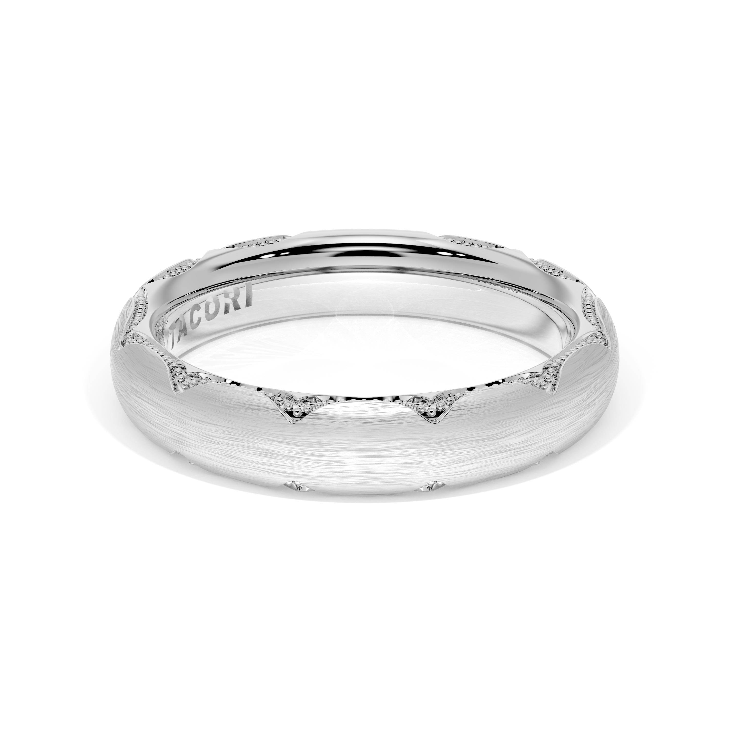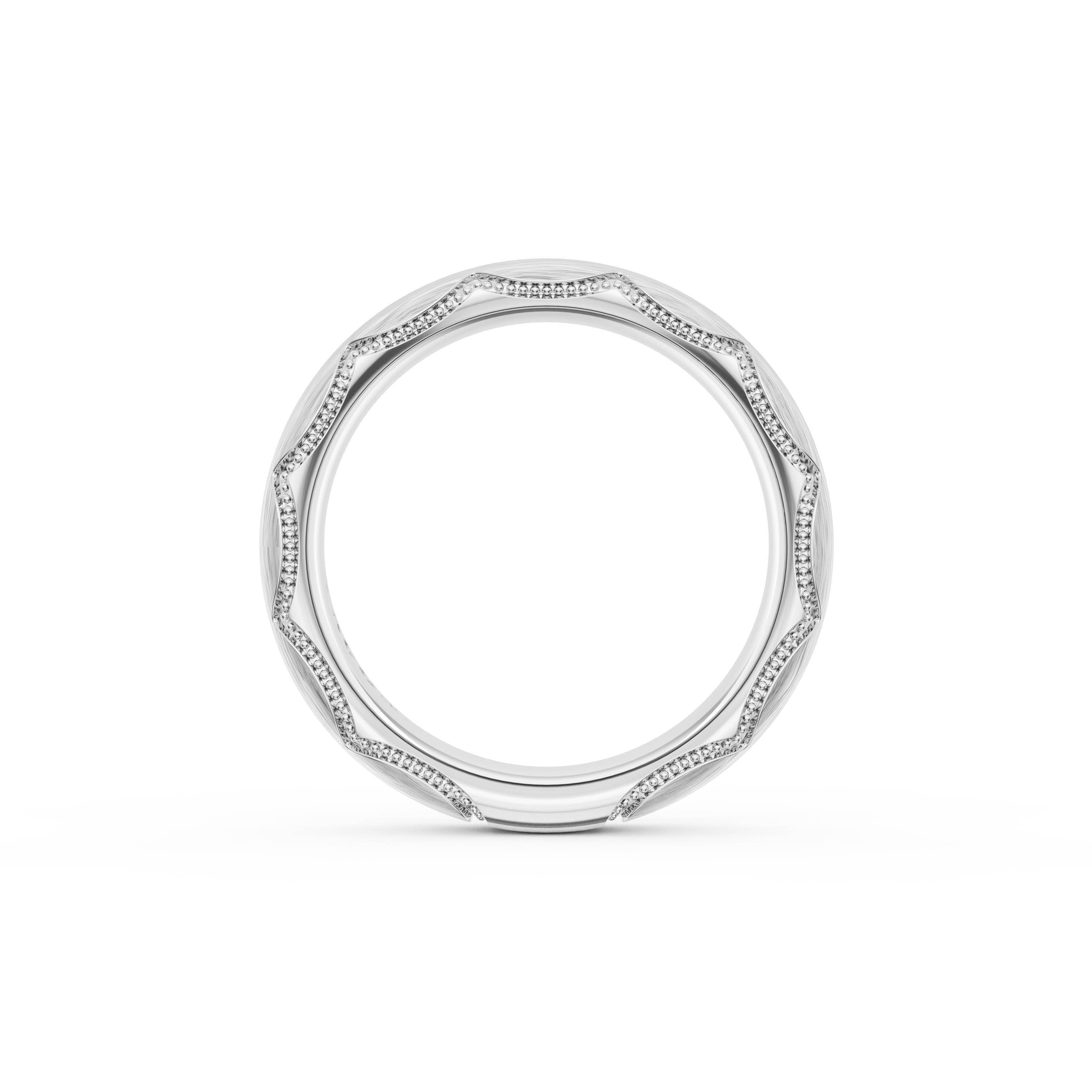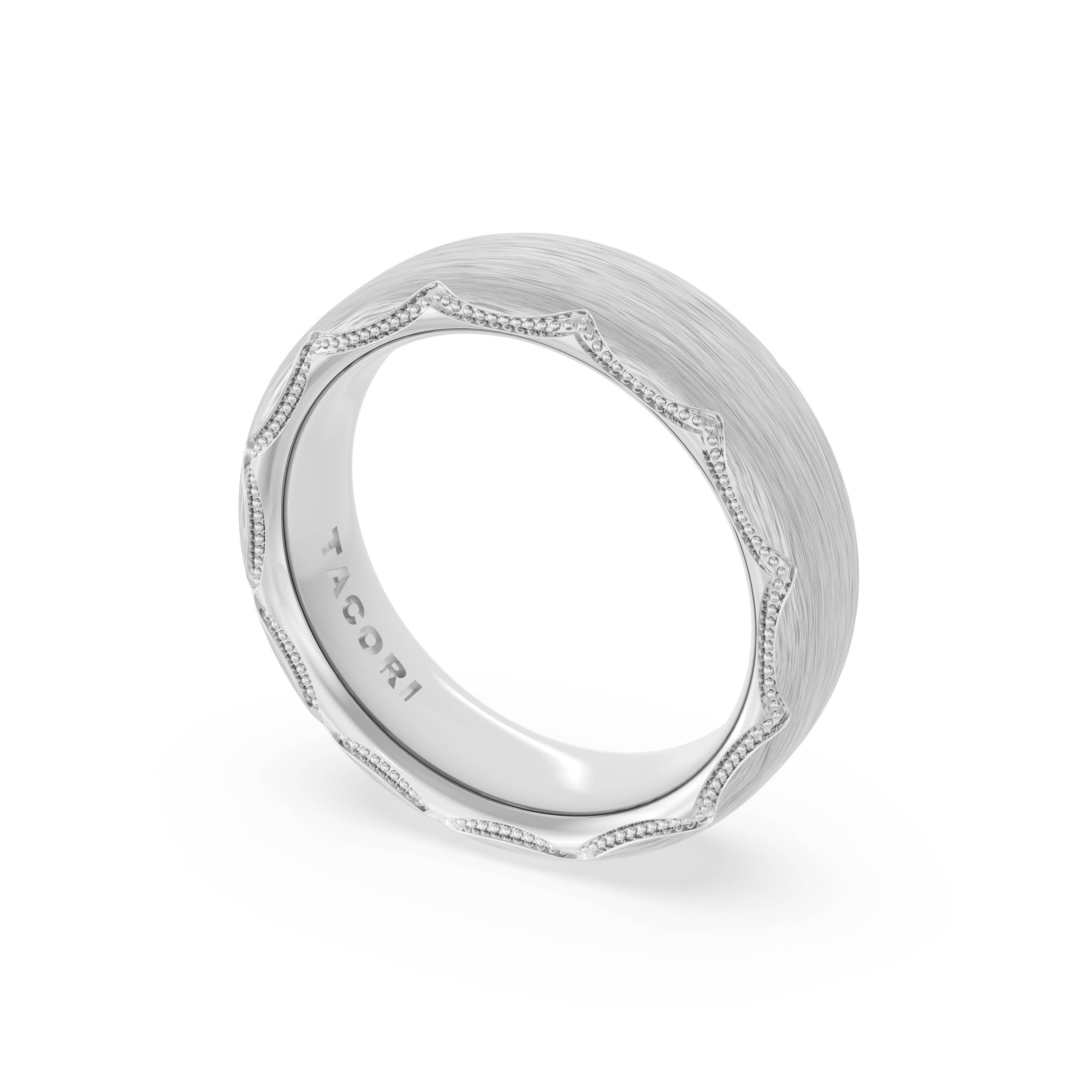 This bold and modern cigar-style band with clean lines gets a touch of texture from milgrain Crescent detailing on the silhouette.