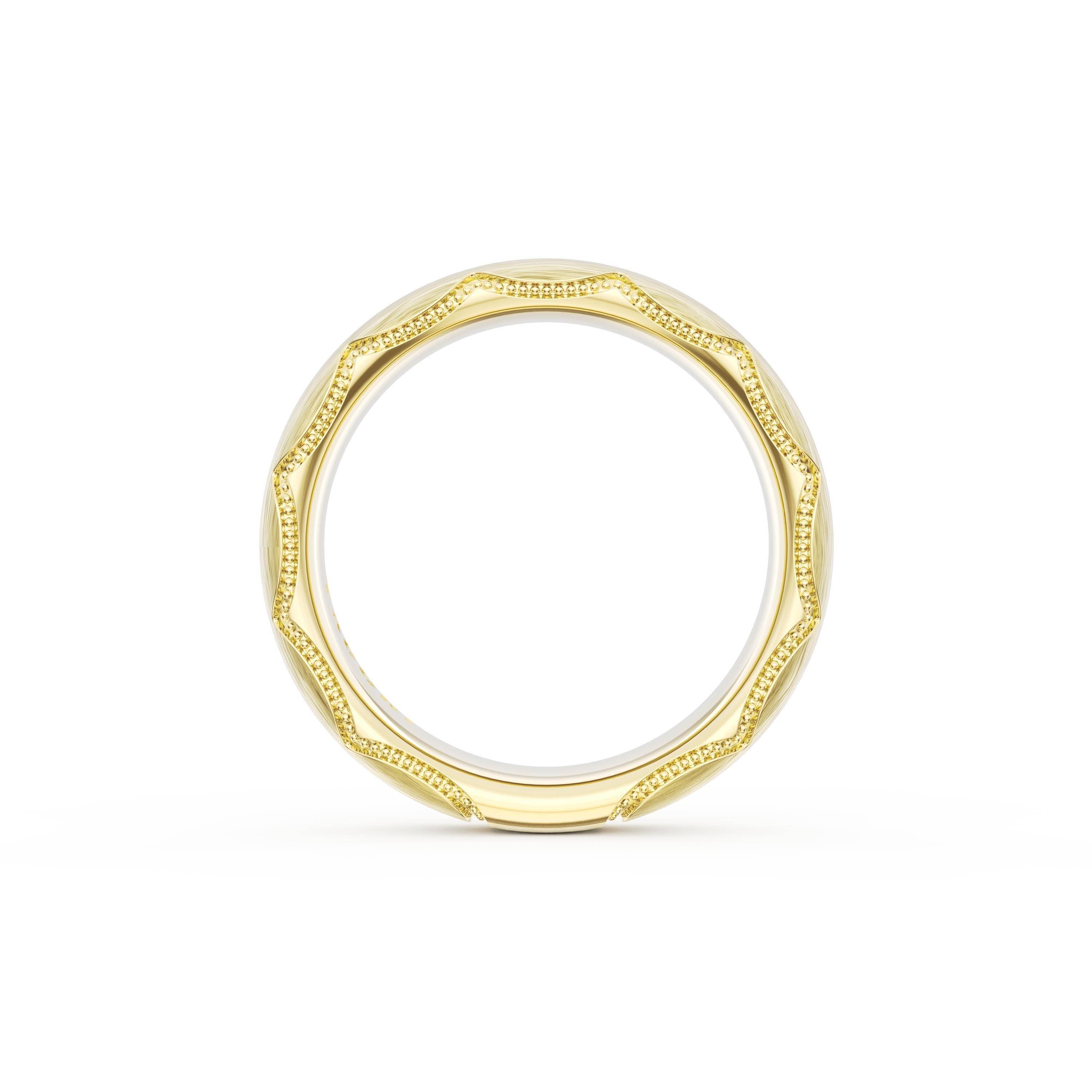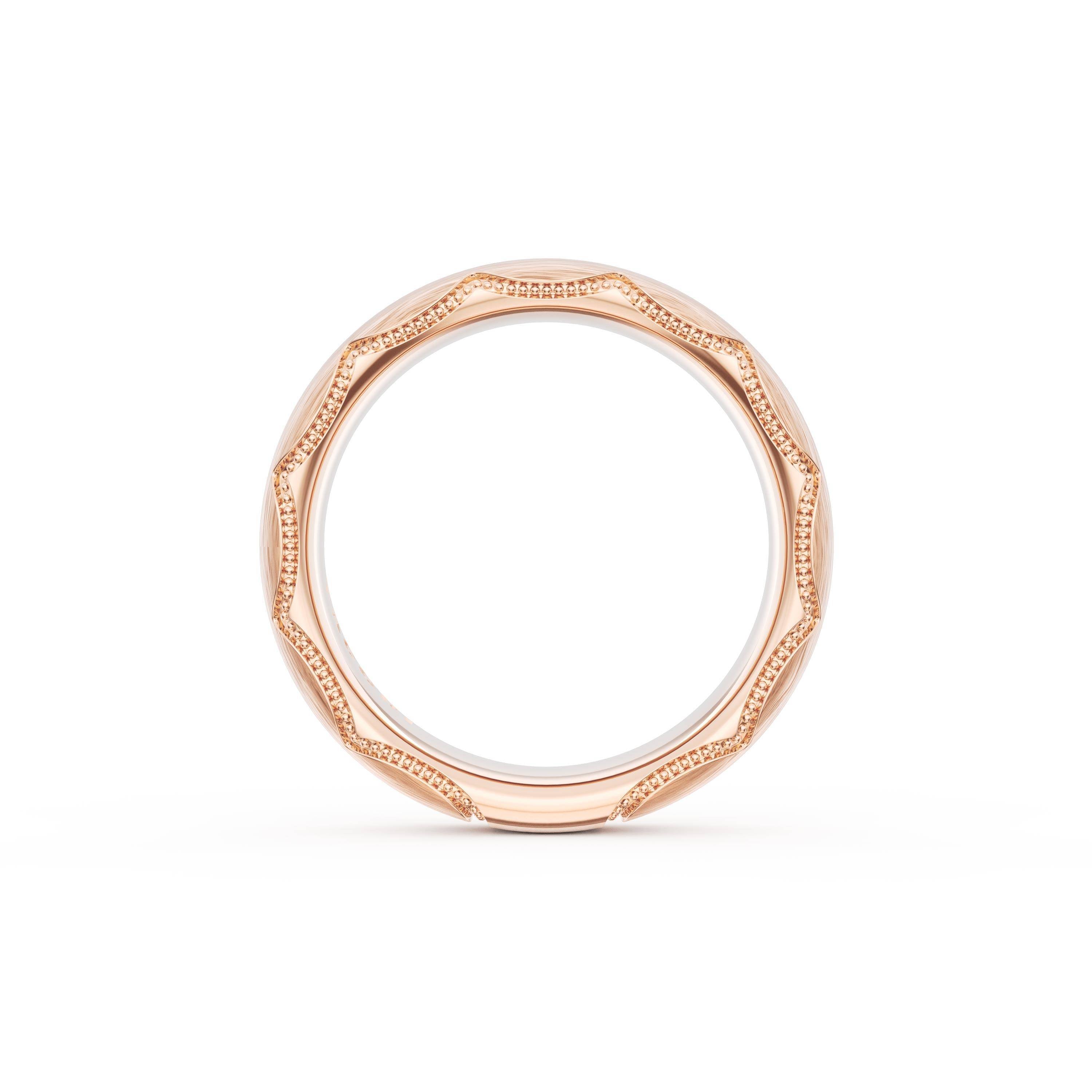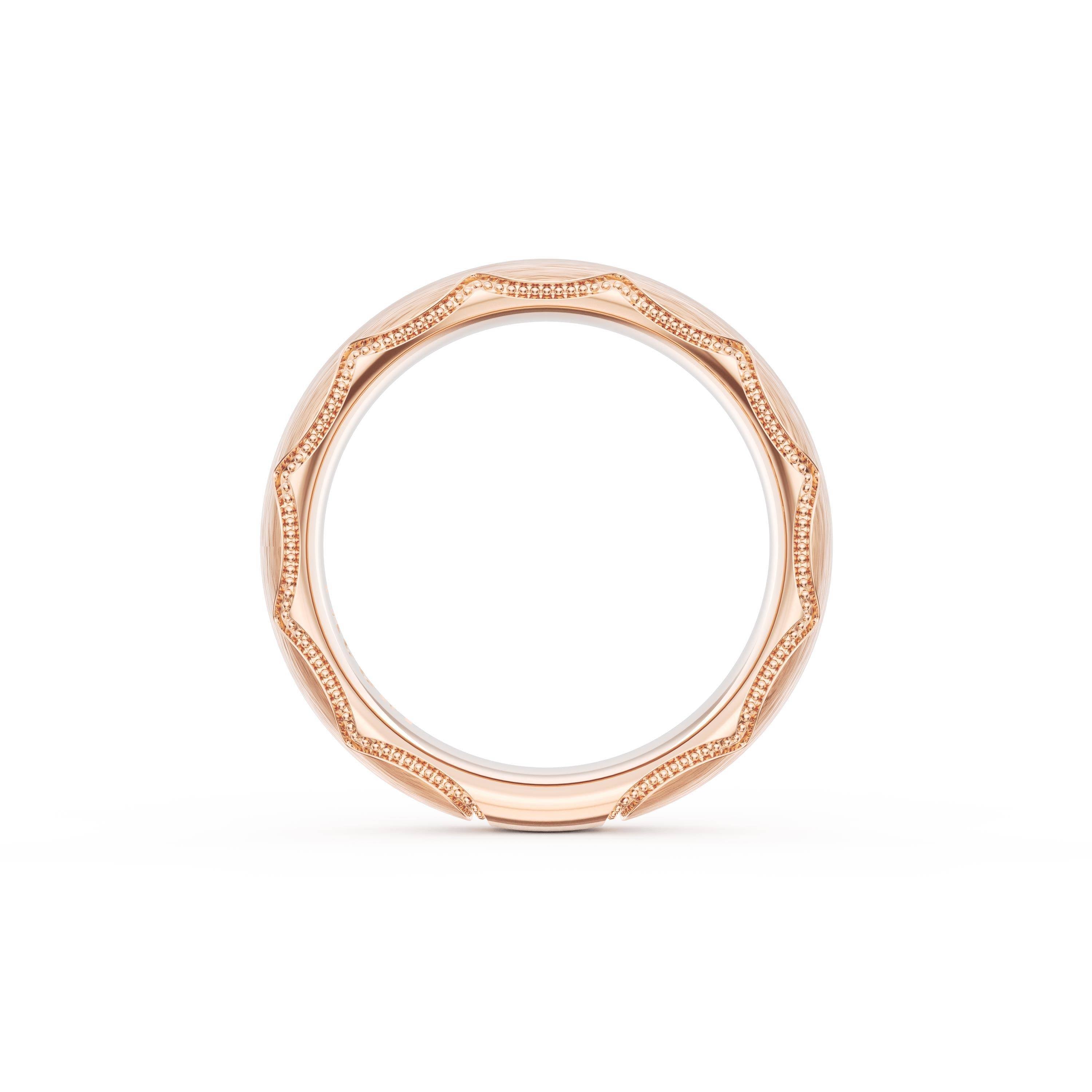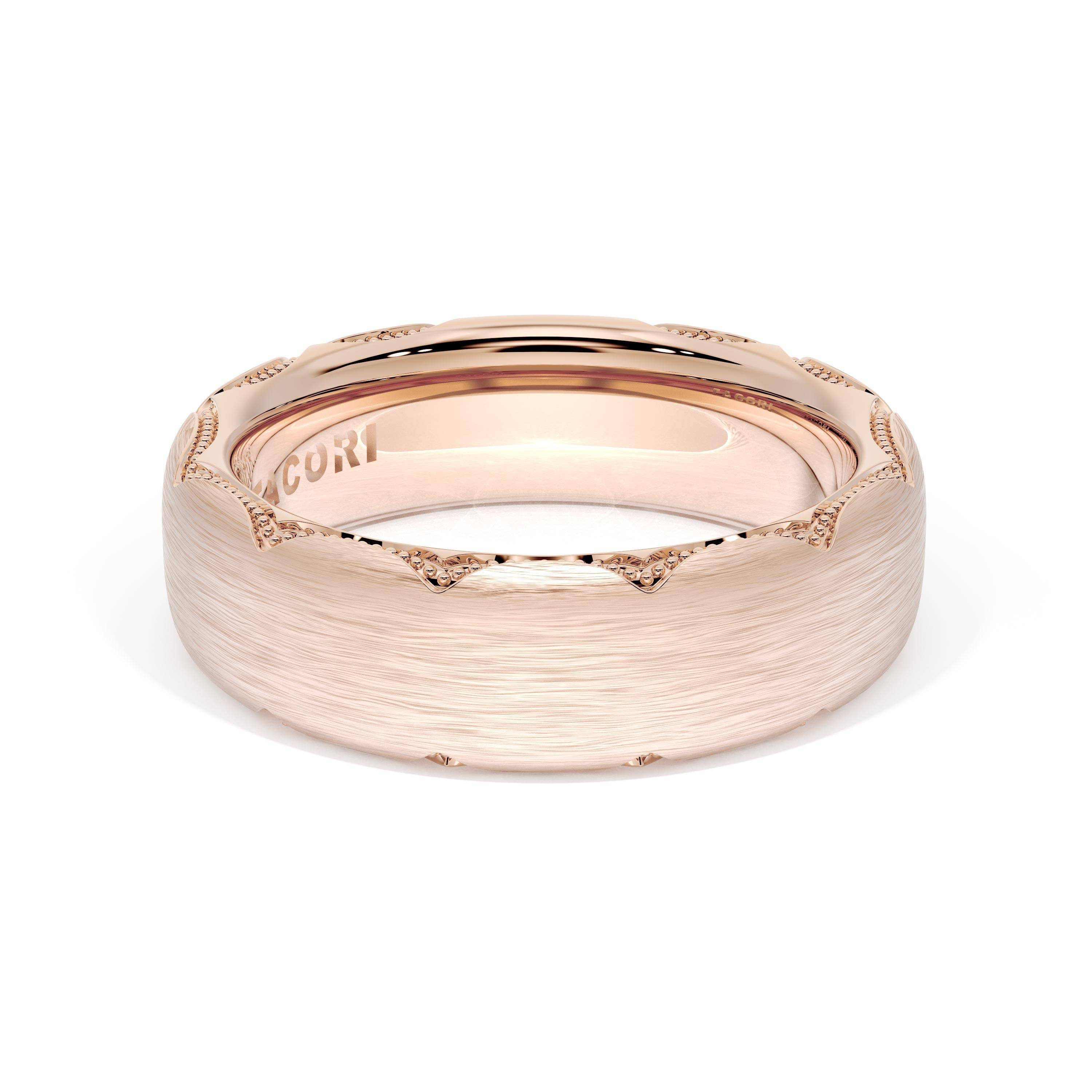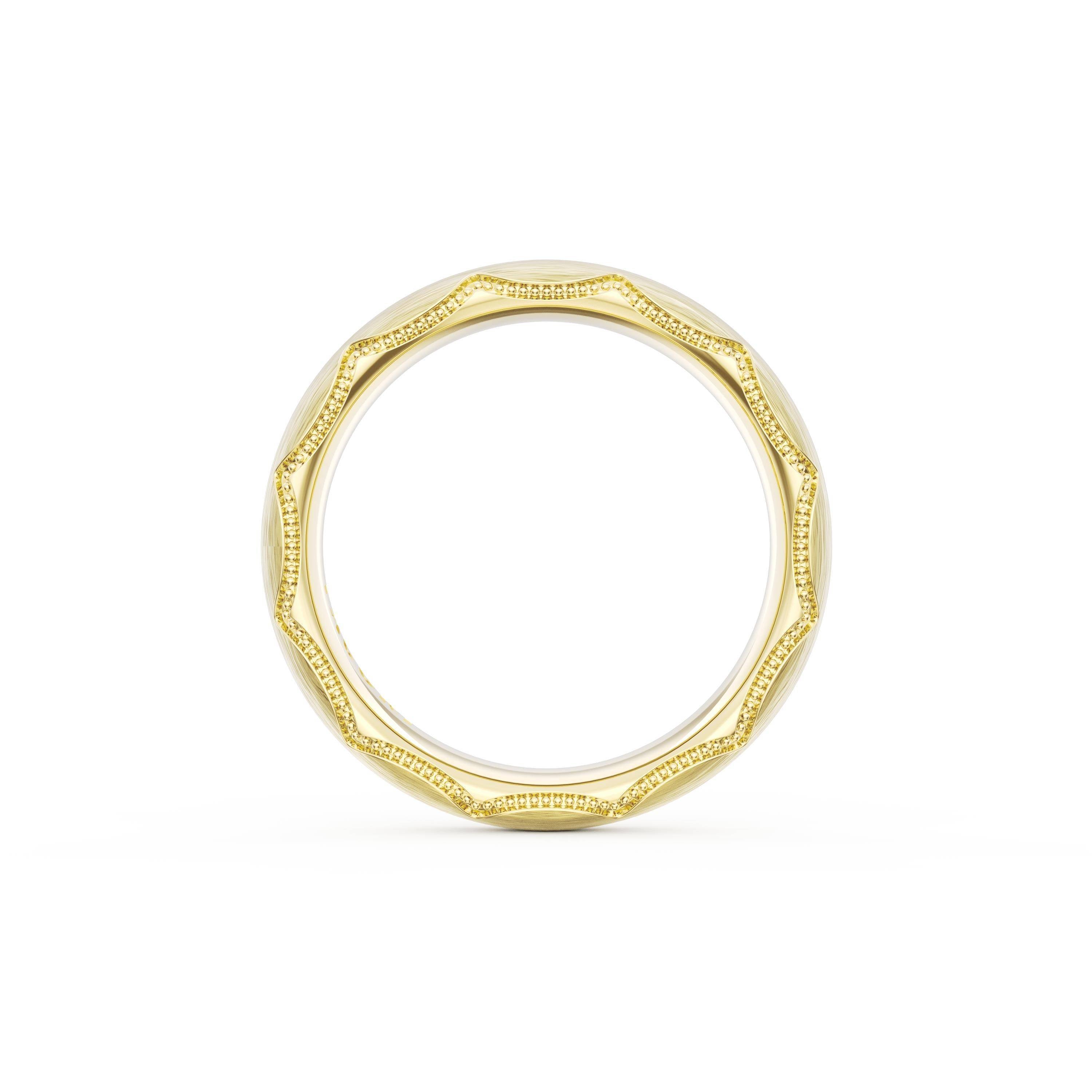 This bold and modern cigar-style band with clean lines gets a touch of texture from milgrain Crescent detailing on the silhouette.