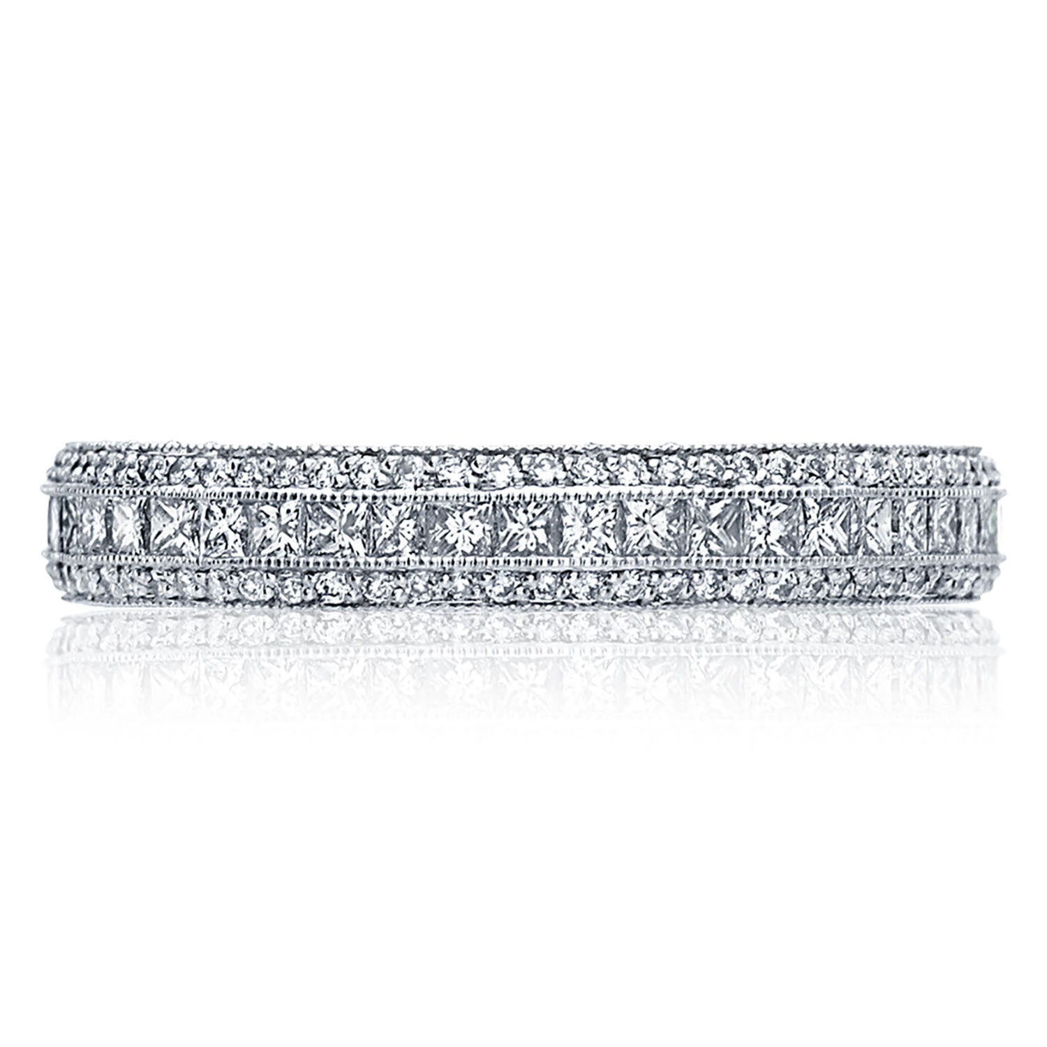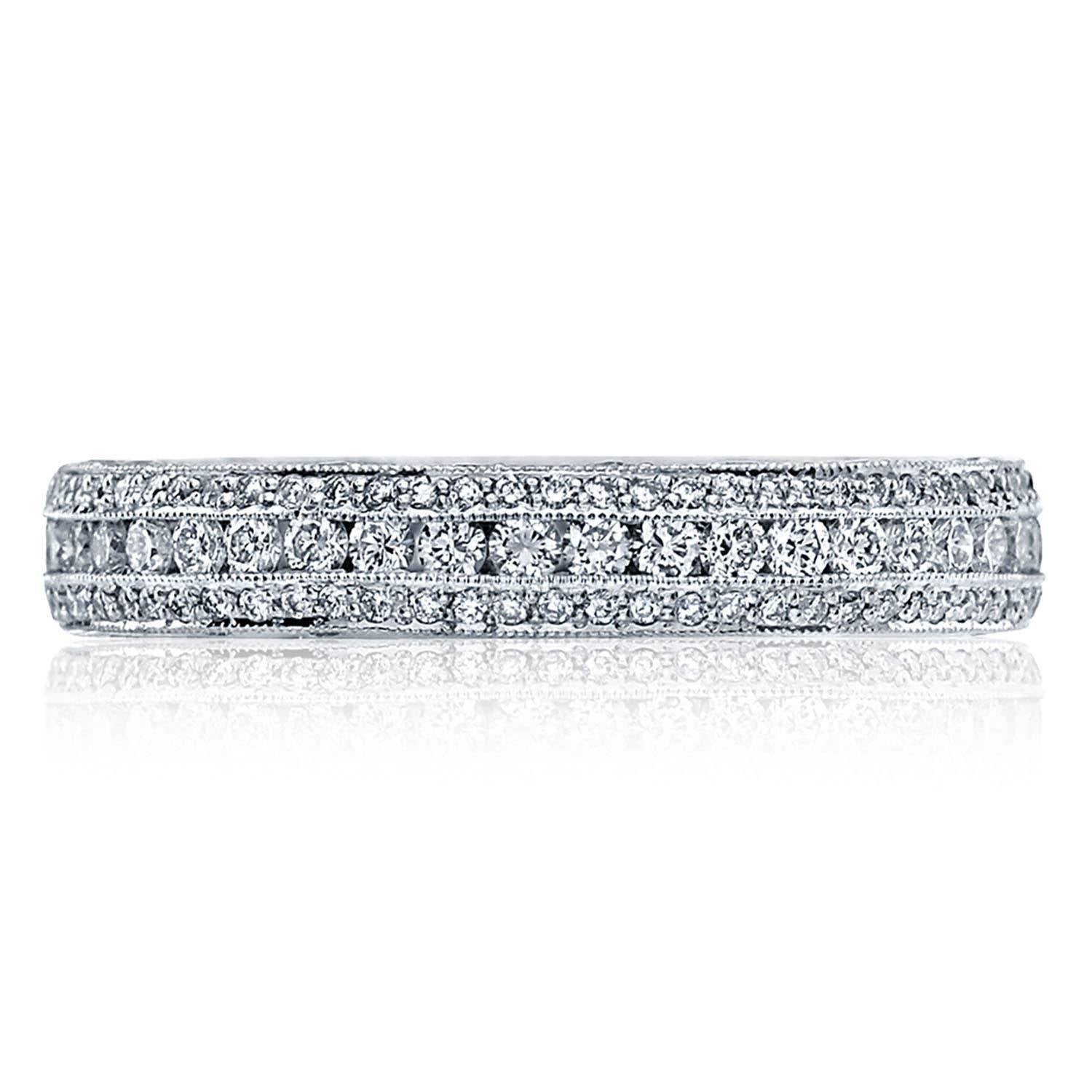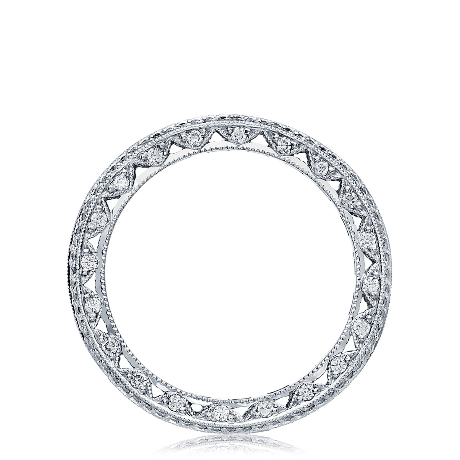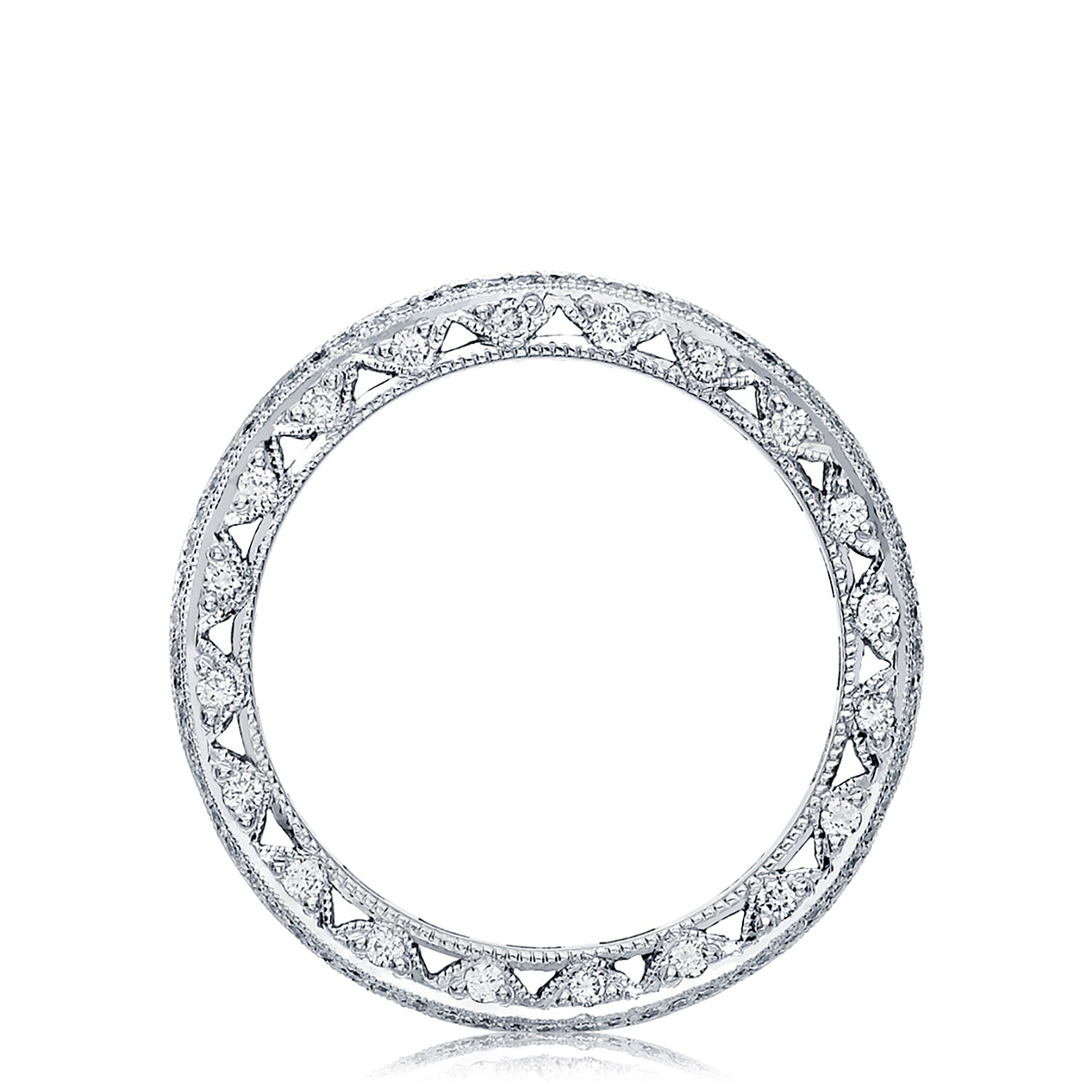 Channel-set strings of round-brilliant diamonds add all-angle sparkle to the ceiling of the ring, while windows of light and diamond-accented Classic Cresent fabric on the inner face silhouette adds brilliance.