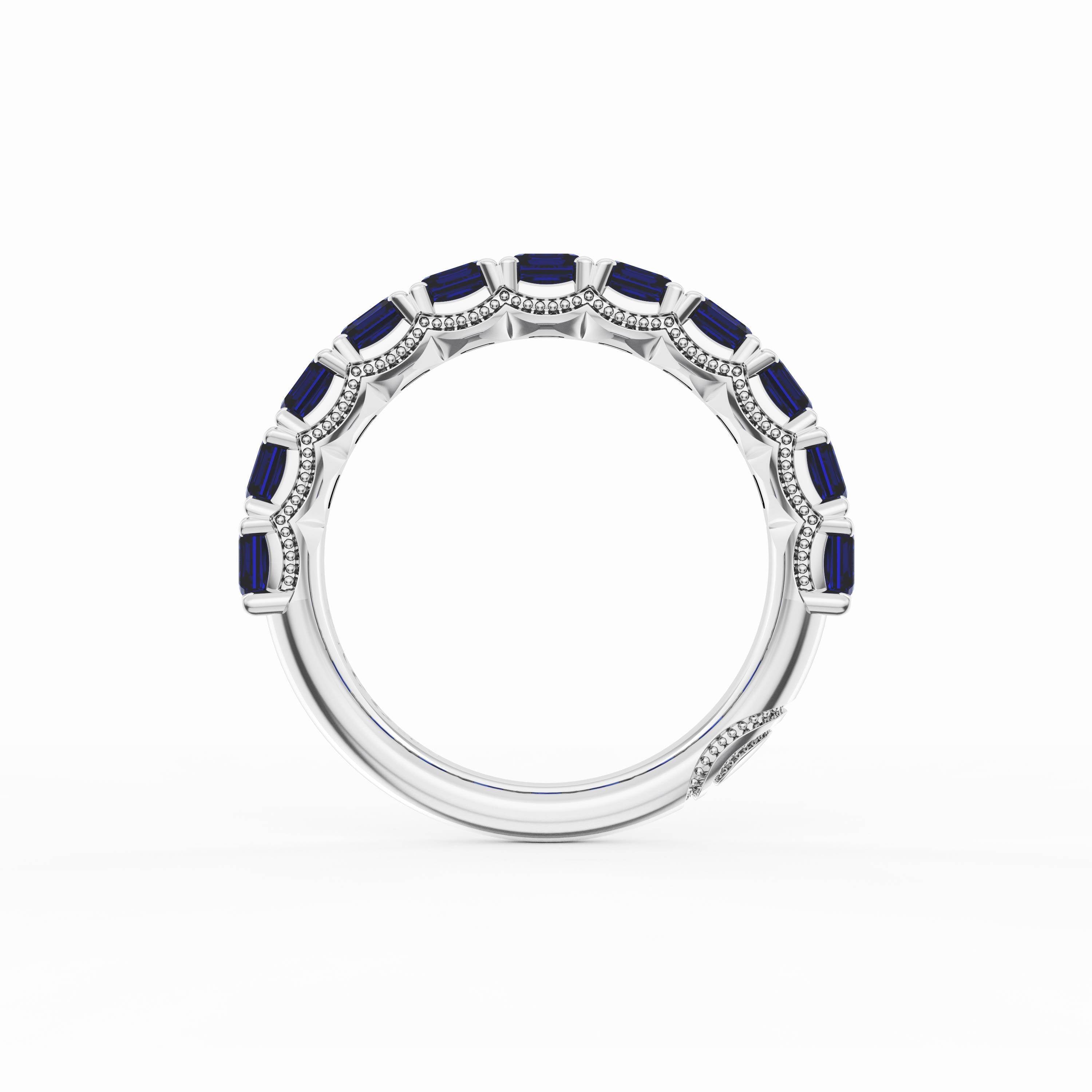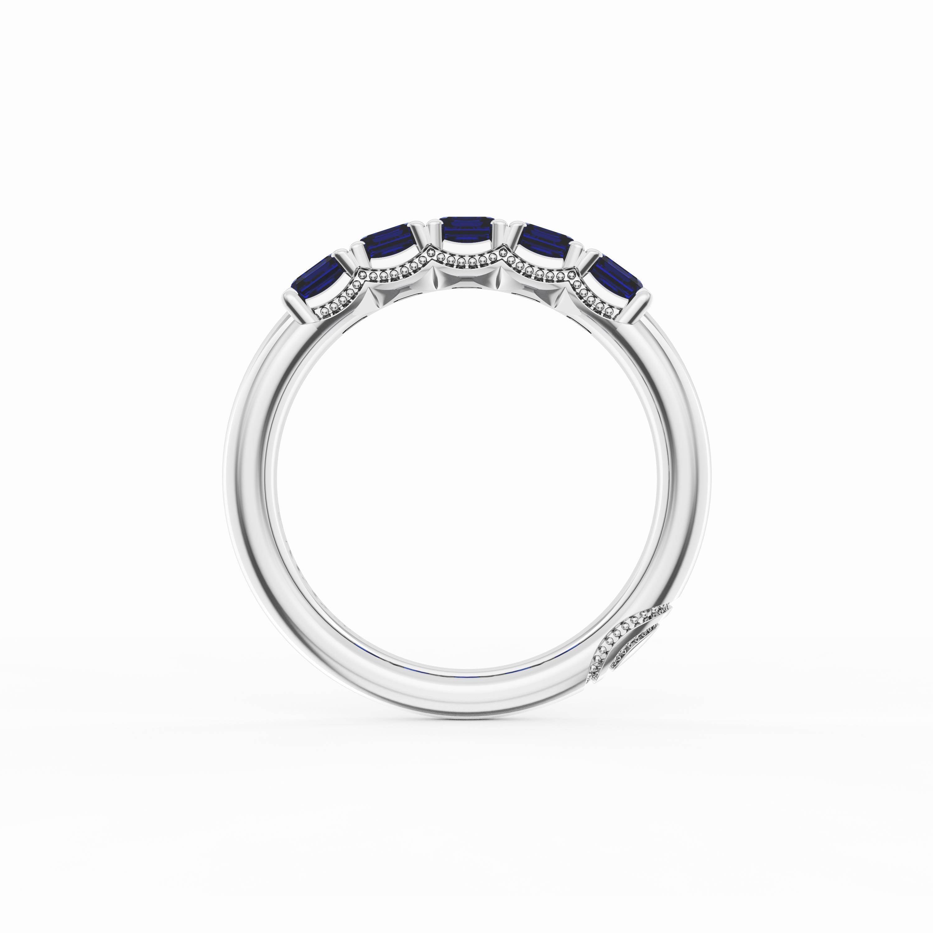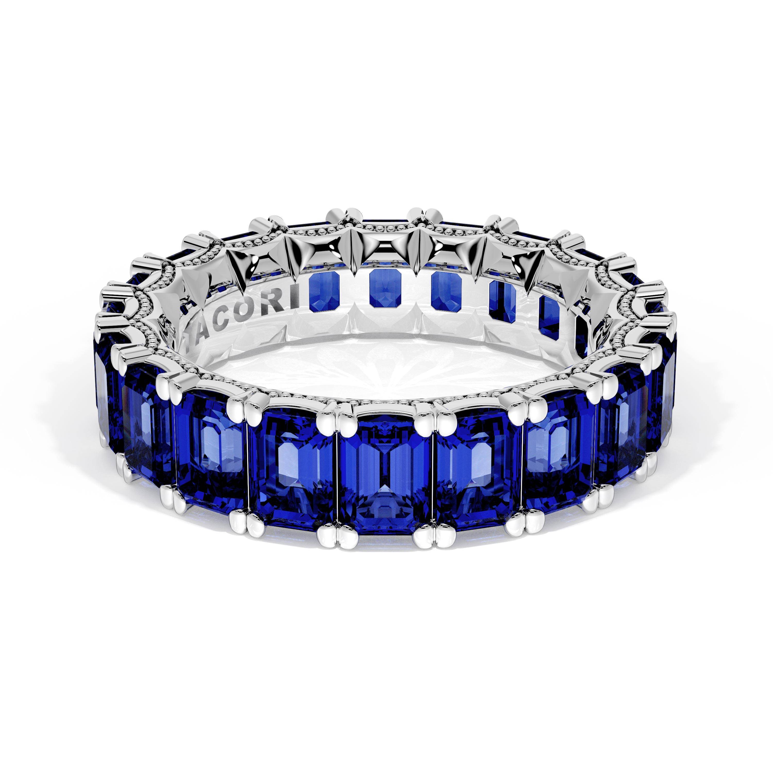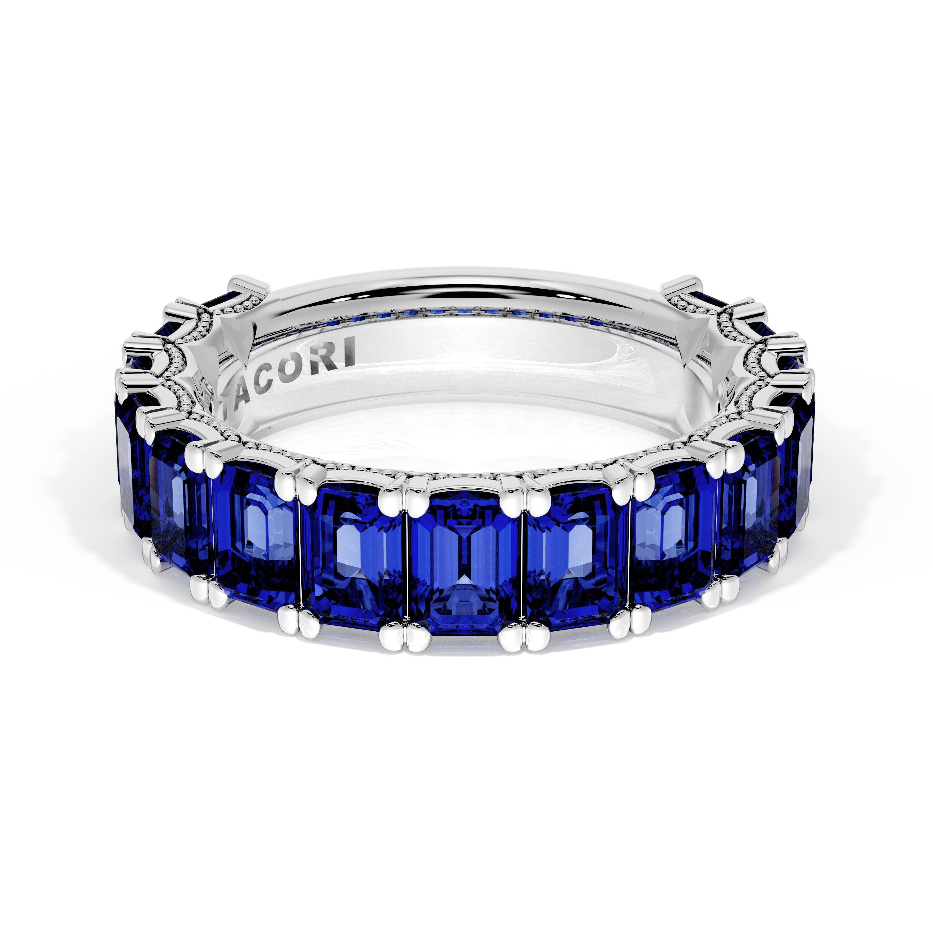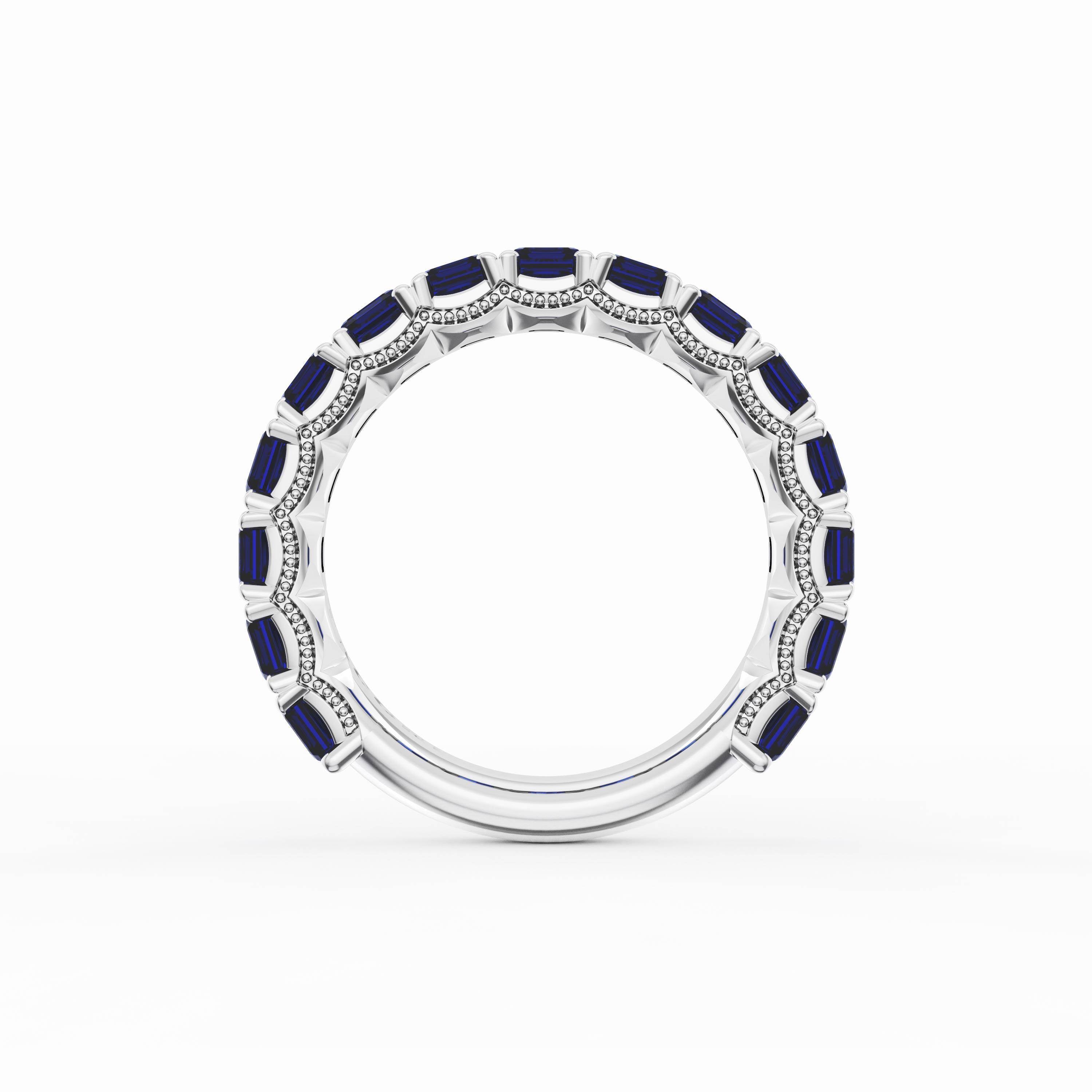 Emerald cut blue sapphires decorate the ceiling of this band and milgrain adds intricate texture to the silhouette.