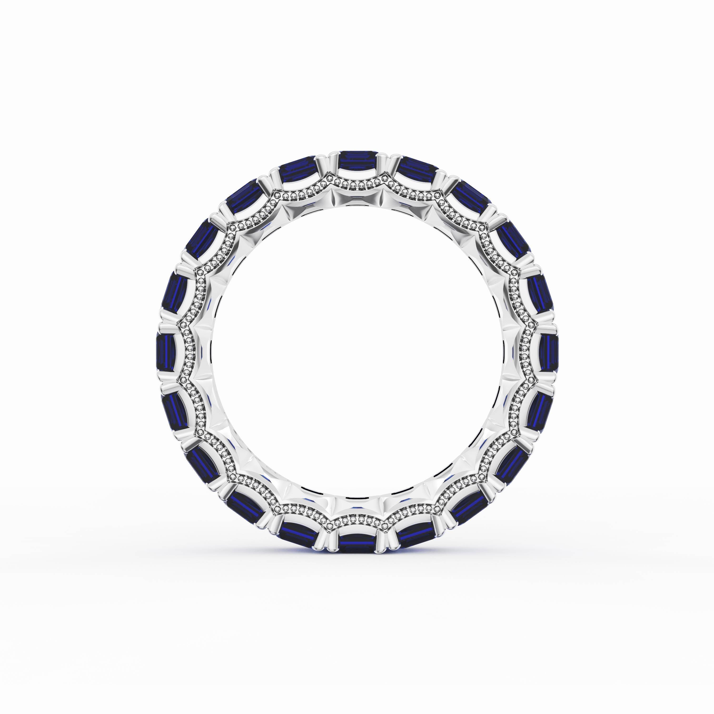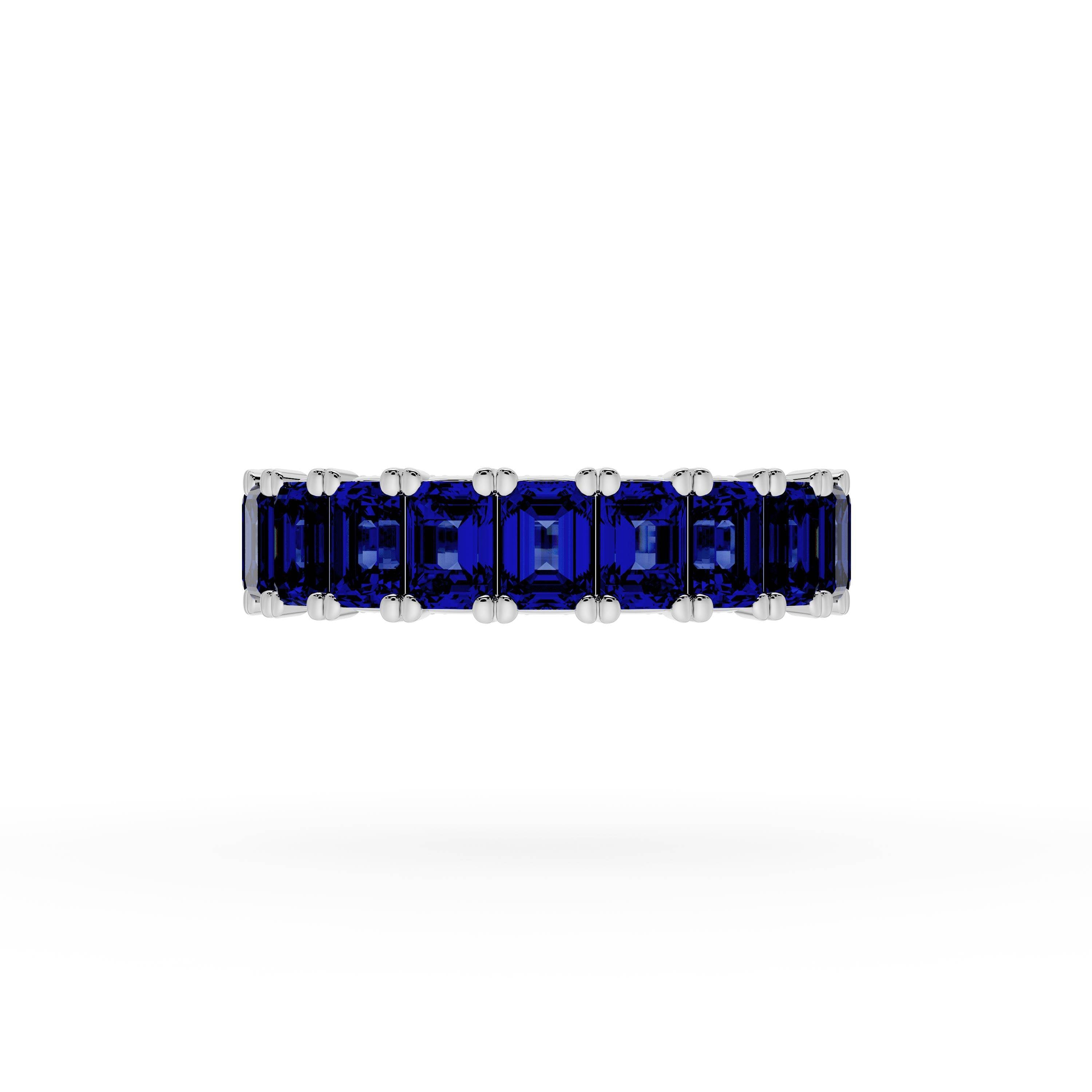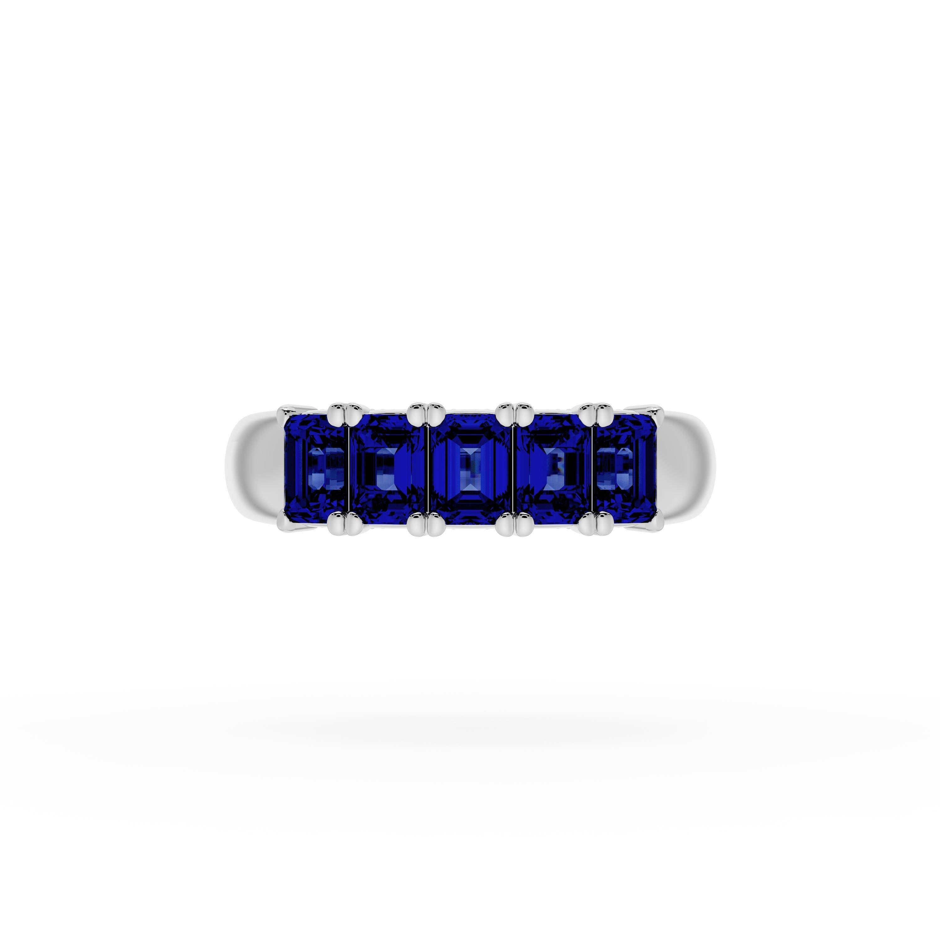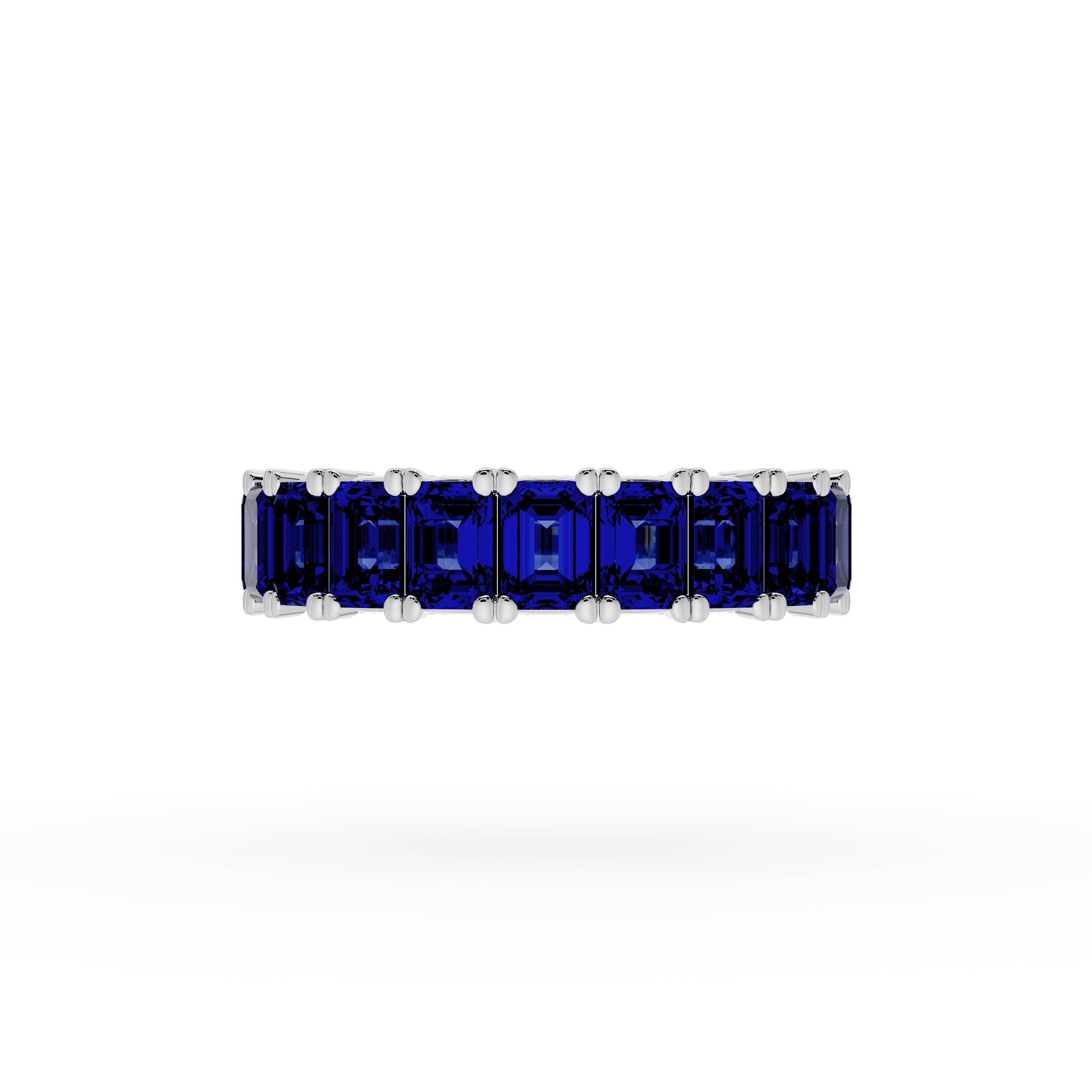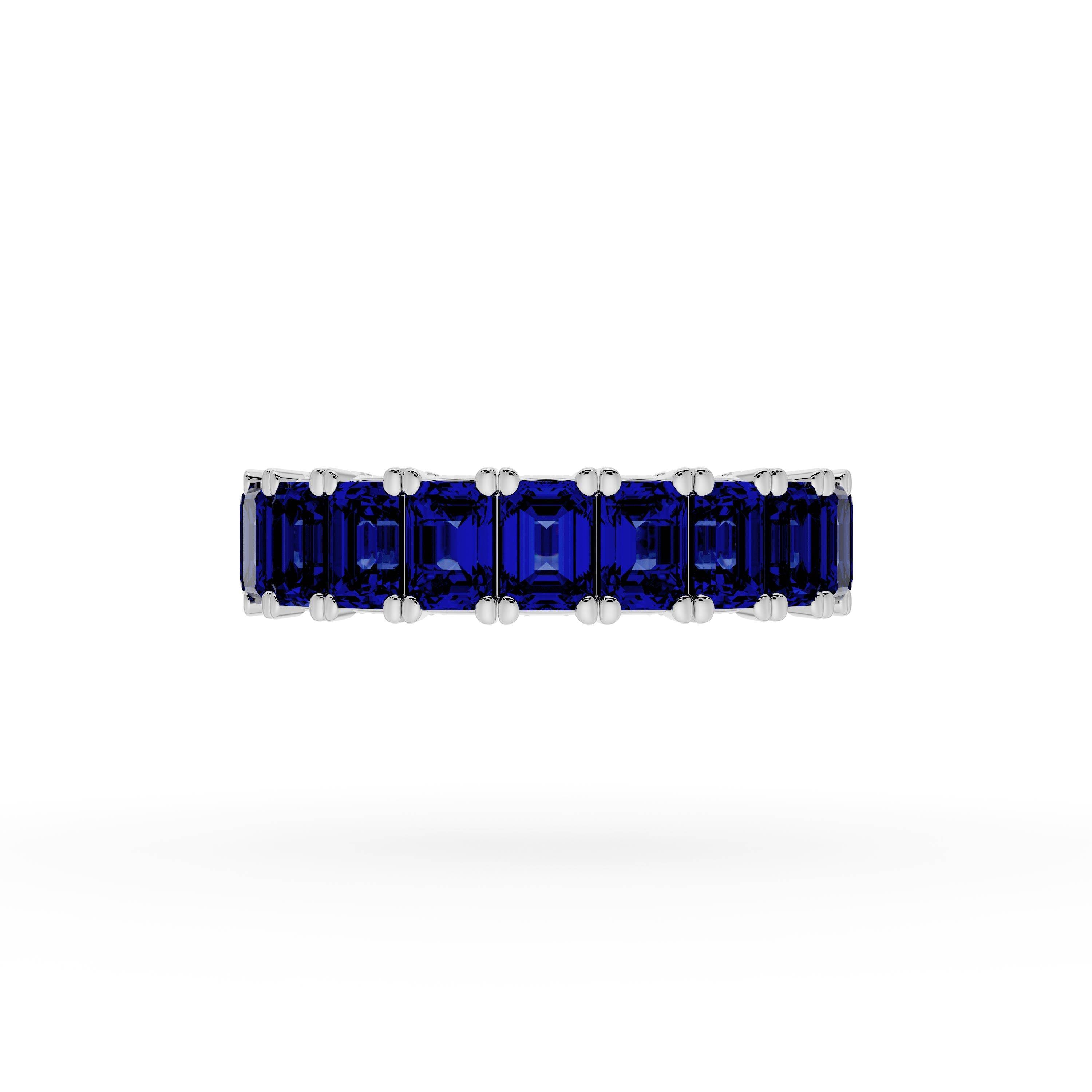 Emerald cut blue sapphires decorate the ceiling of this band and milgrain adds intricate texture to the silhouette.