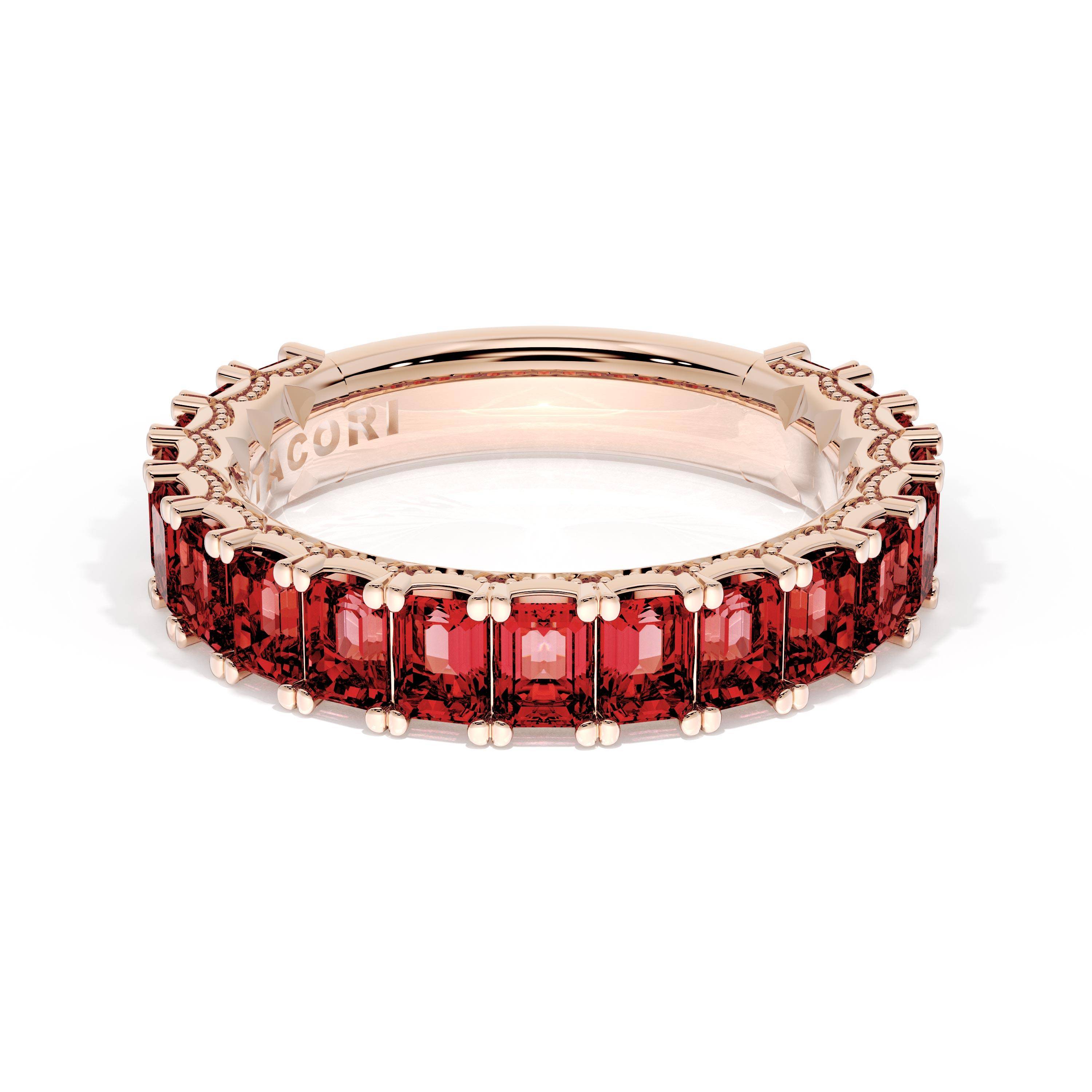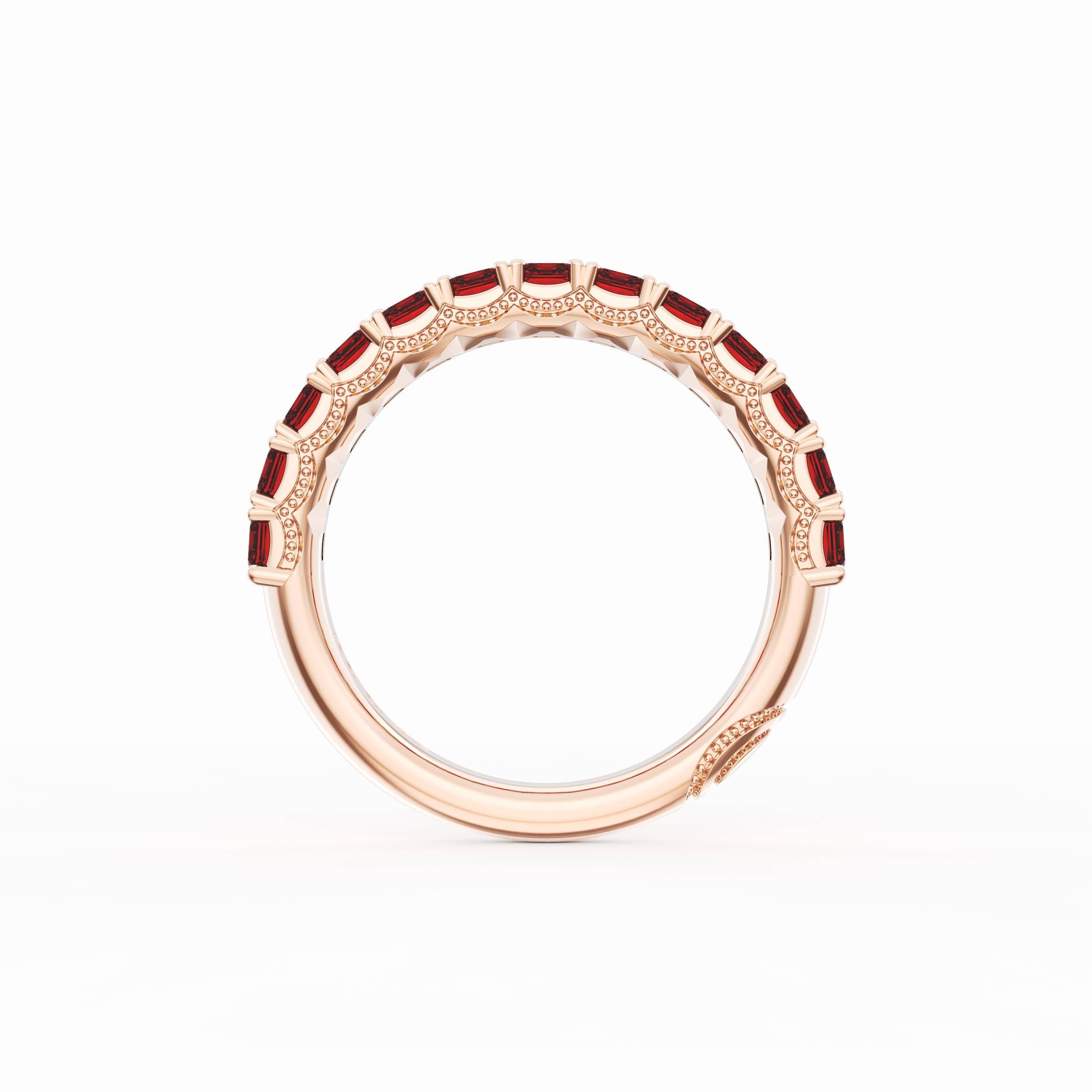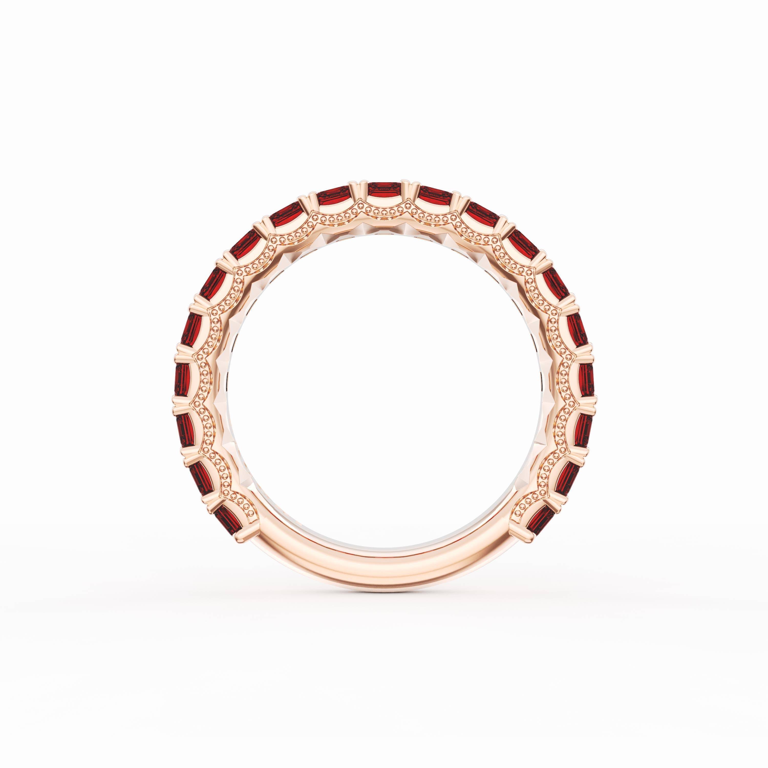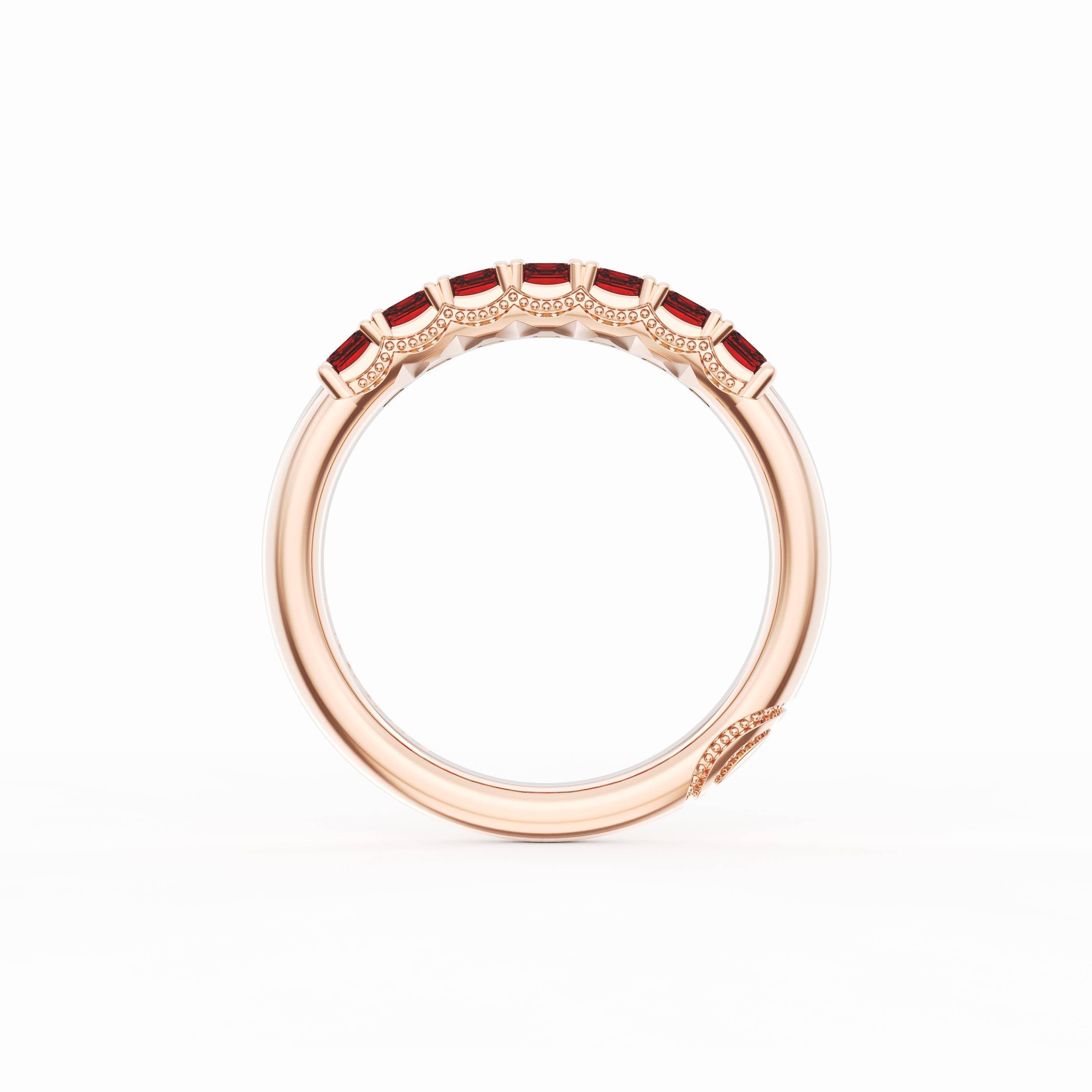 Emerald cut rubies decorate the ceiling of this band and milgrain adds intricate texture to the silhouette.