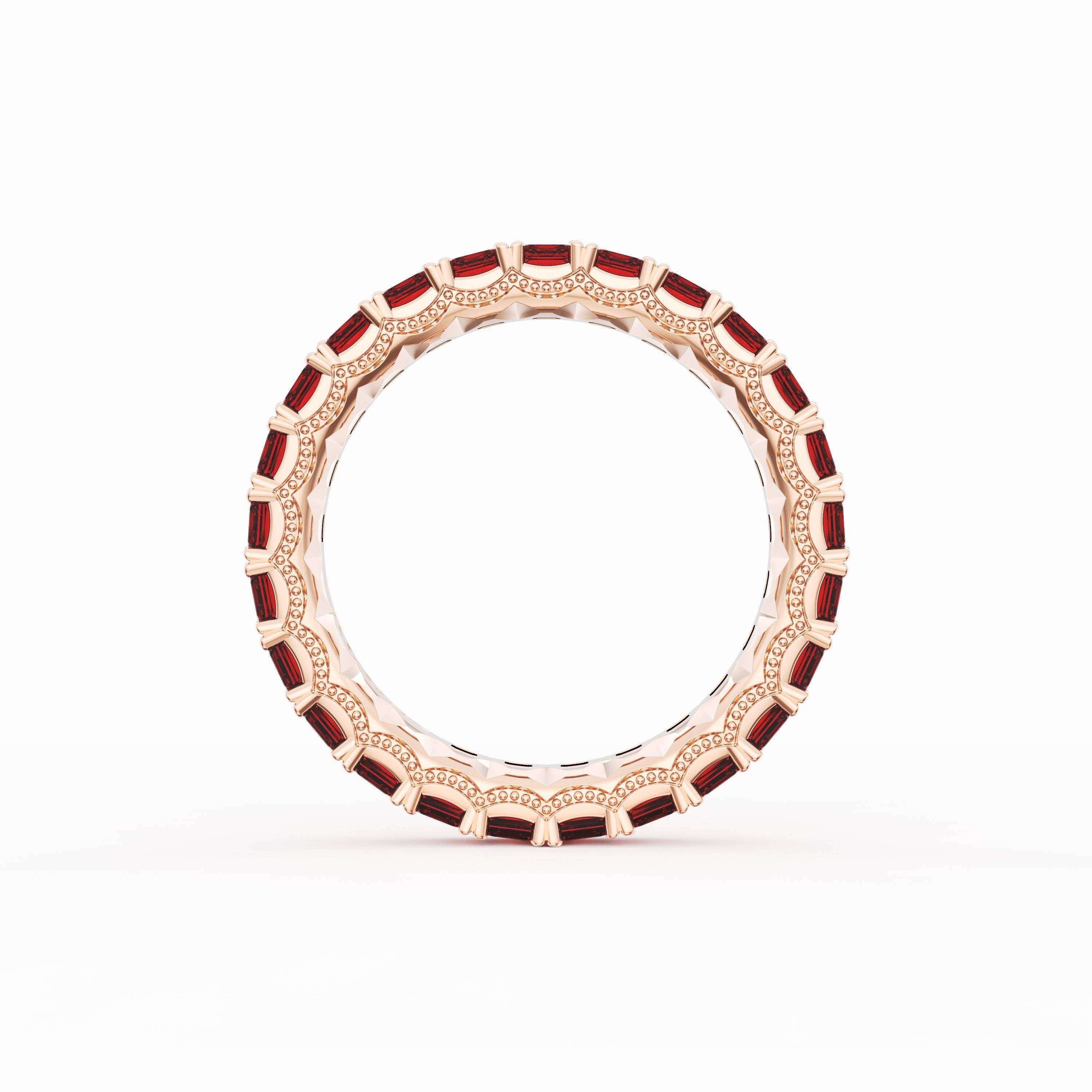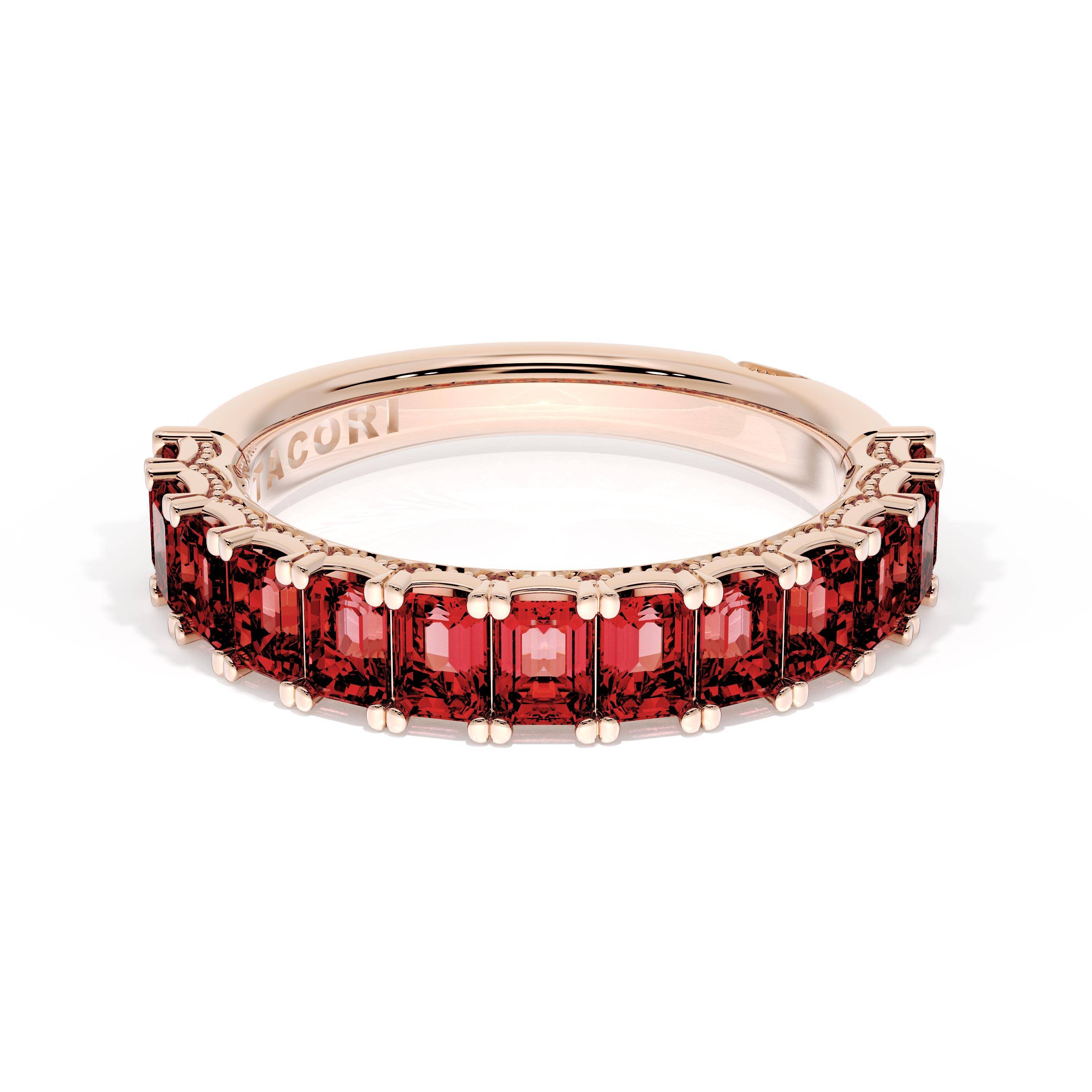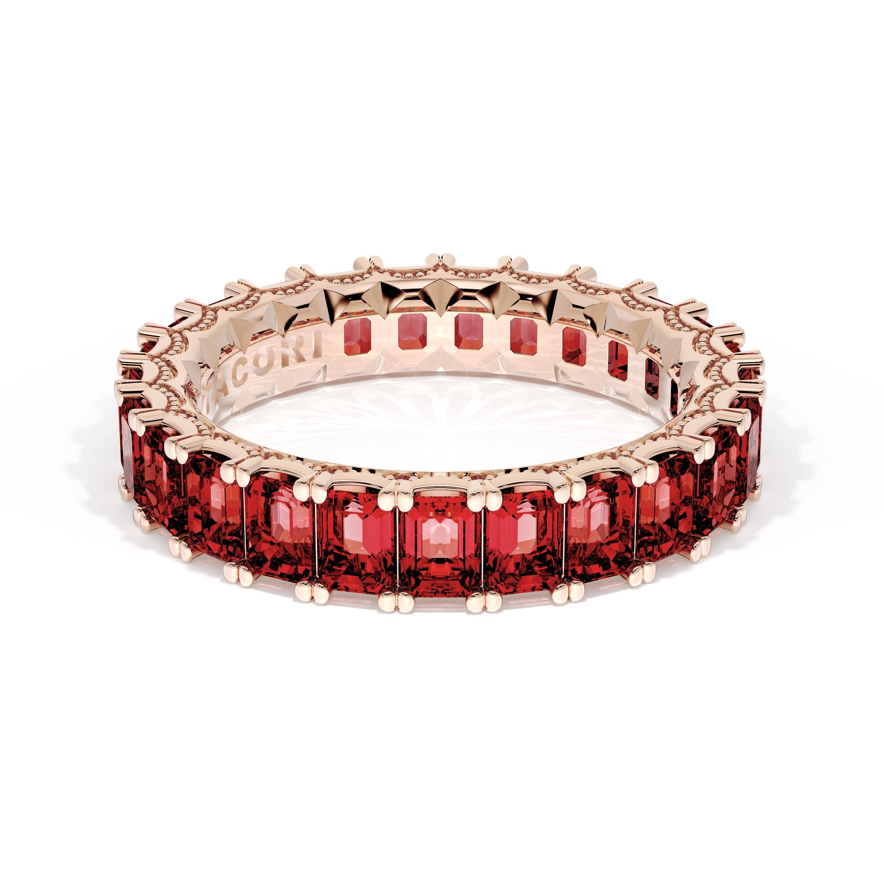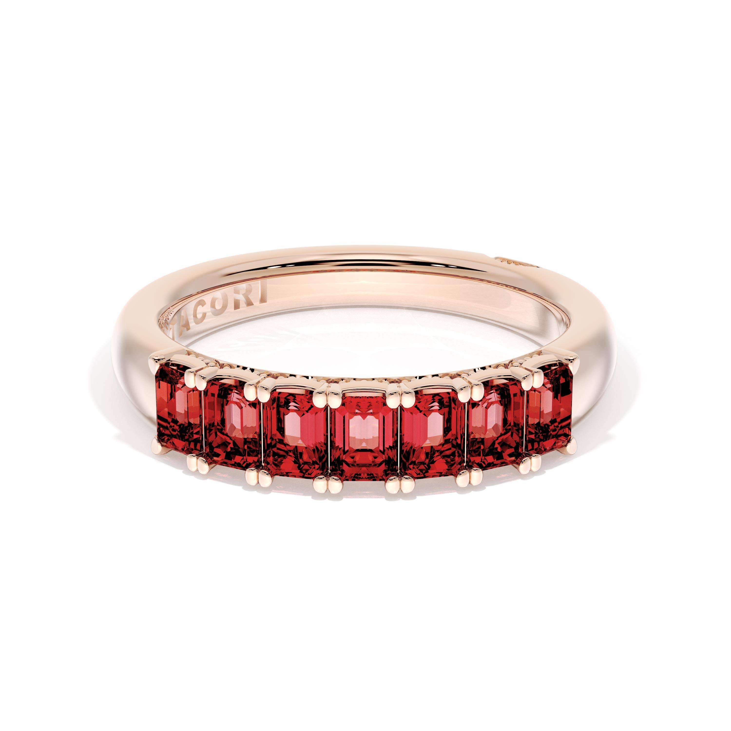 Emerald cut rubies decorate the ceiling of this band and milgrain adds intricate texture to the silhouette.