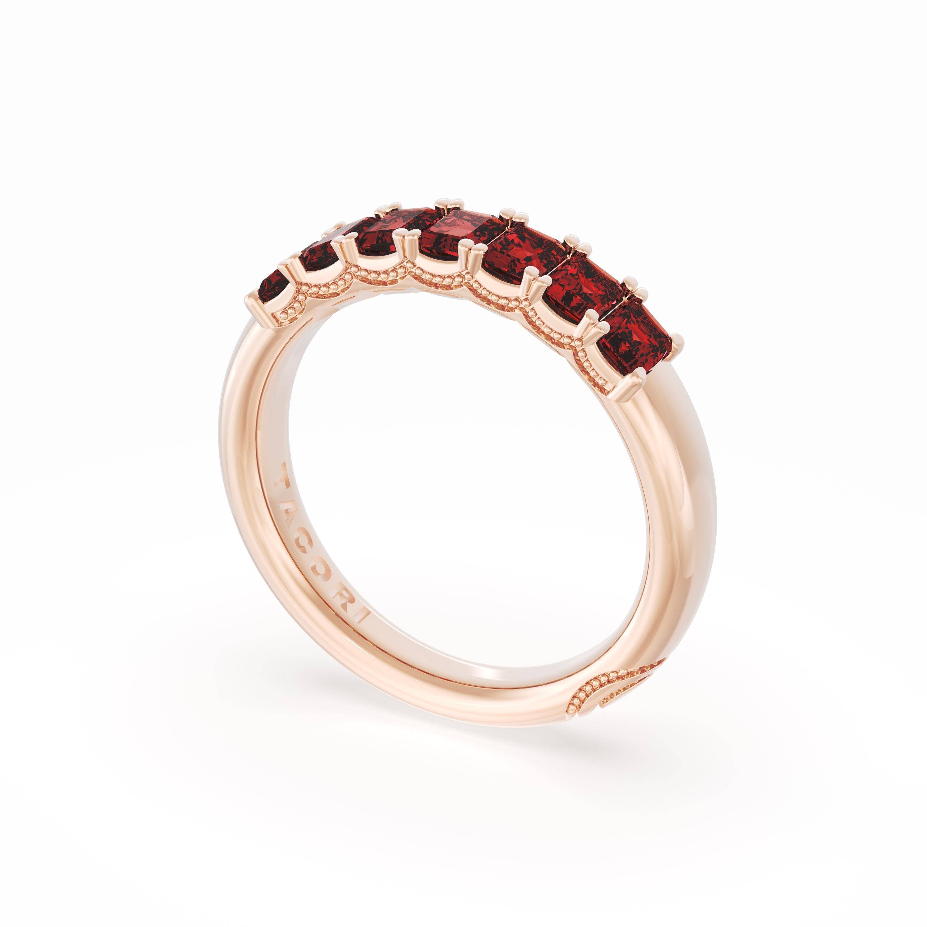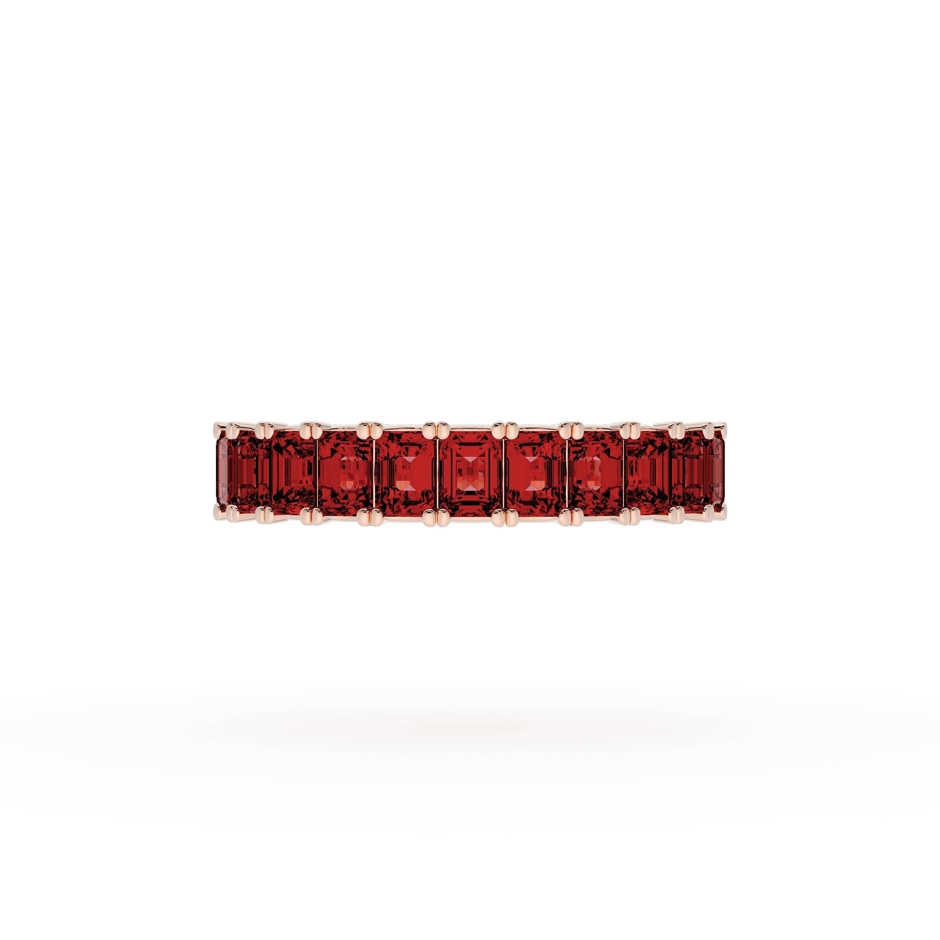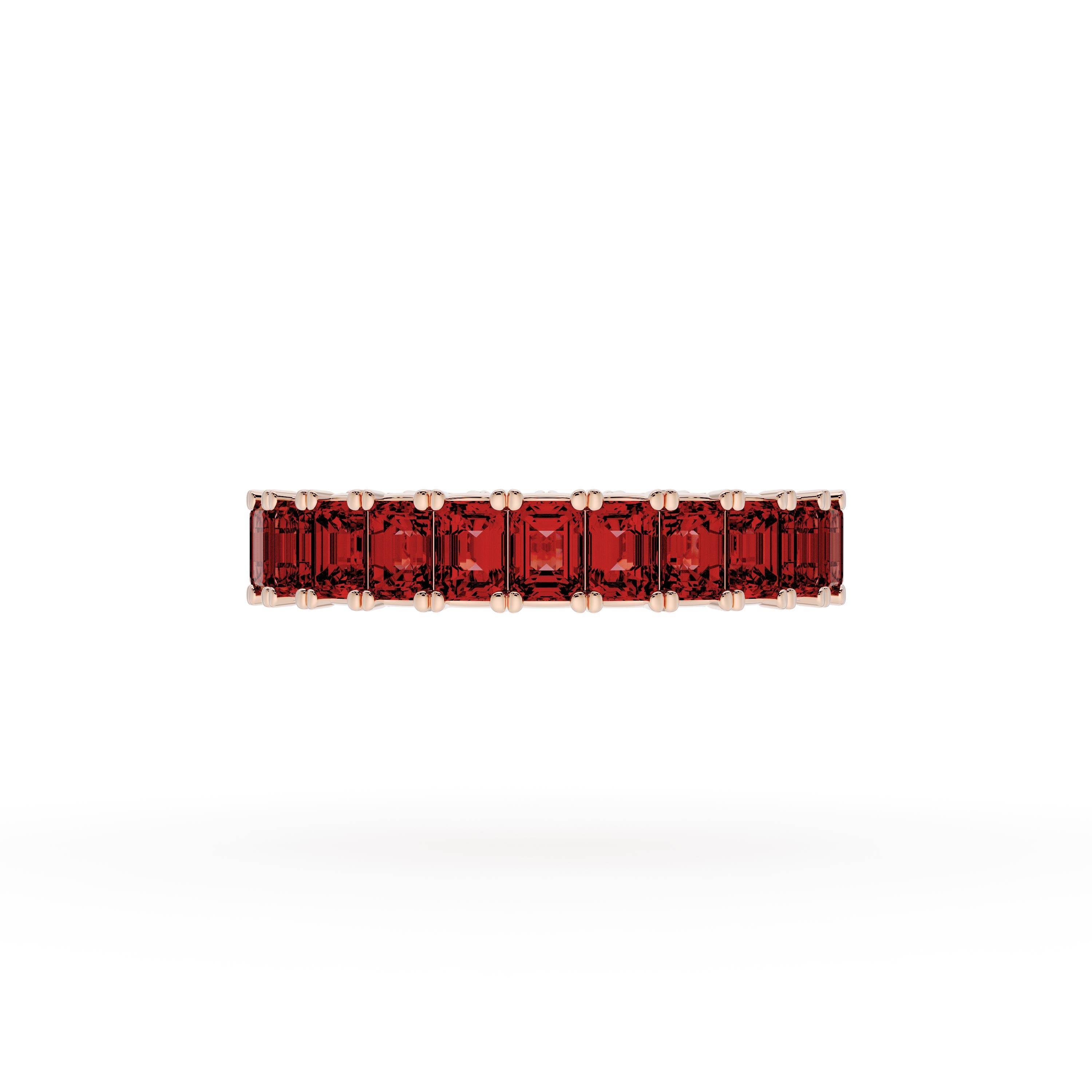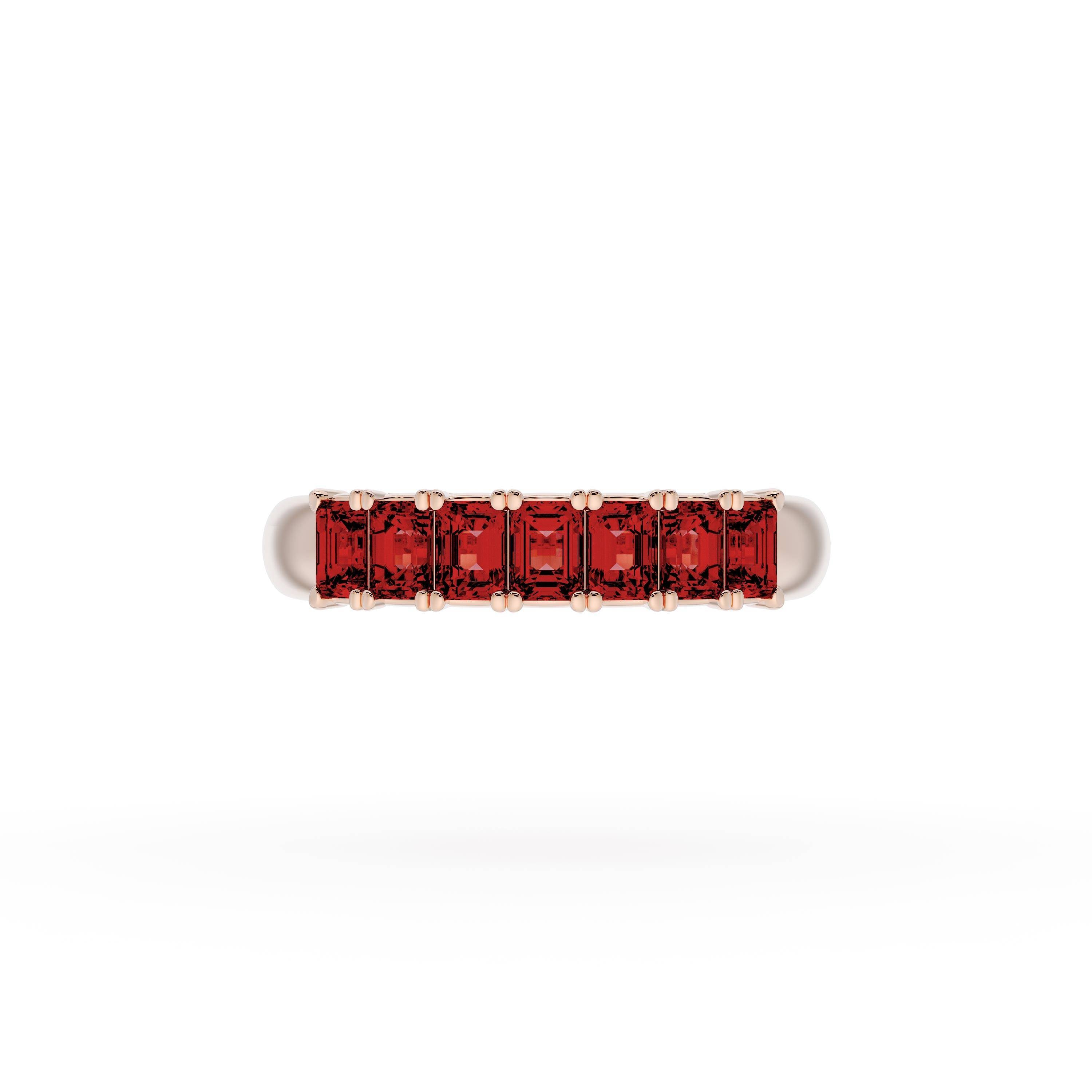 Emerald cut rubies decorate the ceiling of this band and milgrain adds intricate texture to the silhouette.