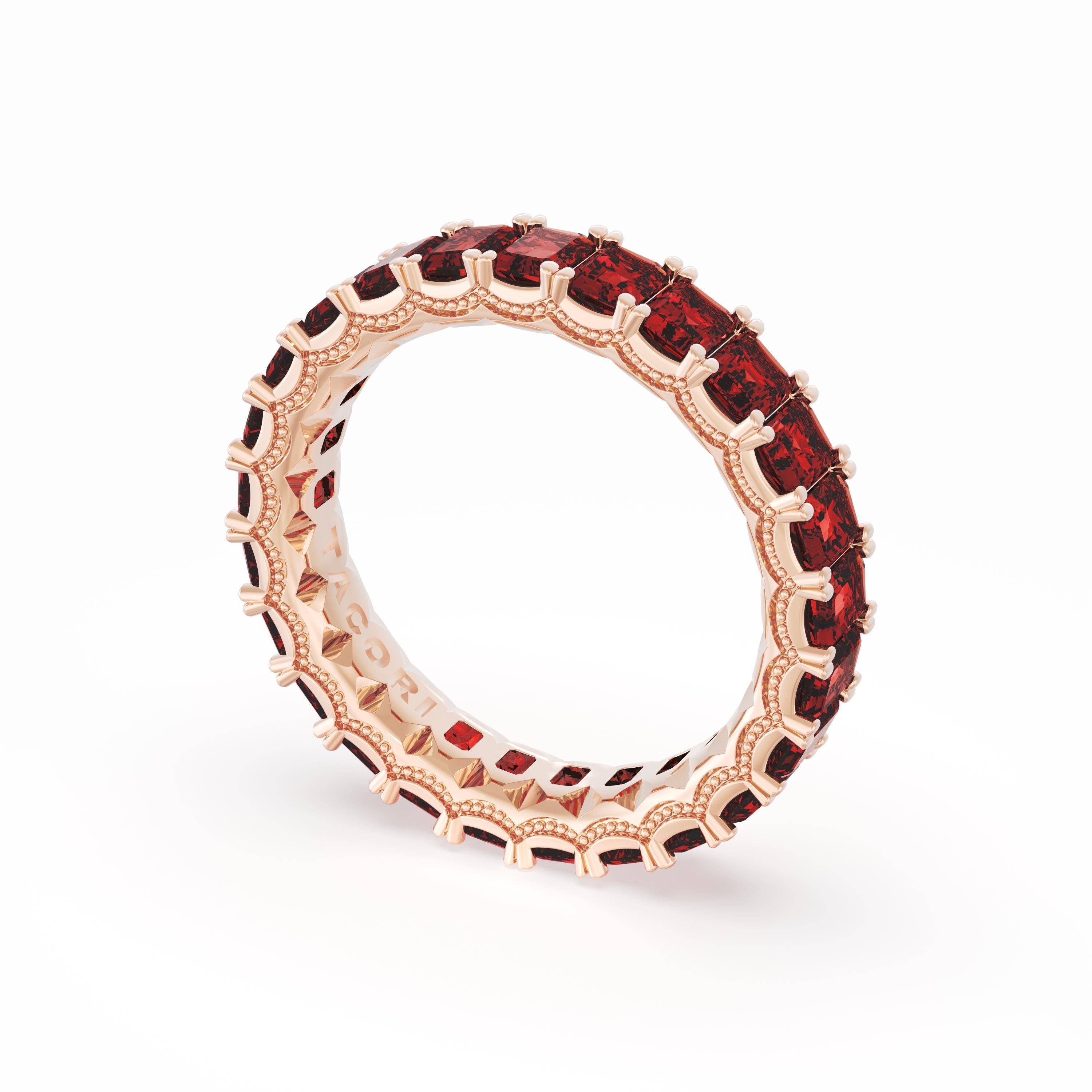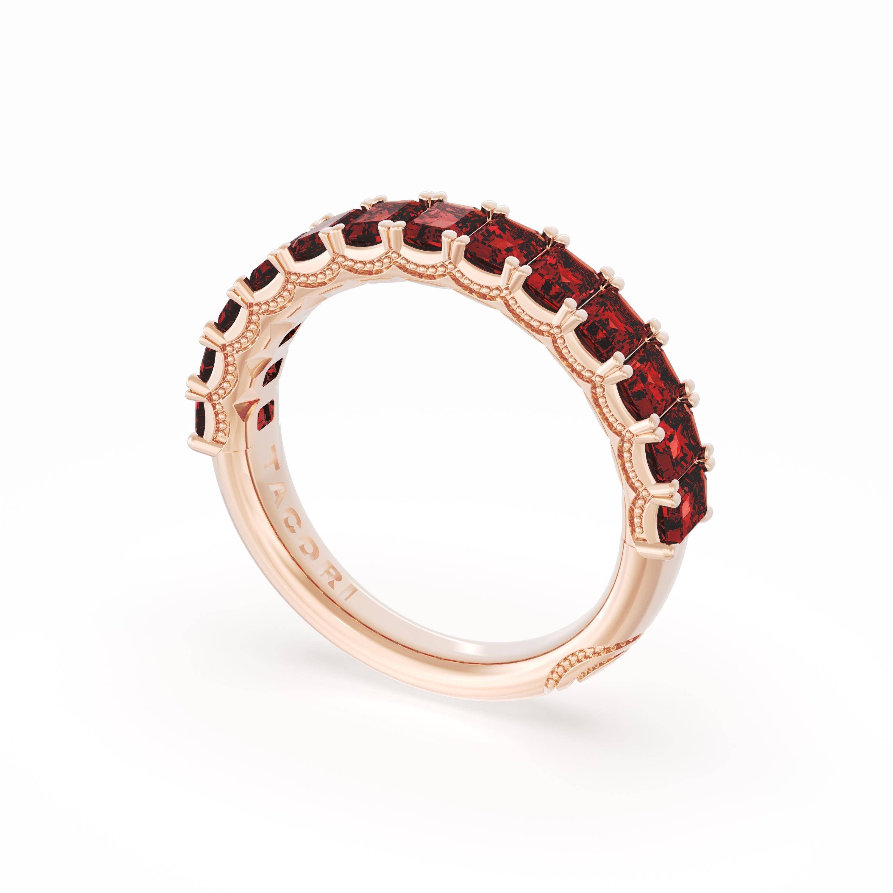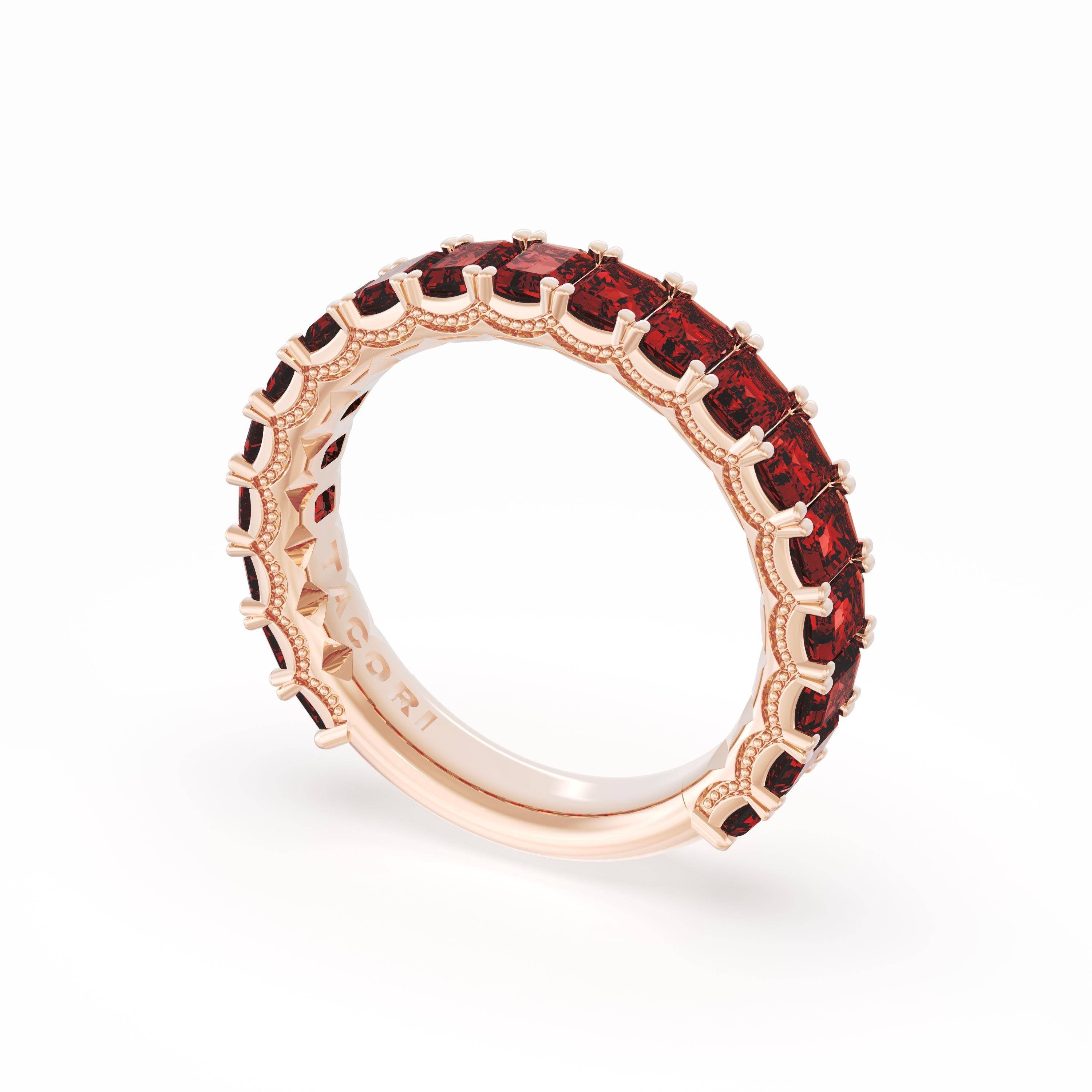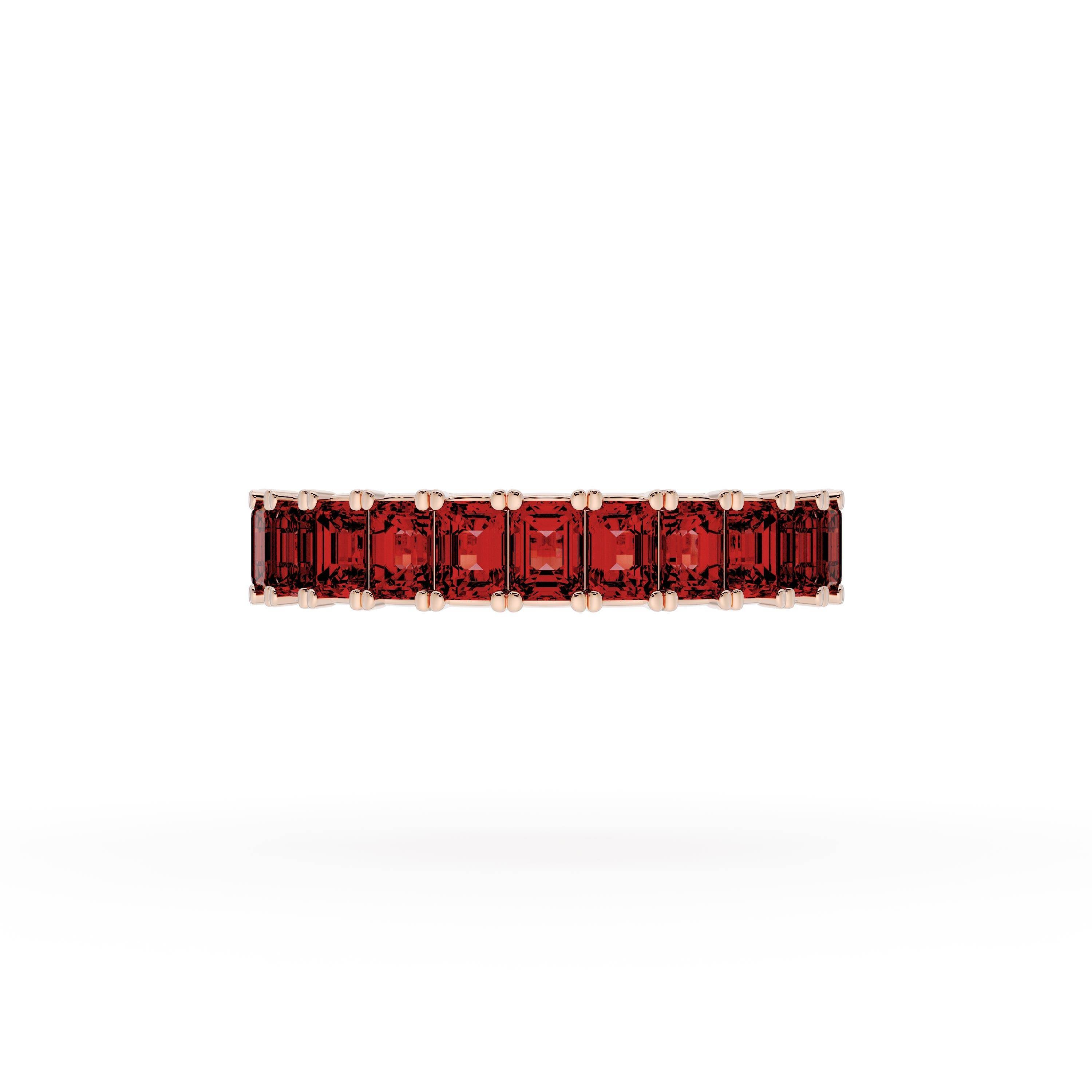 Emerald cut rubies decorate the ceiling of this band and milgrain adds intricate texture to the silhouette.