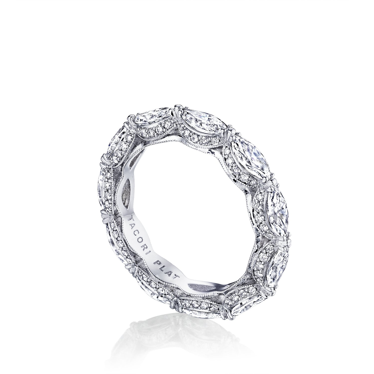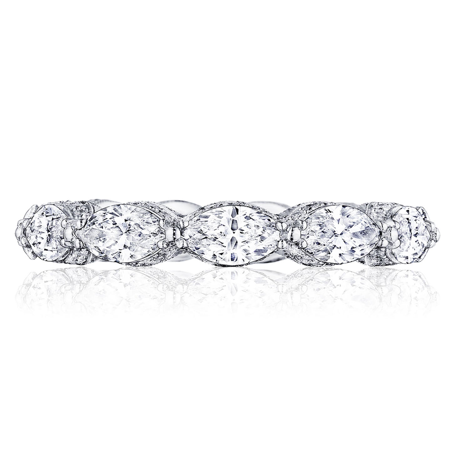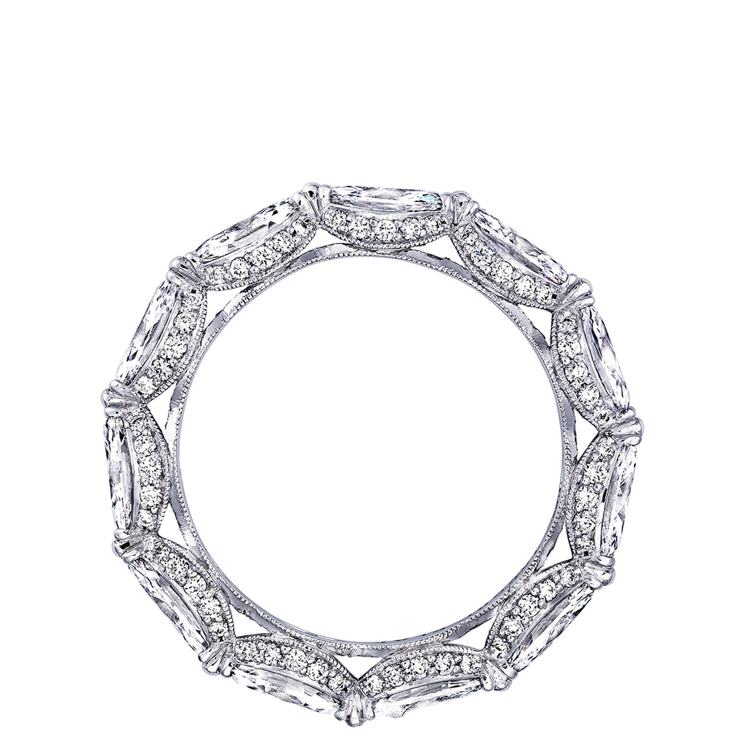 An eternity of marquise-shape diamonds decorate the exterior of the ring, while diamond-studded Classic Crescent fabric illuminates the inner face silhoutte and contributes windows of light.