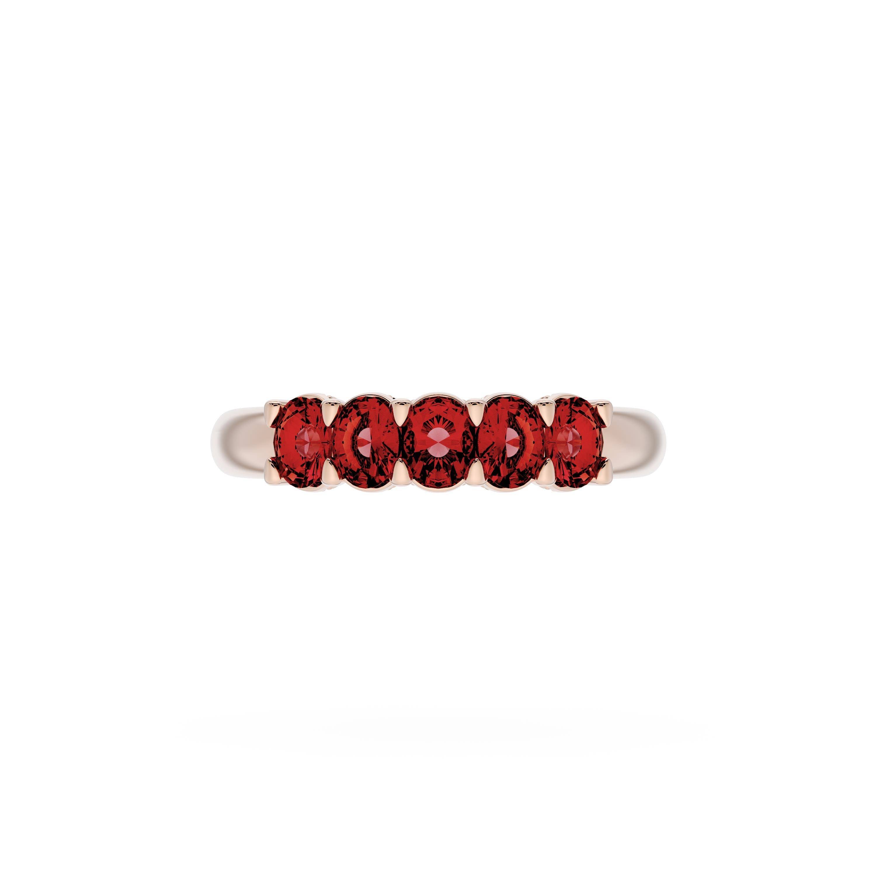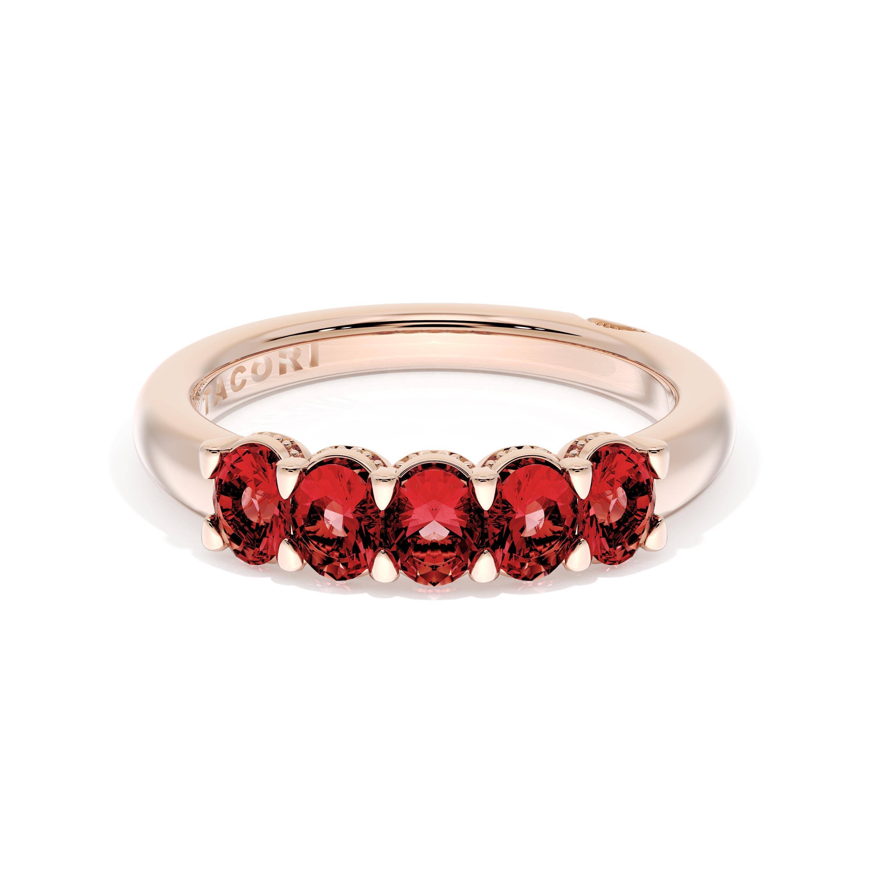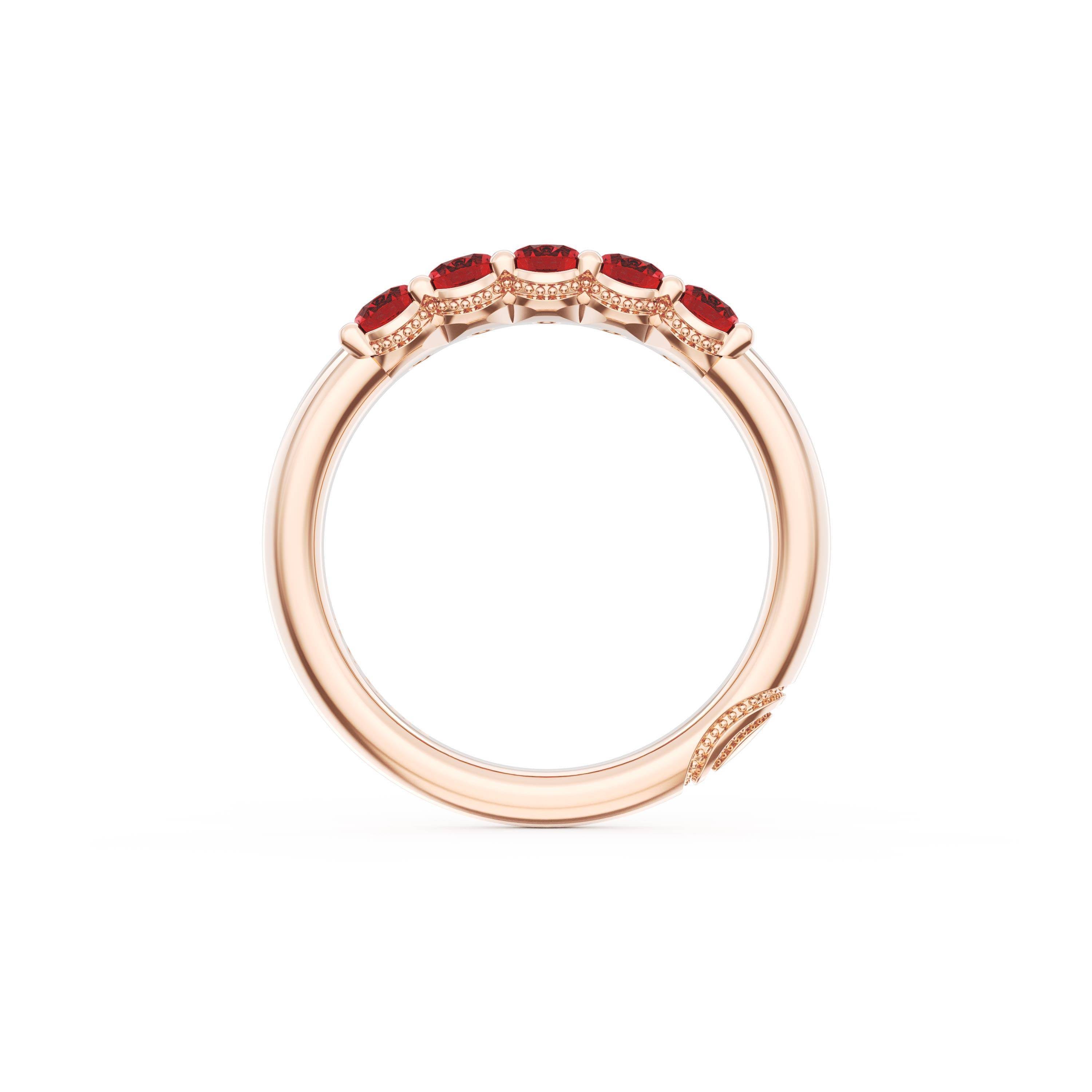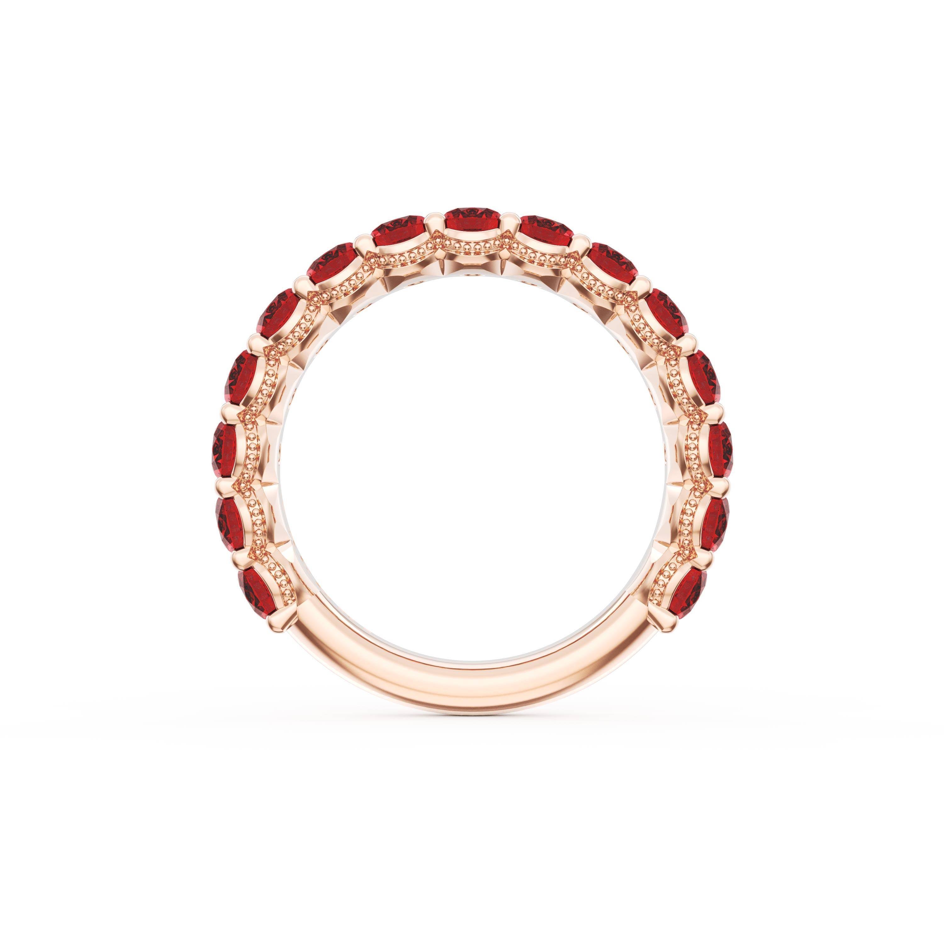 Oval cut rubies decorate the ceiling of this band and milgrain adds intricate texture to the silhouette.