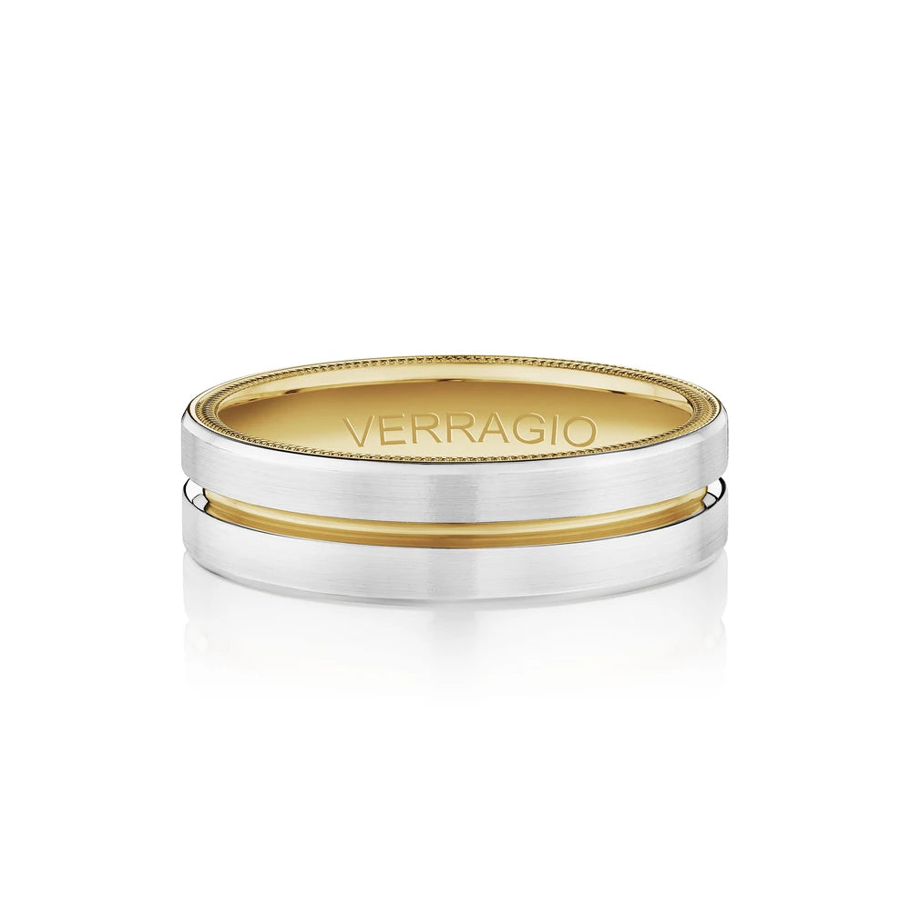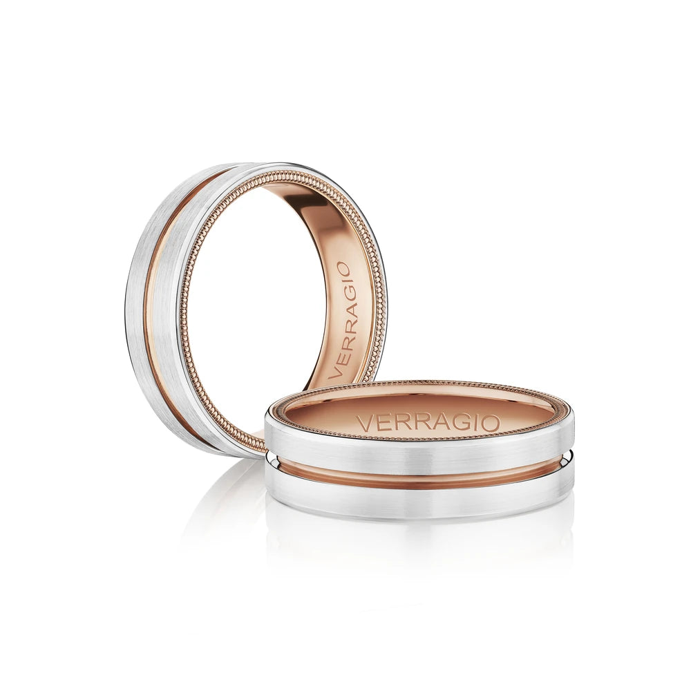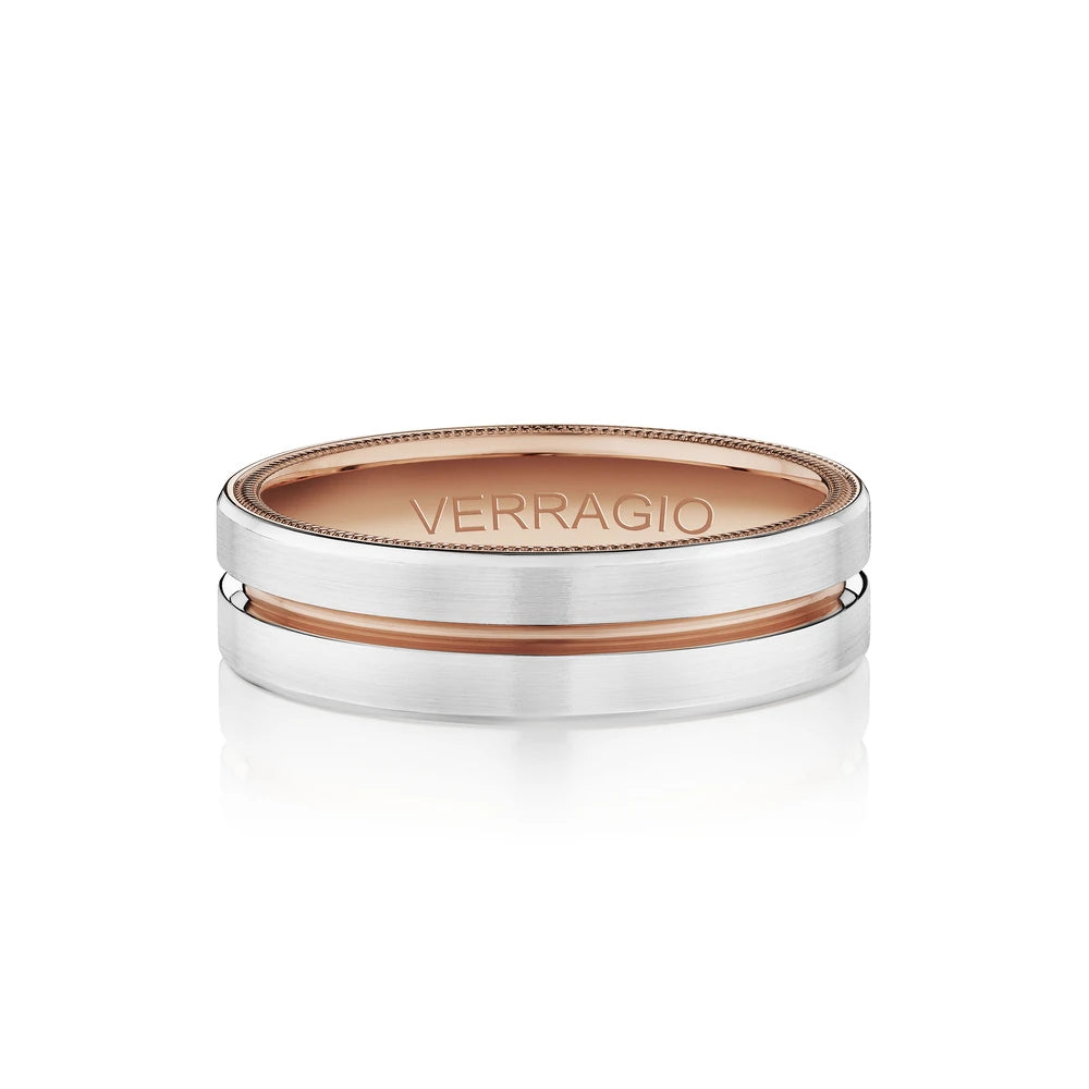 VW-6121 is our stylish 6MM width men's band with a matte finish. Etched through the heart of the ring runs a singular rose gold groove enhanced by the interior detailing of Verragio's signature rose gold beading.