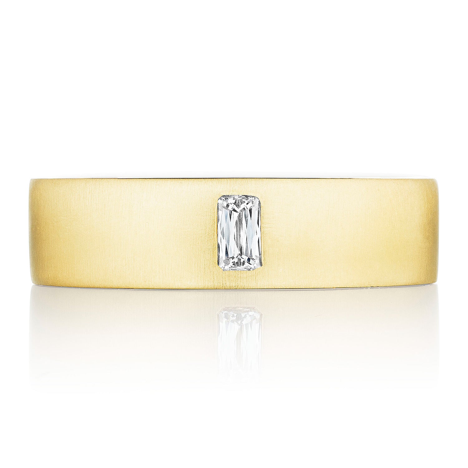 A satin exterior is accented with a Tacori-exclusive triple-cut diamond, bezel-set into the flat-top band. This simple but elegant design is complemented by full sculpted crescent detail and a soft-comfort fit interior.