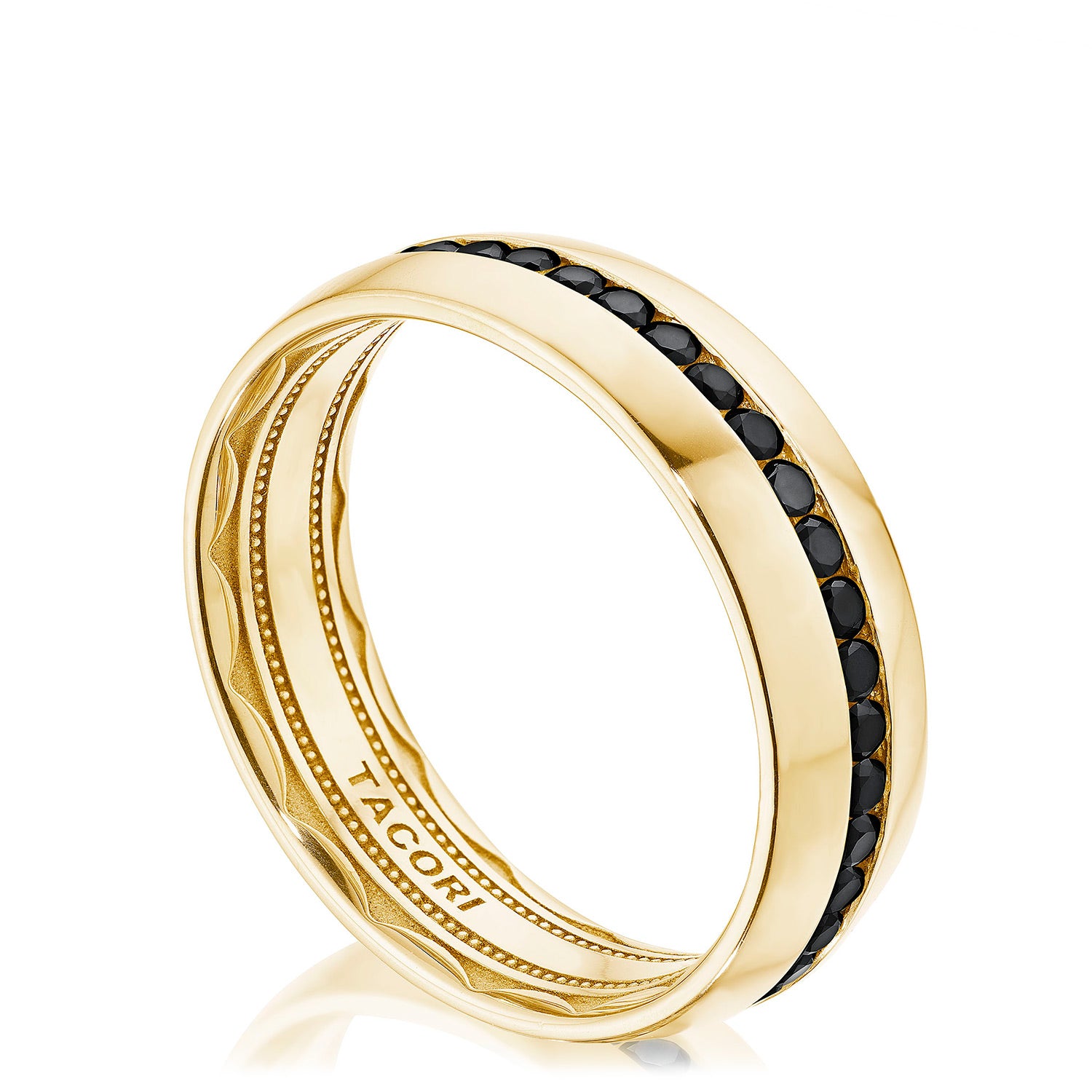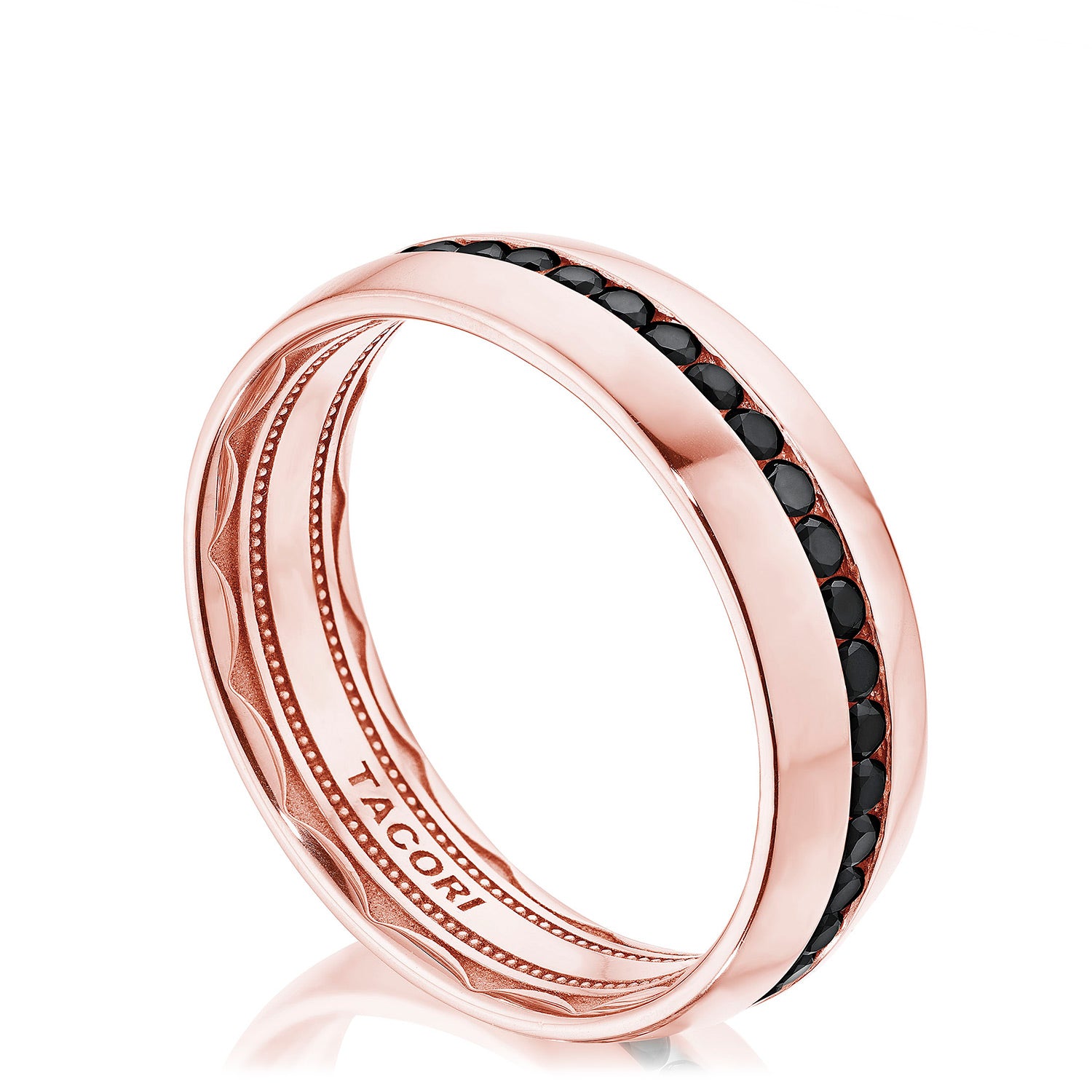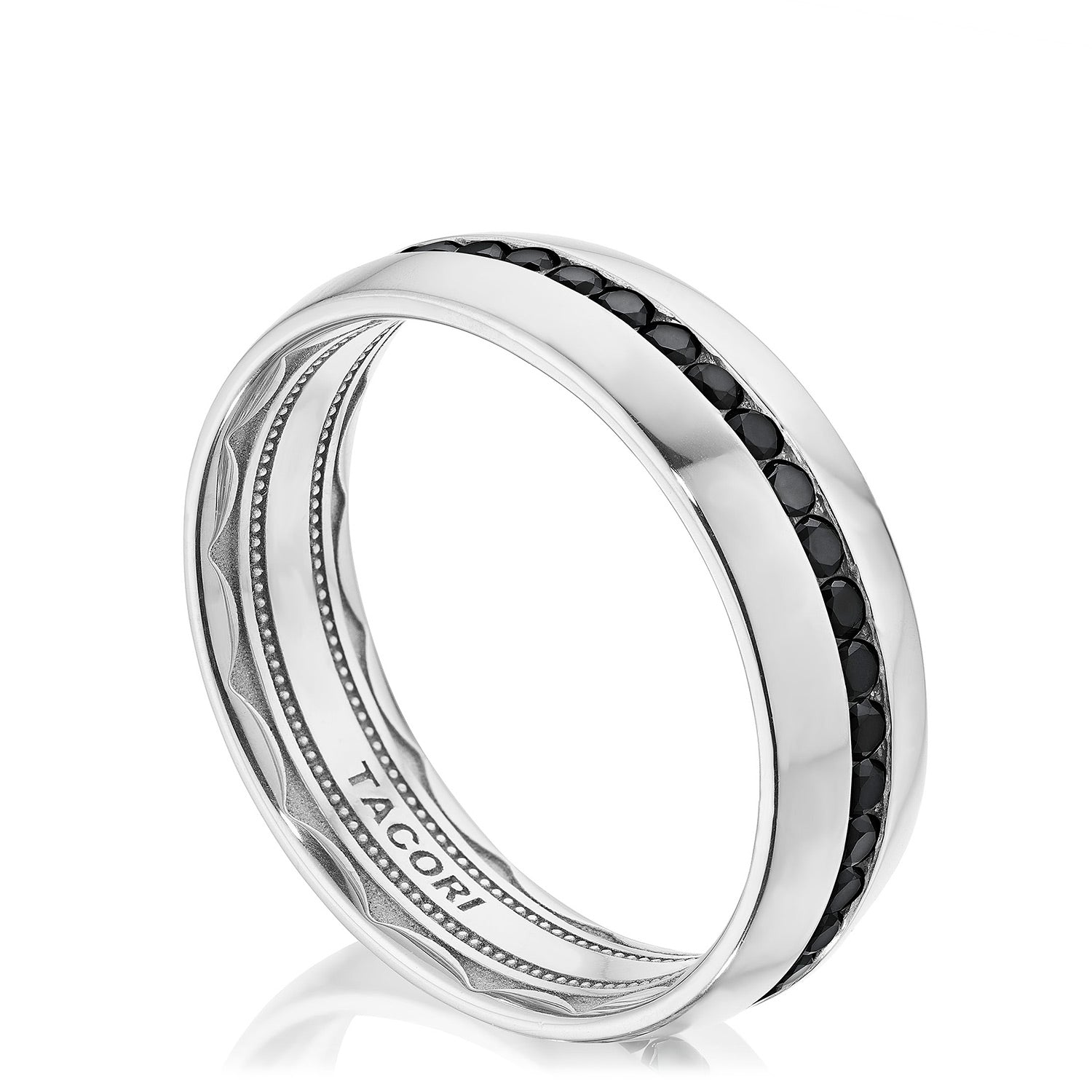The high polish, softly-rounded exterior of this wedding band is encircled with eye-catching and expertly channel-set black diamonds. The inner face of the ring boasts a full sculpted crescent detail with a soft-comfort fit for all-day wearability.
