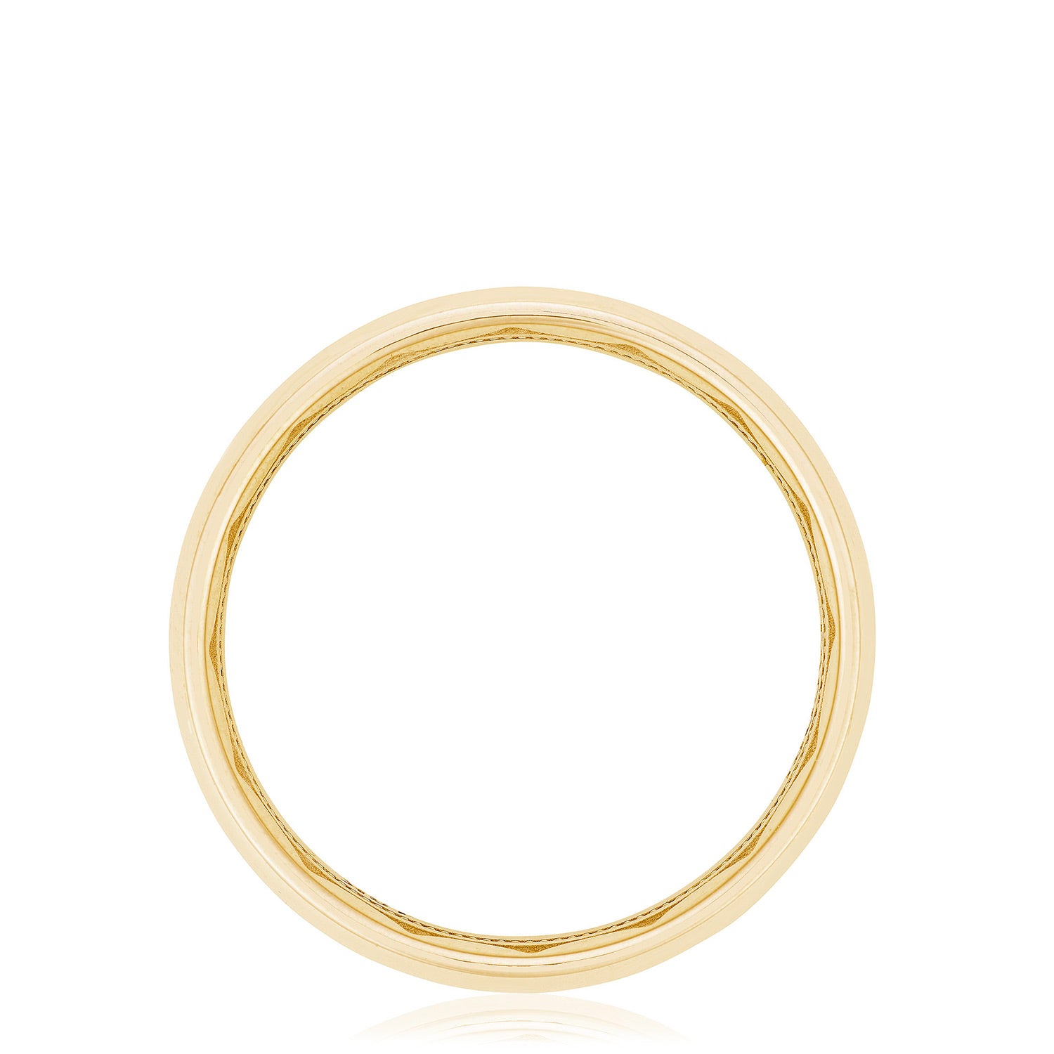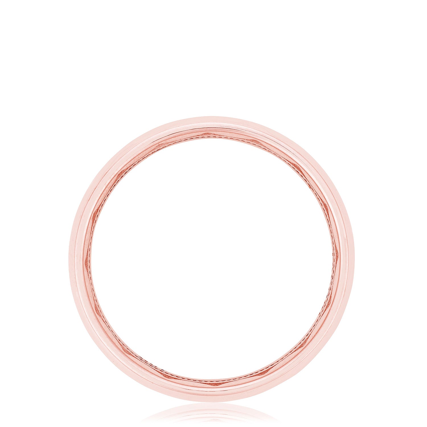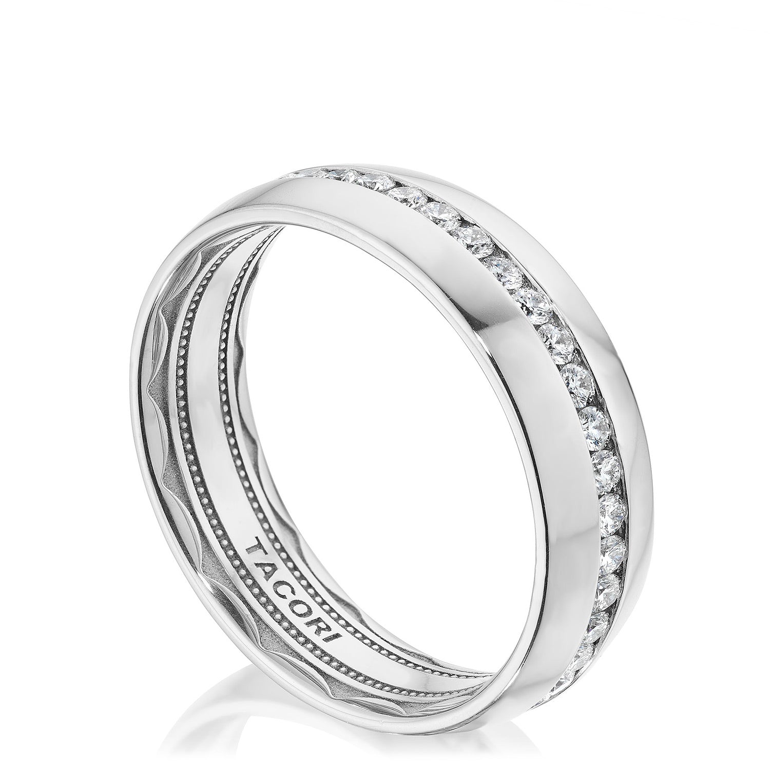 The high polish, softly-rounded exterior of this wedding band is encircled with eye-catching and expertly channel-set diamonds. The inner face of the ring boasts a full sculpted crescent detail with a soft-comfort fit for all-day wearability.