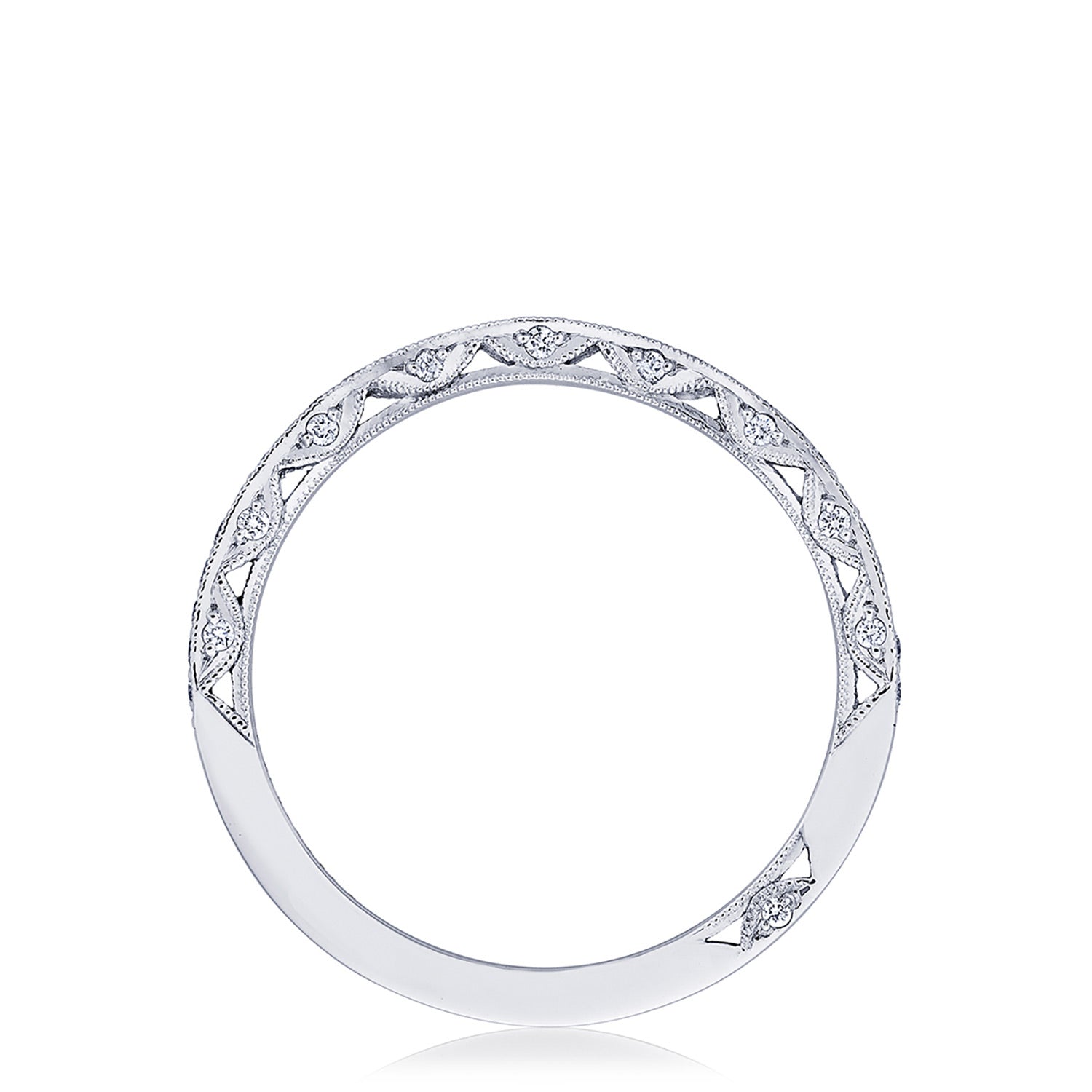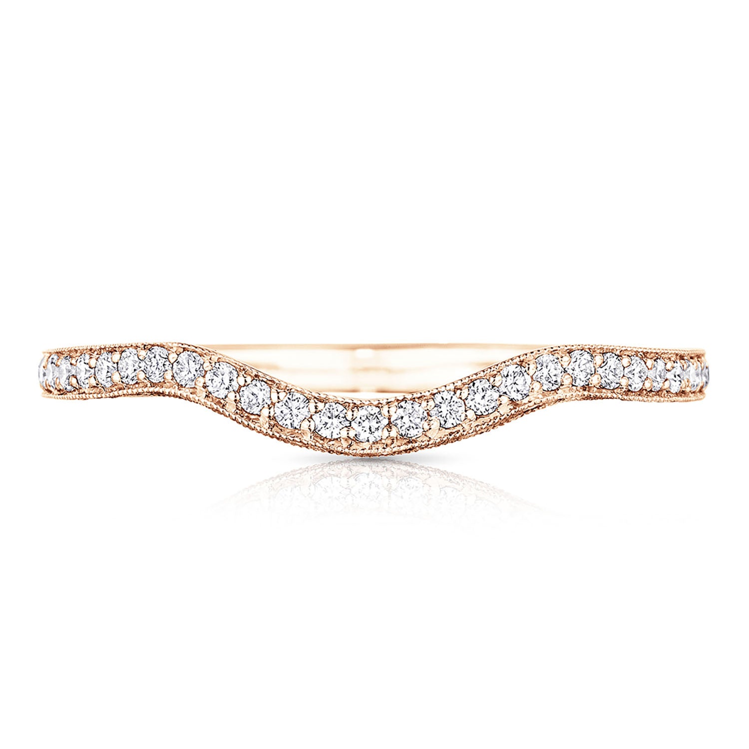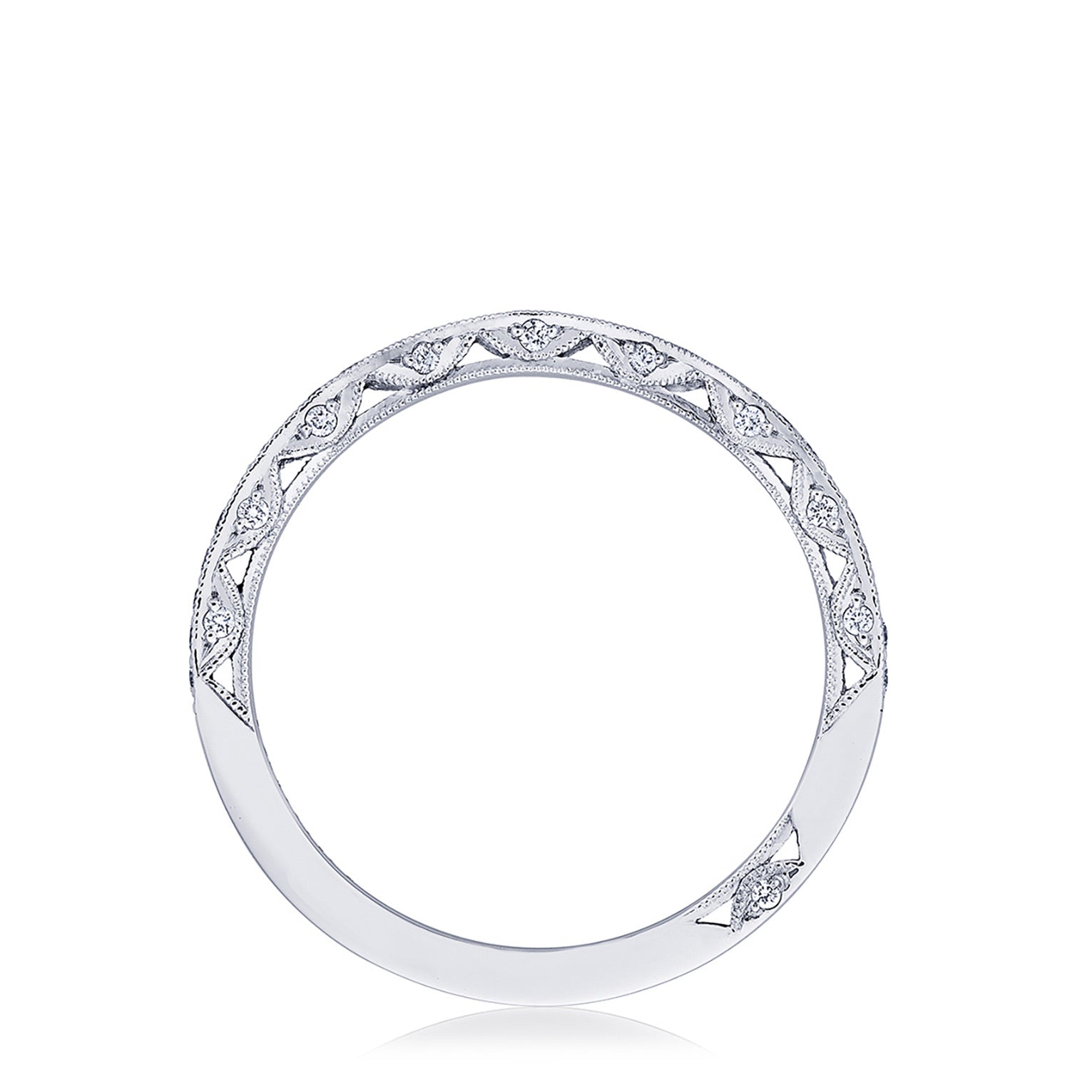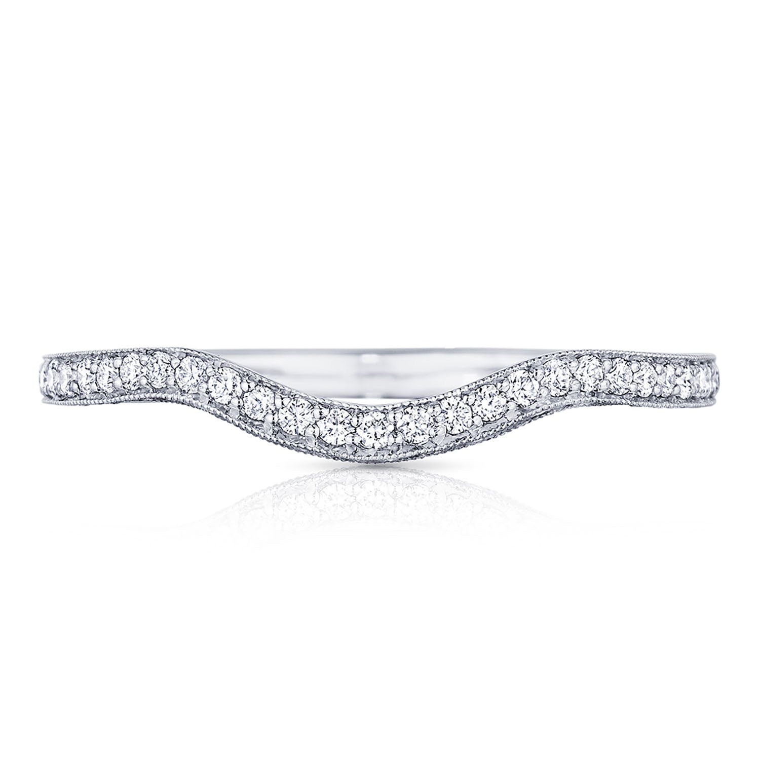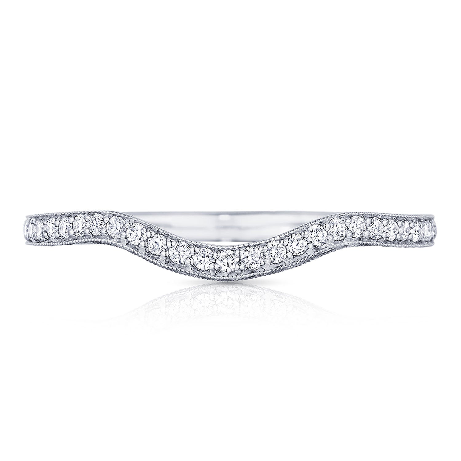 In this unconventional style, a subtle curve is visible from the aerial perspective. Pave-set diamonds decorate the ceiling of the band, while diamond-studded Classic Crescent fabric adds radiance to the inner face silhouette.