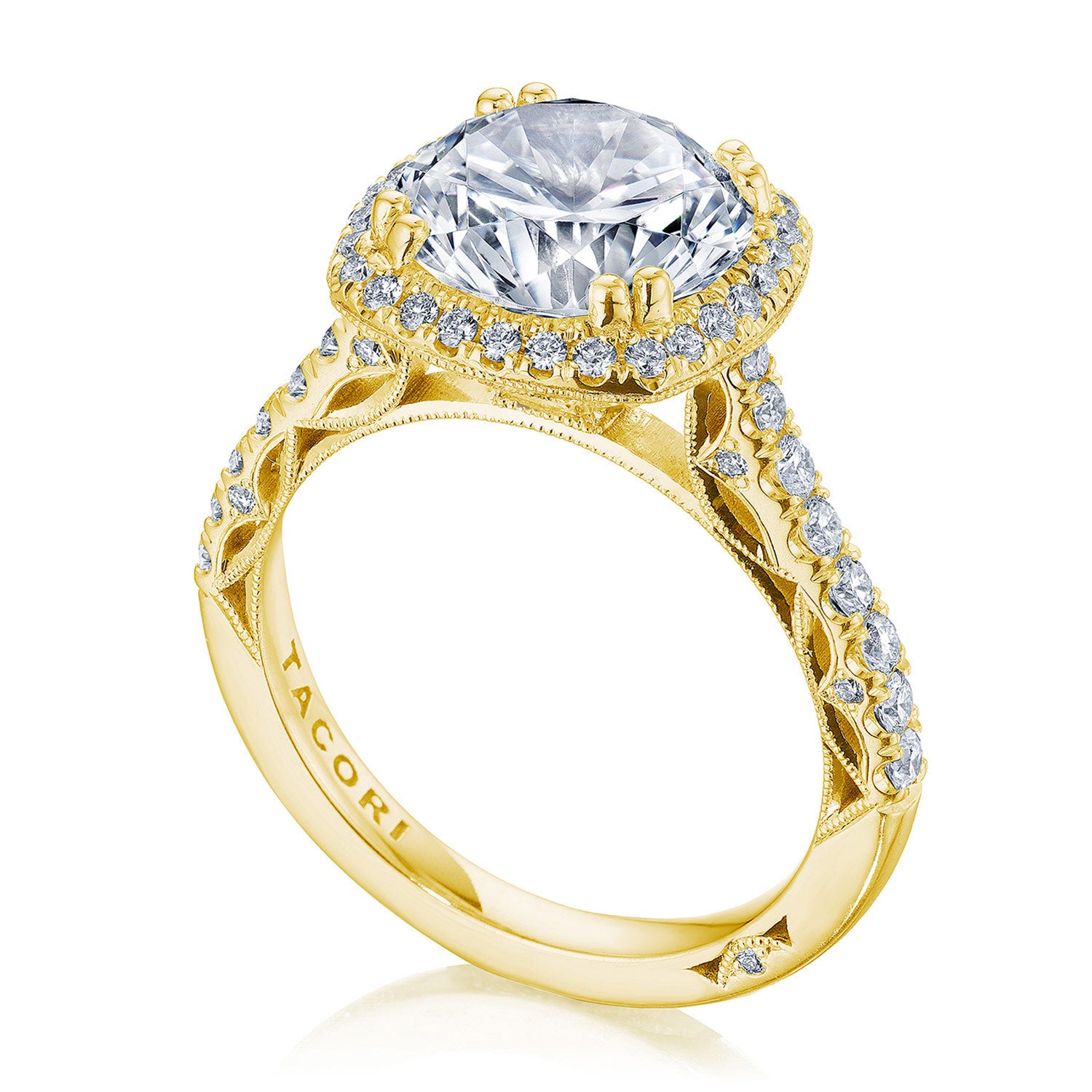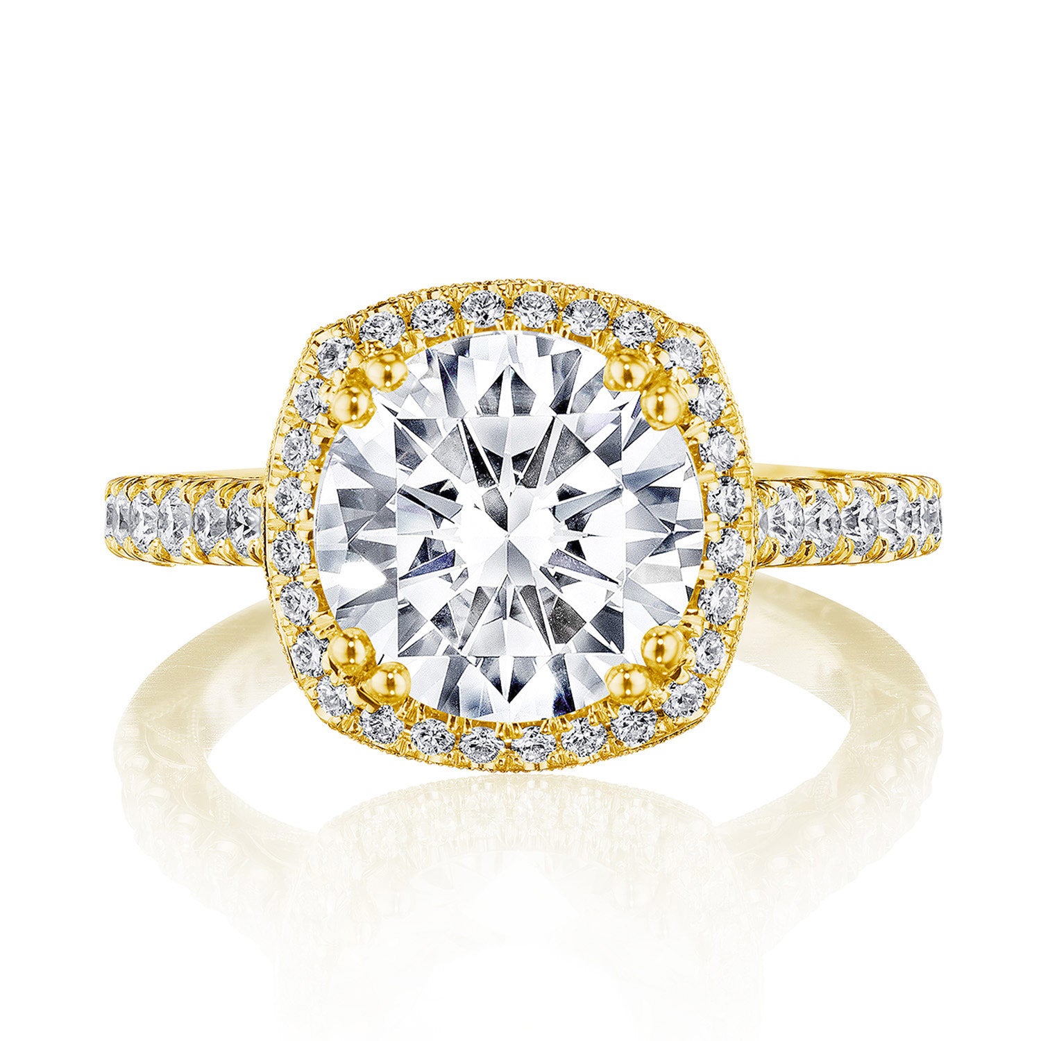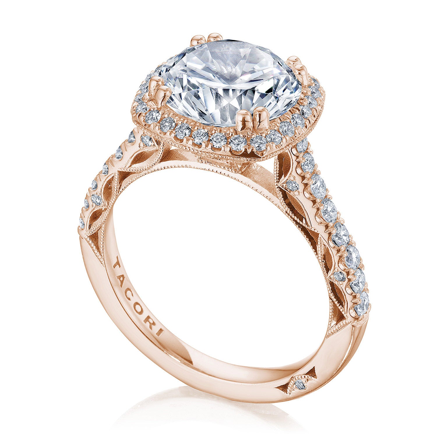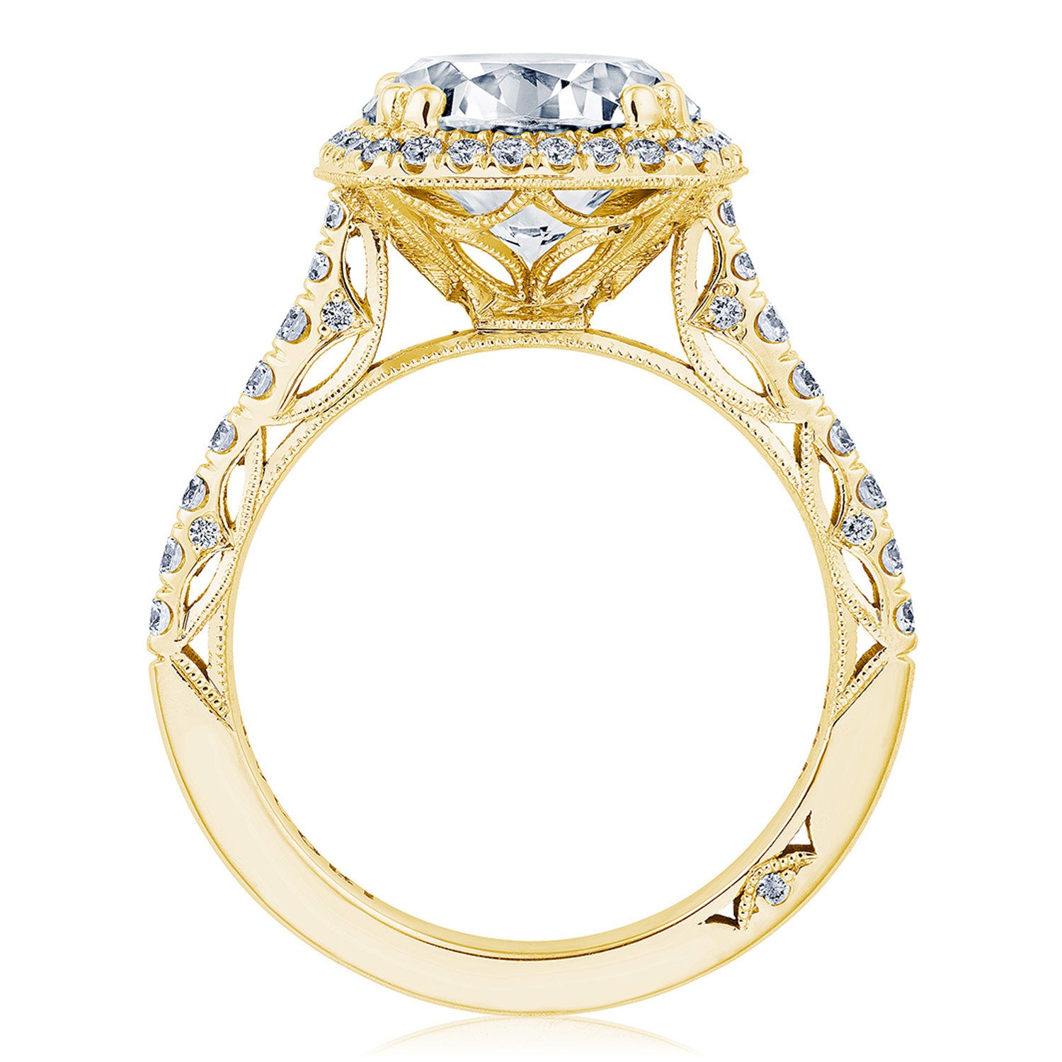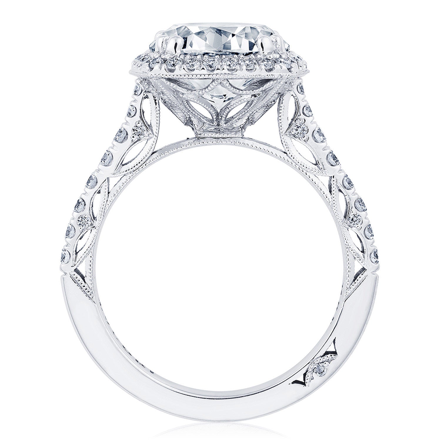 A subtle Spotlight Bloom encircles the center stone, and more brilliance is added by the meticulous French pavé that leads up the ceiling. A lace-like Crescent Fabric, edged with milgrain, gives stunning texture to the inner face profile.