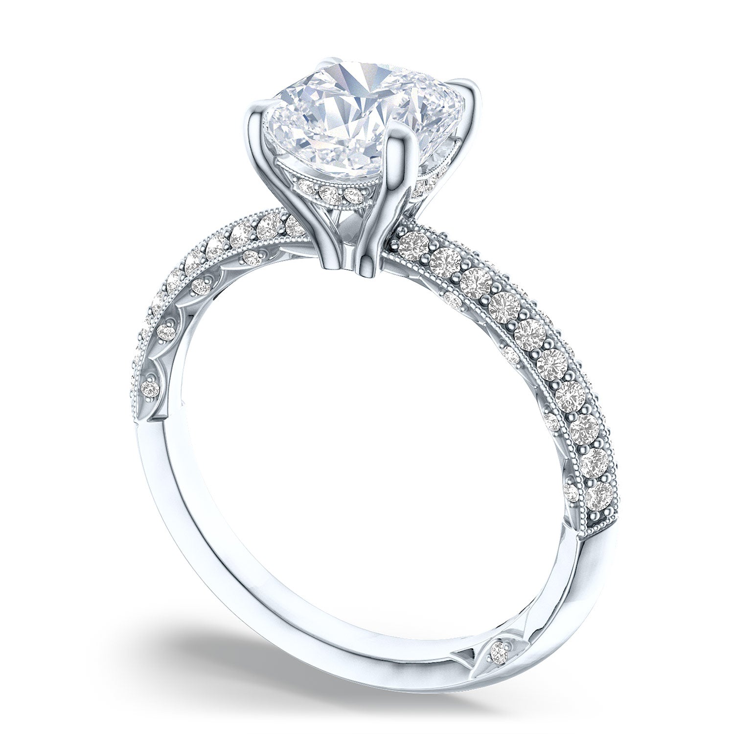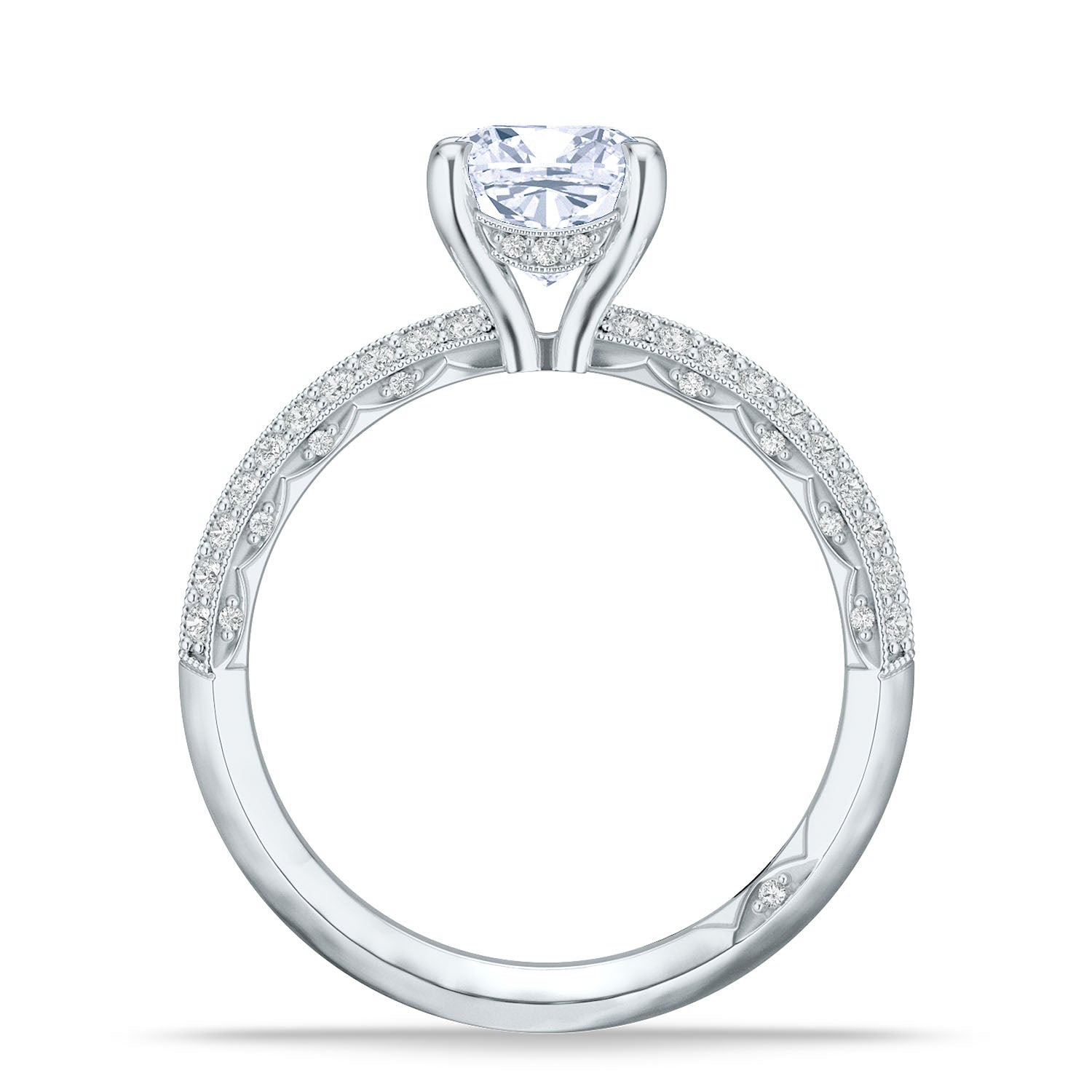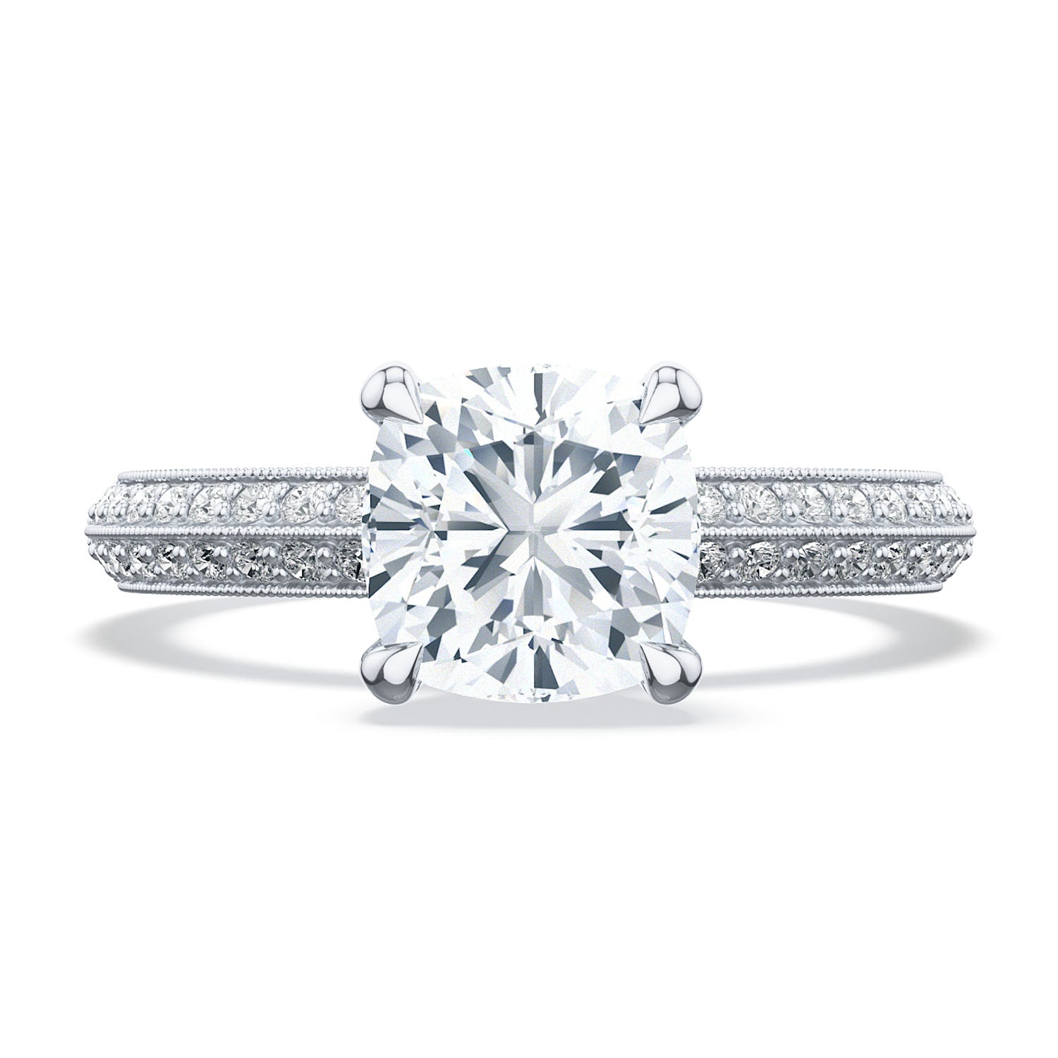 Double pavé lines the ceiling of the angular knife-edge band, while Sculpted Crescent with diamond touches decorate the innerface. The solitaire sits on a Classic 360 foundation with a hidden bloom for all-angle sparkle.