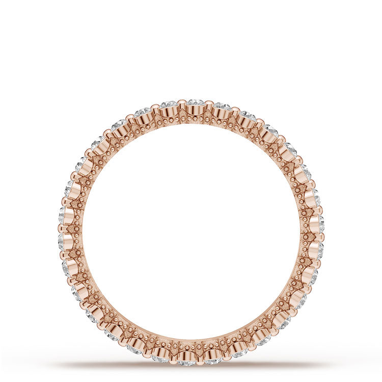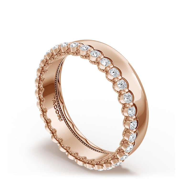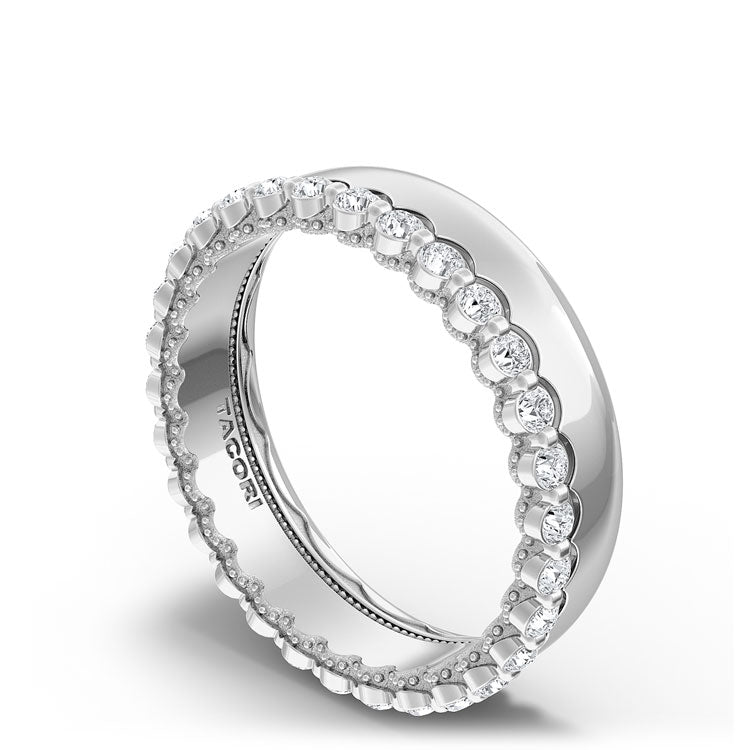 Prong-secured round brilliant diamonds encircle the upper perimeter of the wedding band, with each stone countoured with meticulous engraving. Crescents embellish the inner face silhouette. Rings are available in sizes 4-12.