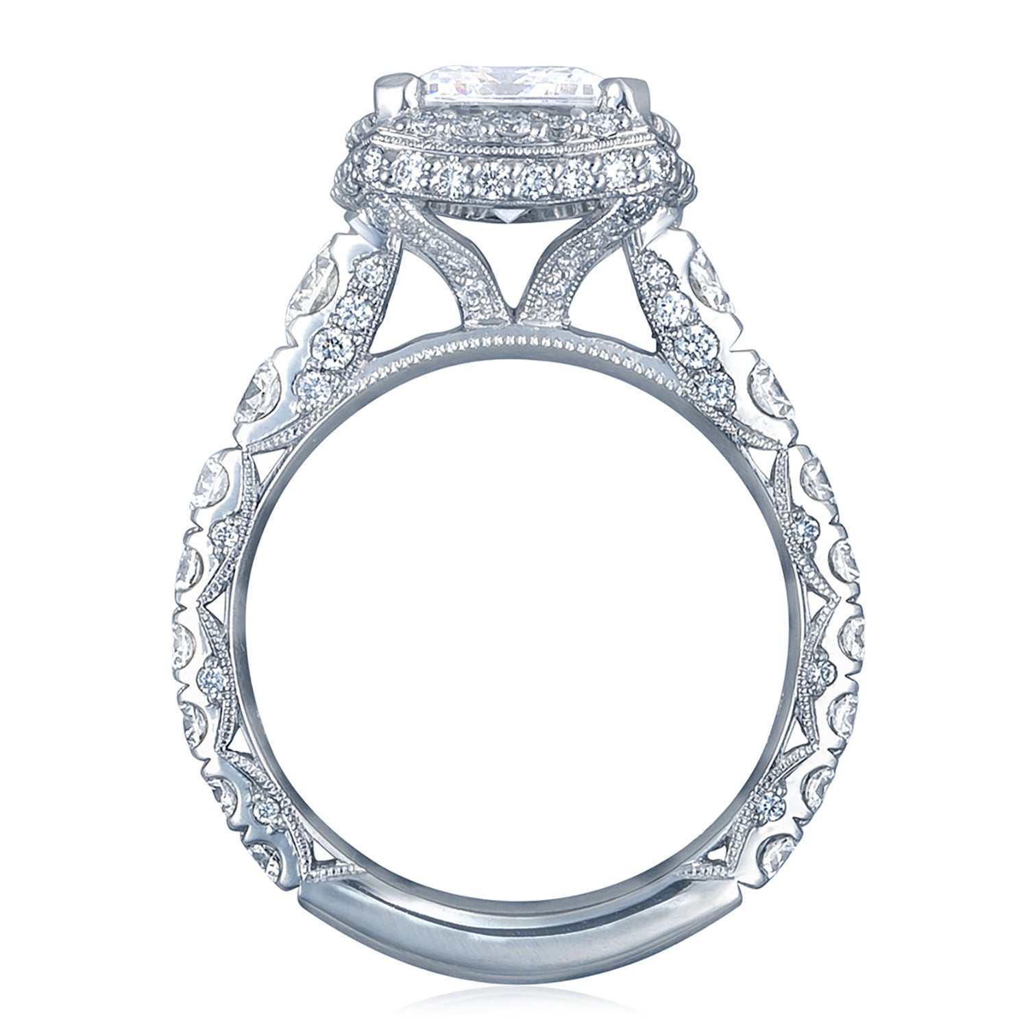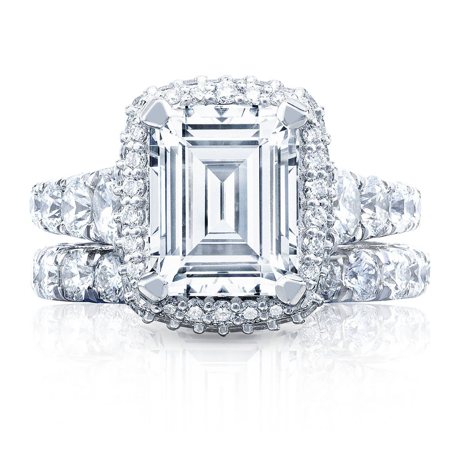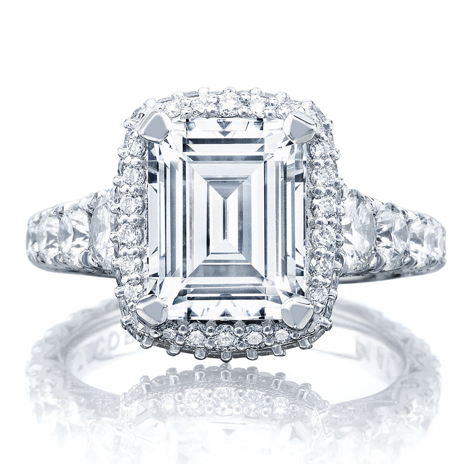 Graduating diamonds lead up the ceiling to an emerald-bloomed center stone. An open gallery beneath the crown highlights the diamond, while Petite Crescent fabric adds intricate diamond and milgrain detailing.