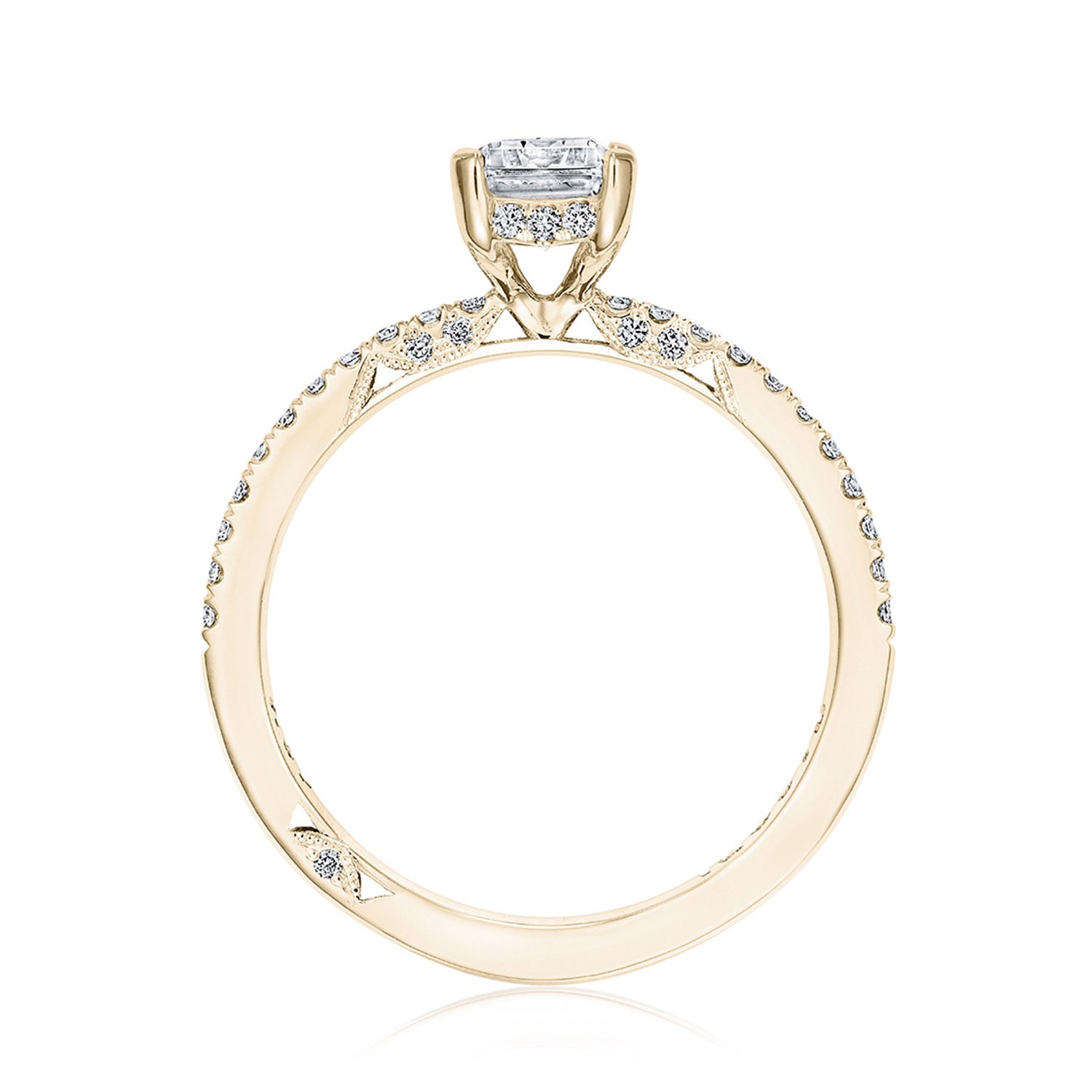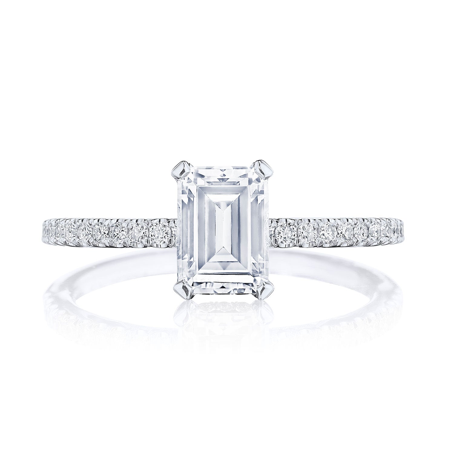 A romantic emerald solitaire floats on a Classic 360 foundation, above a thin, sparkling French- pavé band. The modern Simply TACORI crescent fabric decorates the upper ceiling of the ring, and a signature crescent marks the ring as Truly TACORI.