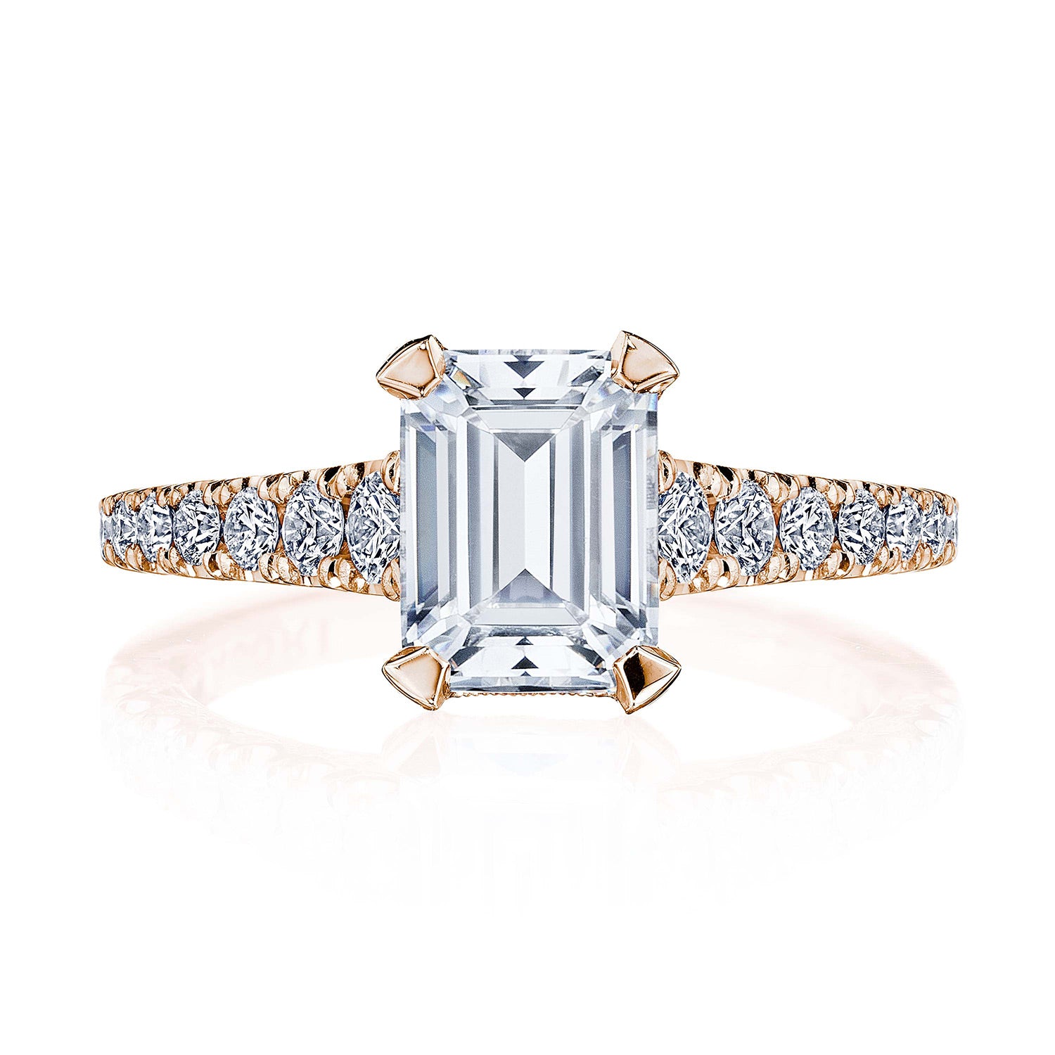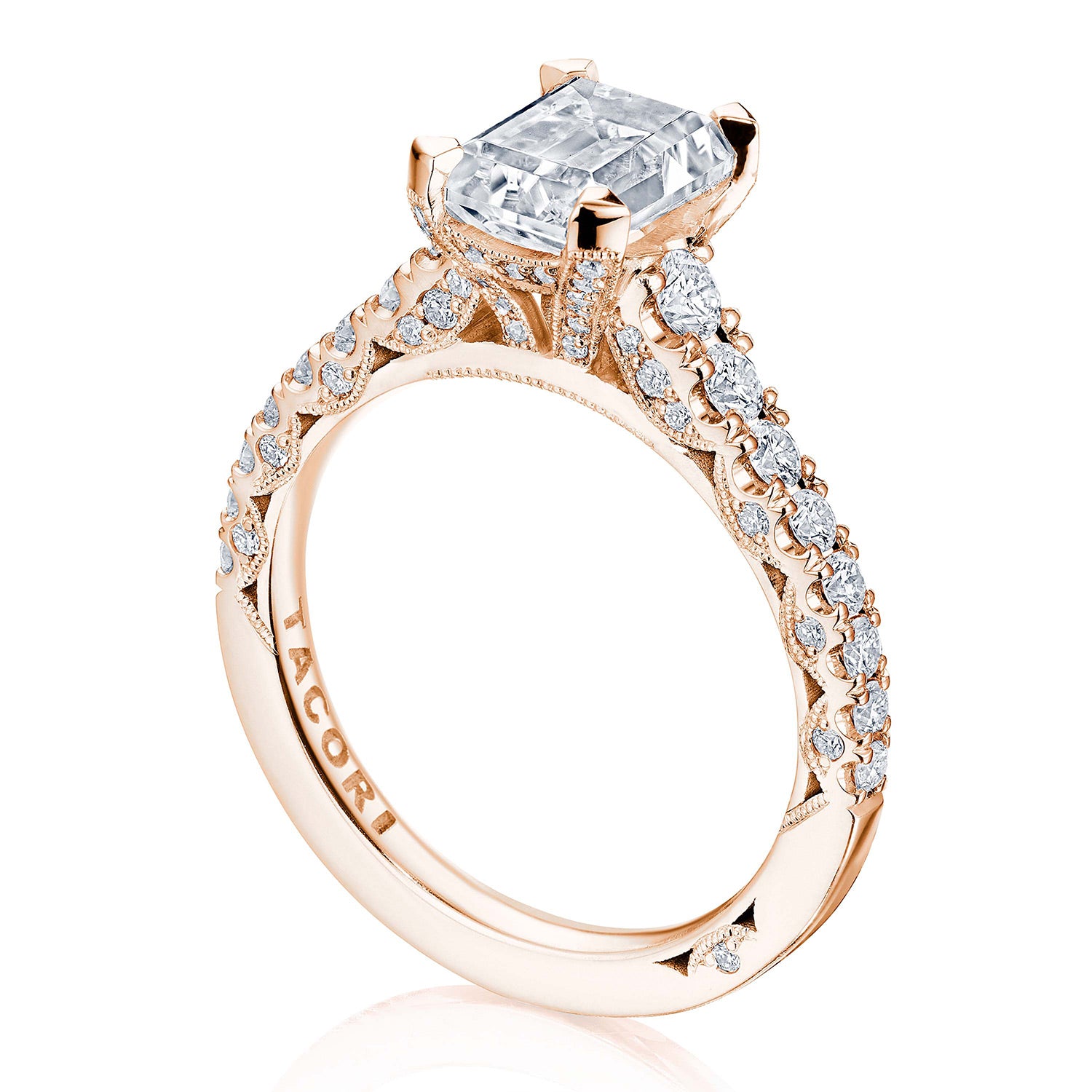 Tapering pavé-set diamonds lead up the ceiling towards the center stone, which is set on a diamond-studded Cathedral foundation above a hidden bloom and a band of Petite Crescent fabric. A Signature Crescent marks the foundation of the ring.
