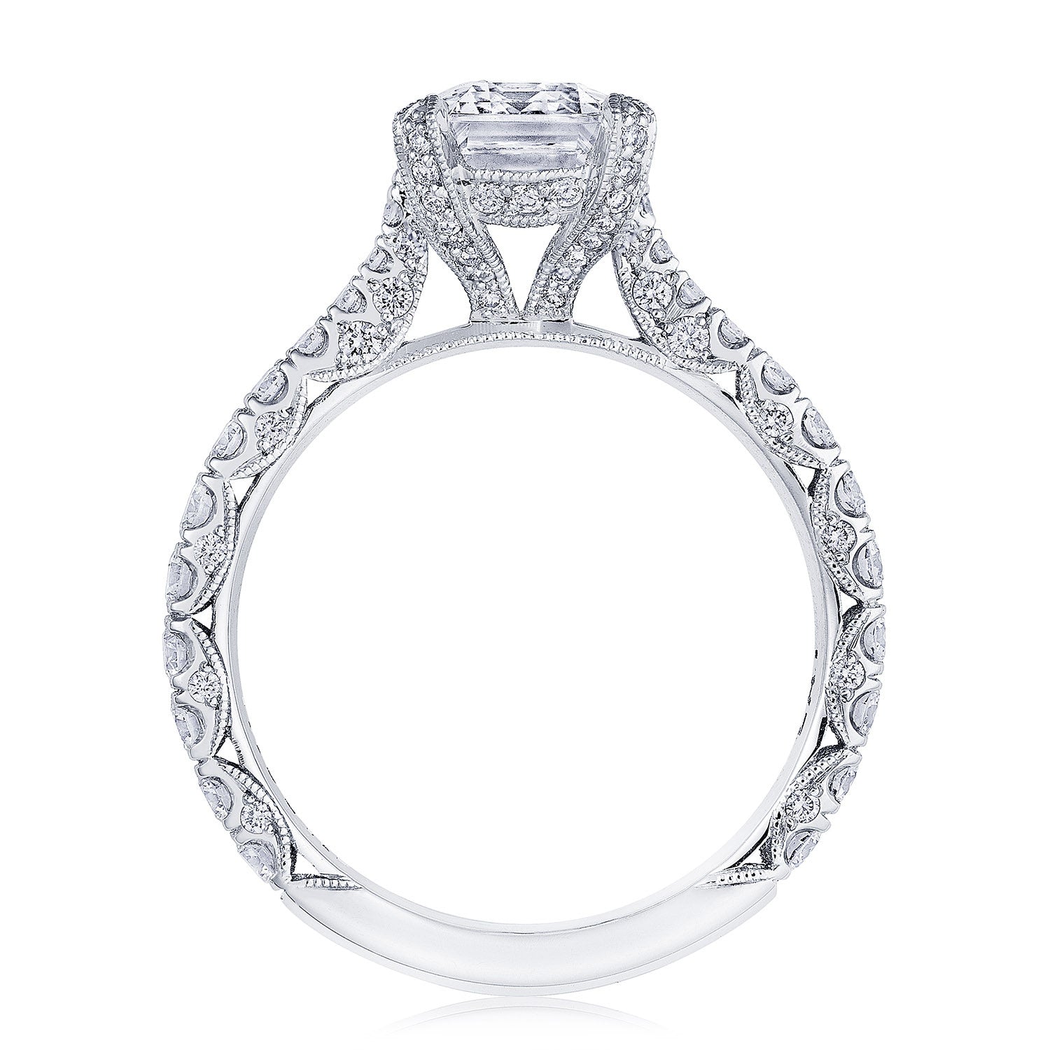 Diamond-studded Petite Crescent fabric decorates the innerface, while pavé-set diamonds lead up the ceiling towards the solitaire, which is set into the diamond-studded prongs. A hidden bloom adds brilliance beneath the crown.