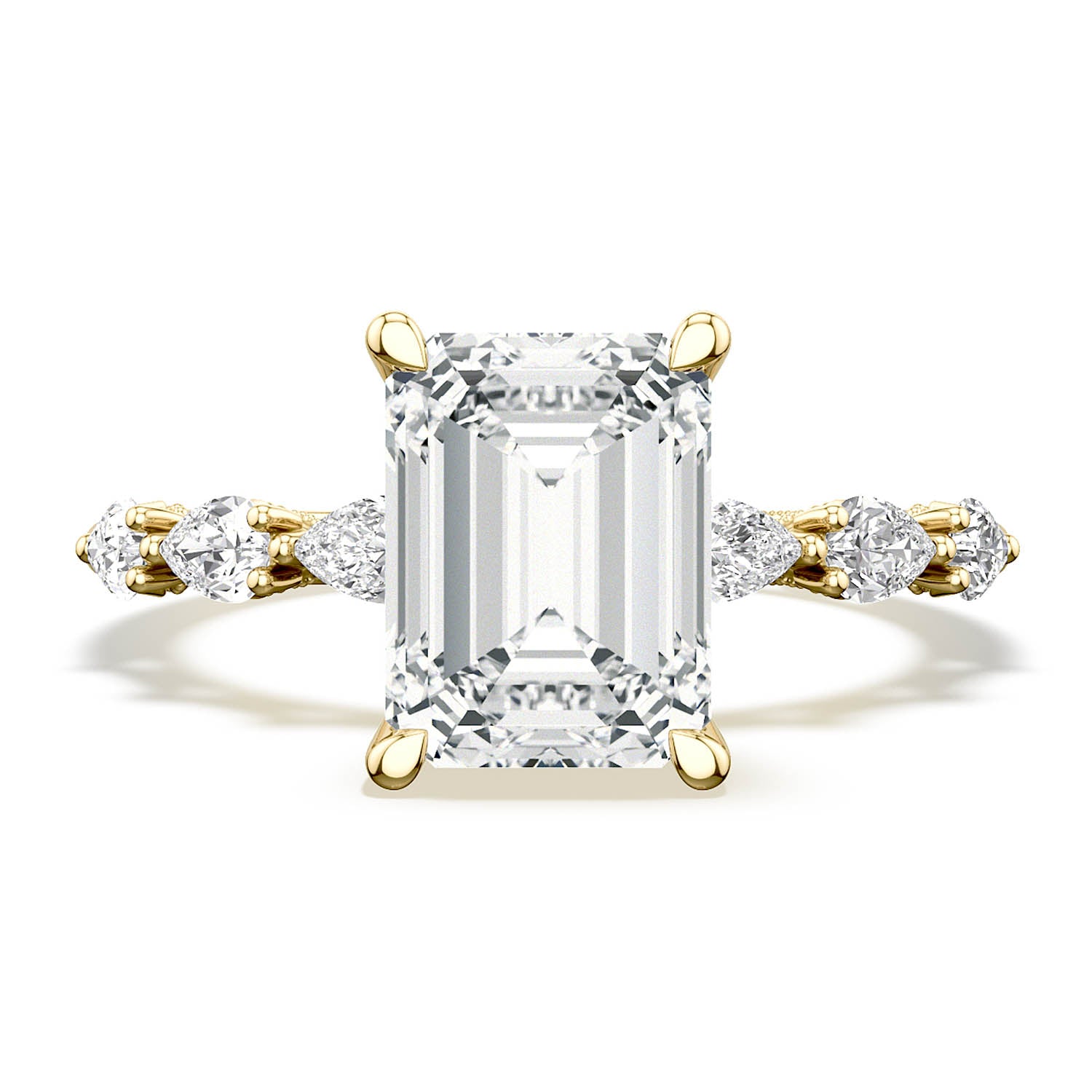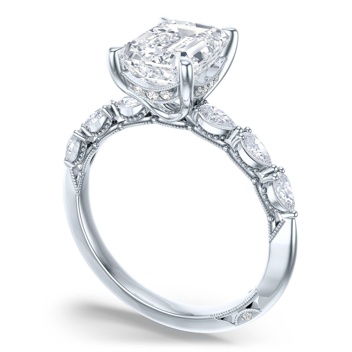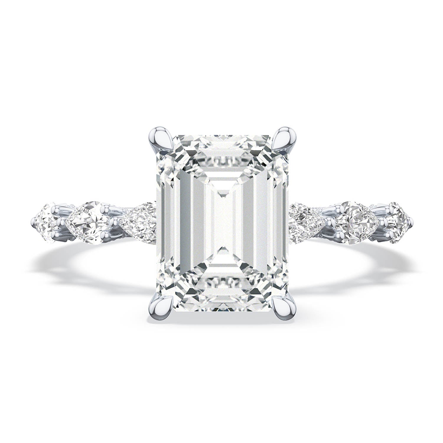Pear side stones set in an East-West orentation highlight the center stone, which floats on a Classic 360 foundation above a hidden bloom. Sculpted Crescent fabric decorates the innerface, and a Signature Crescent marks the resting point.