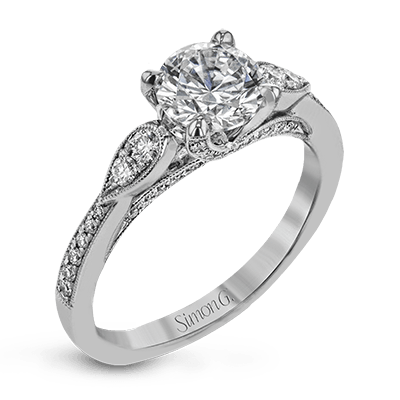 This absolutely charming white gold ring features a subtle, nature-inspired design as well as .32 ctw of round white diamonds. Center stone not included. Our rings can be designed to fit any center stone.