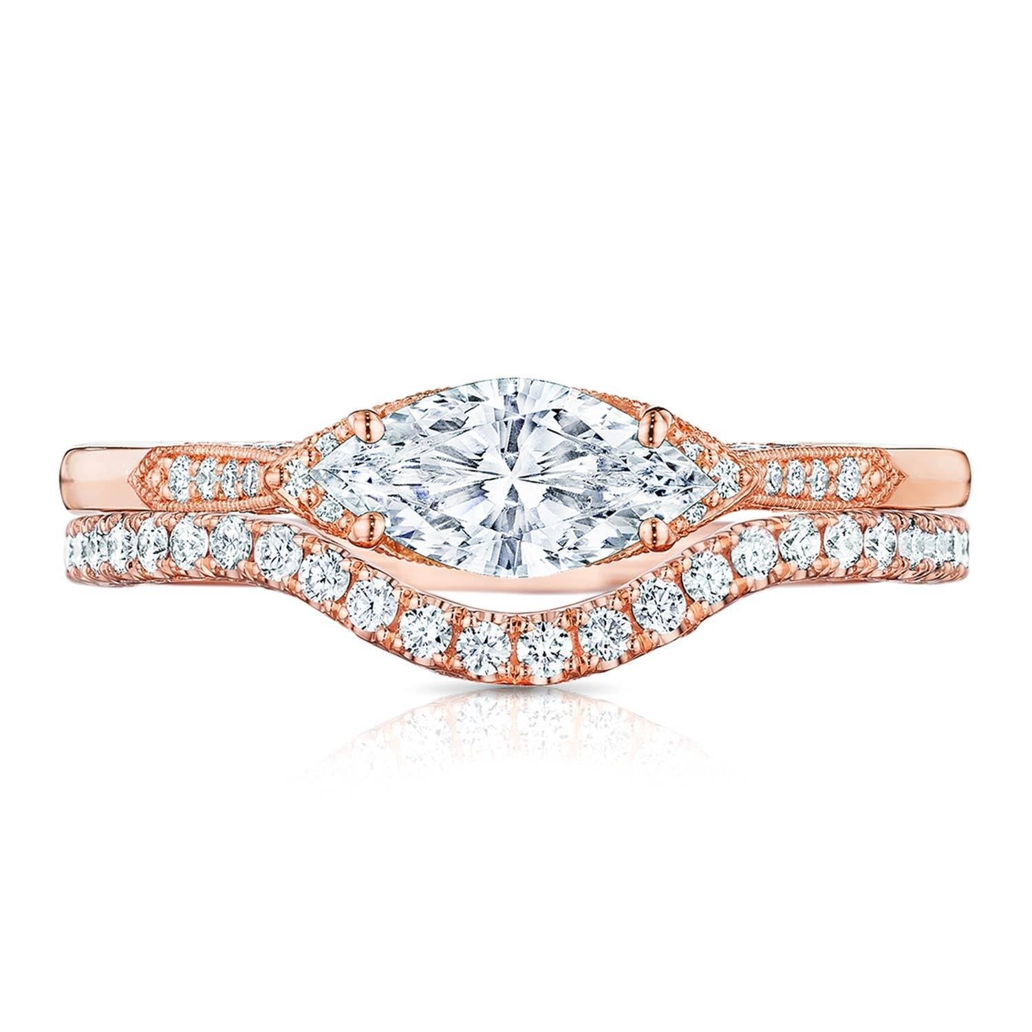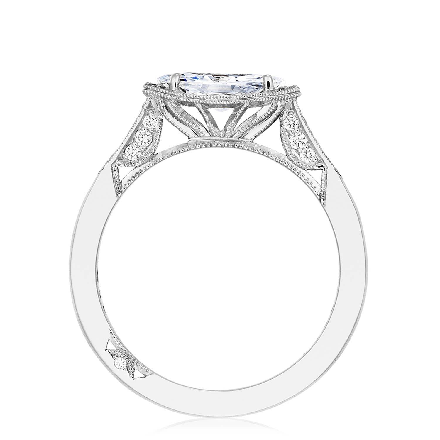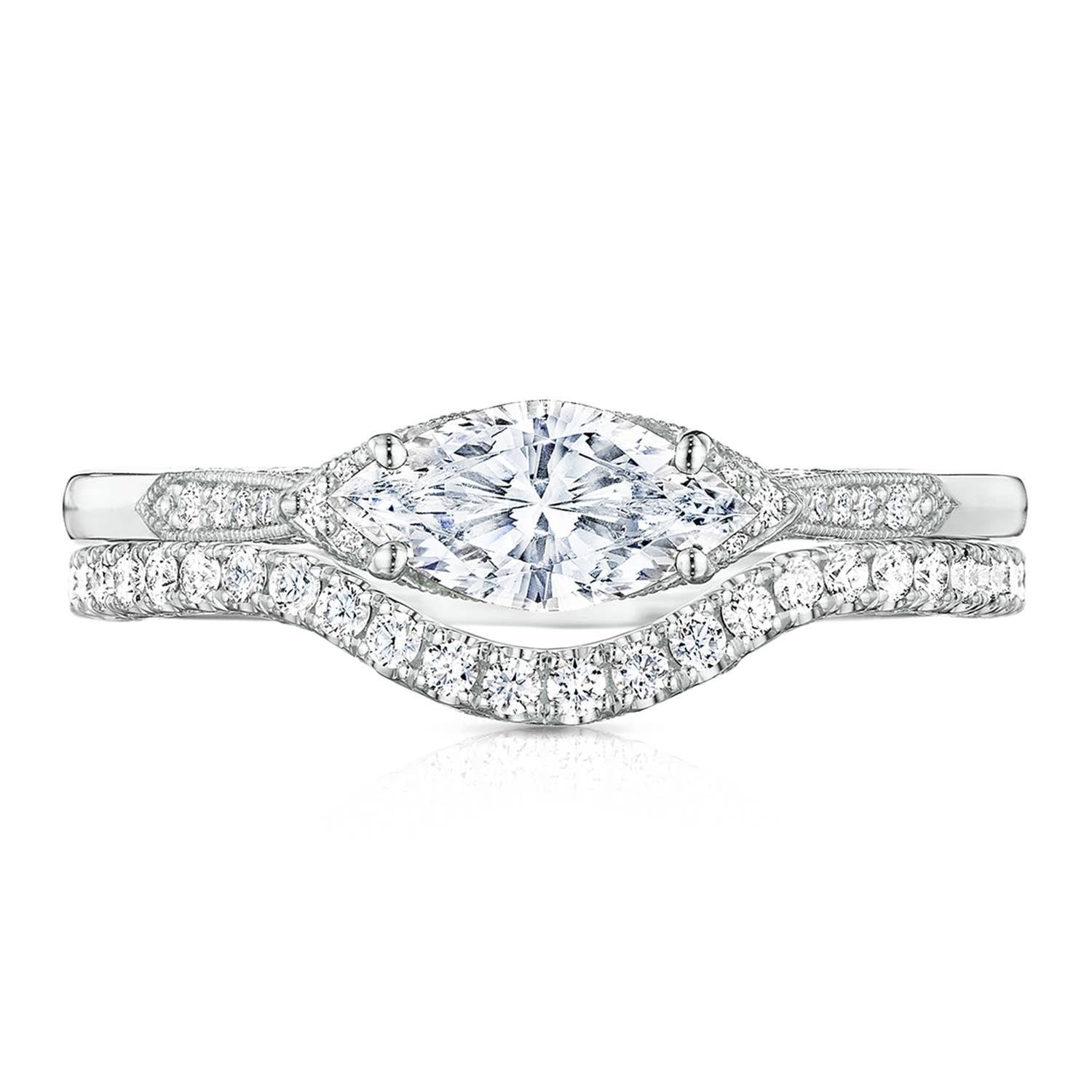 The marquise solitaire is set East to West on the band and is accentuated by a diamond-tipped frame and pavé-set diamonds on the ceiling. Simply Tacori crescent fabric adds diamond detail just beneath the crown.