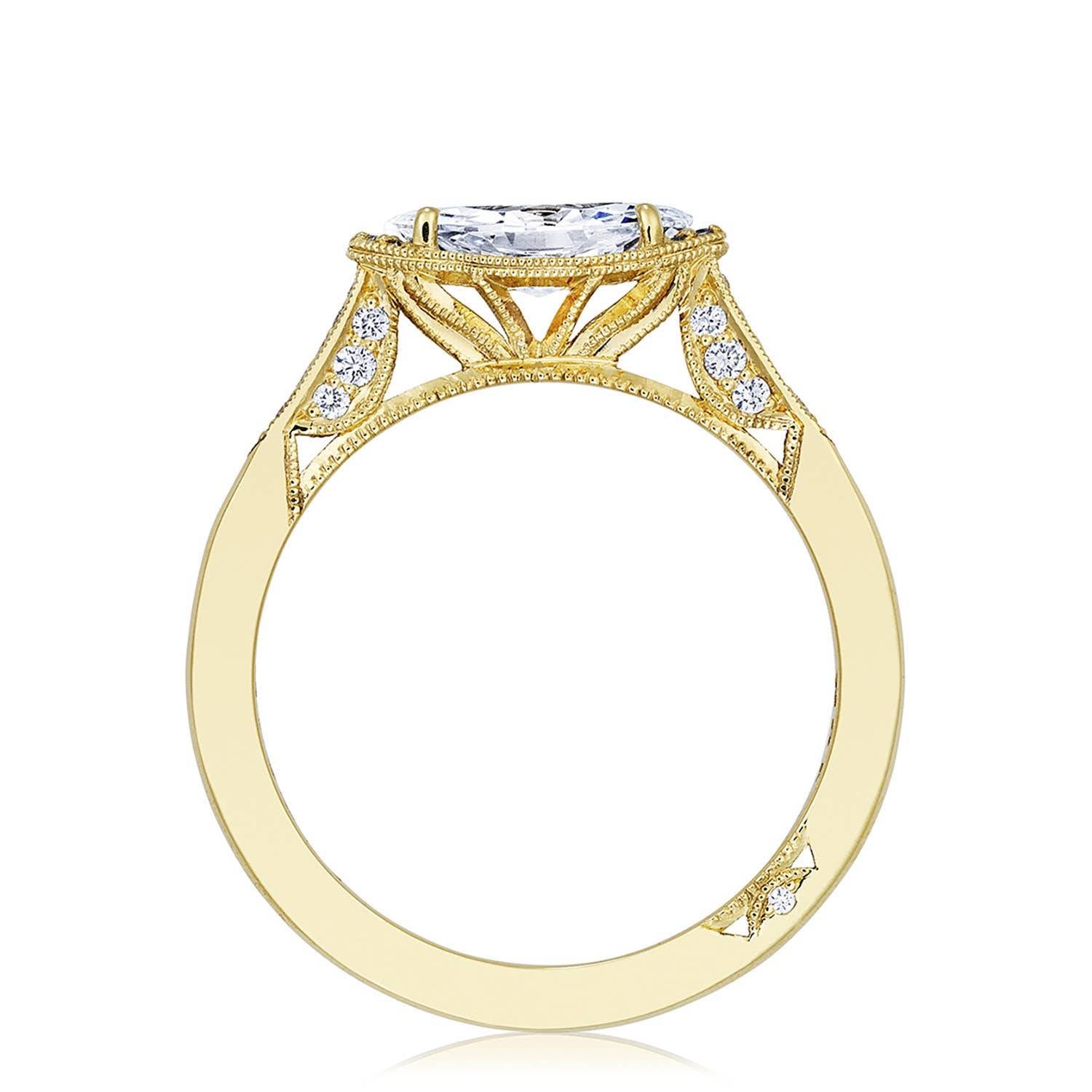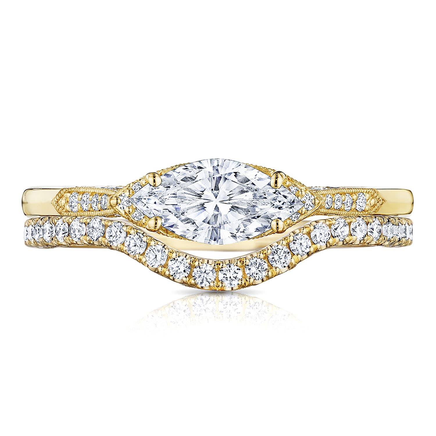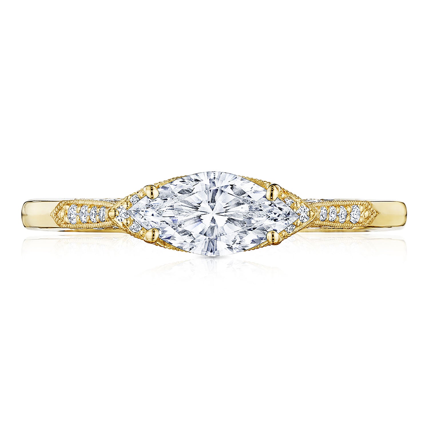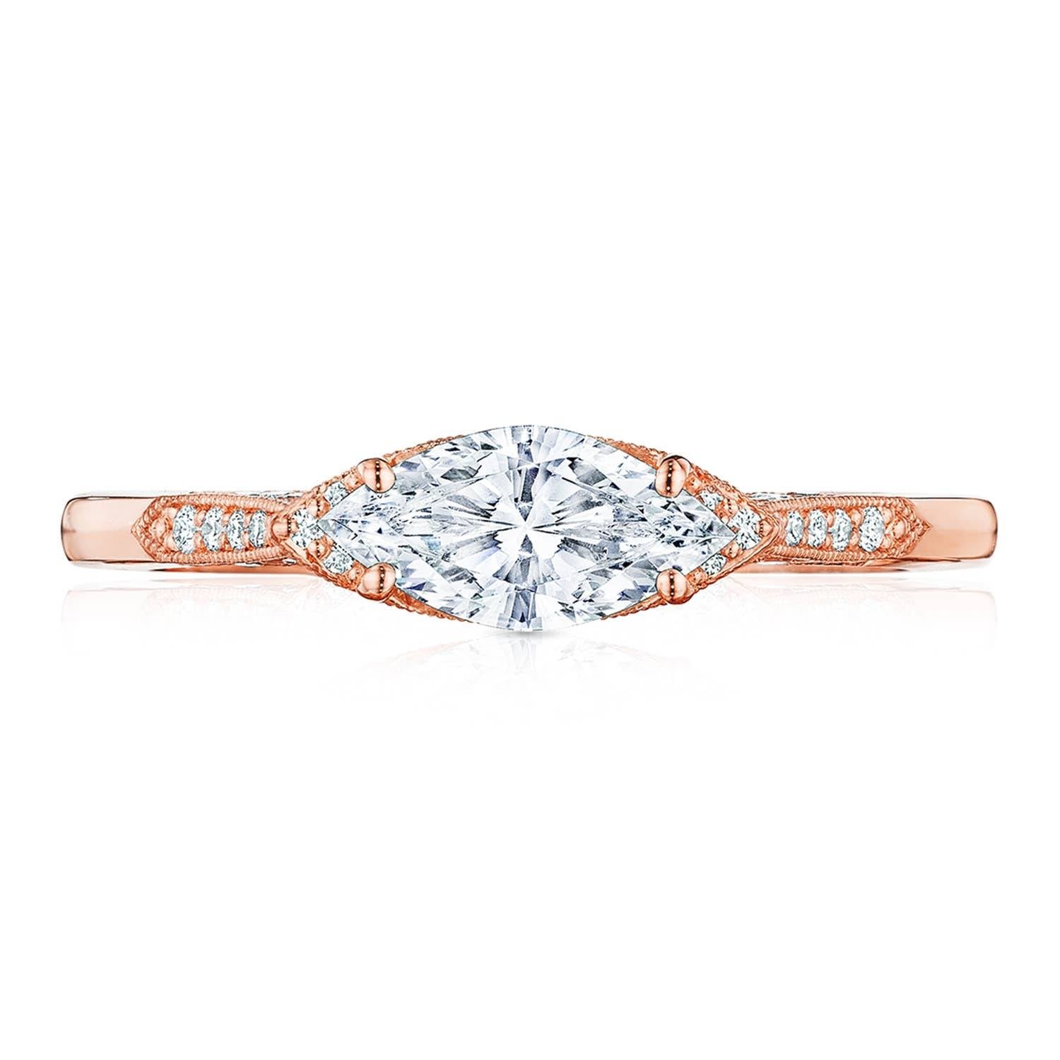 The marquise solitaire is set East to West on the band and is accentuated by a diamond-tipped frame and pavé-set diamonds on the ceiling. Simply Tacori crescent fabric adds diamond detail just beneath the crown.