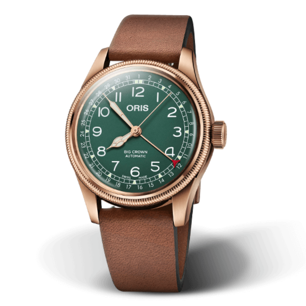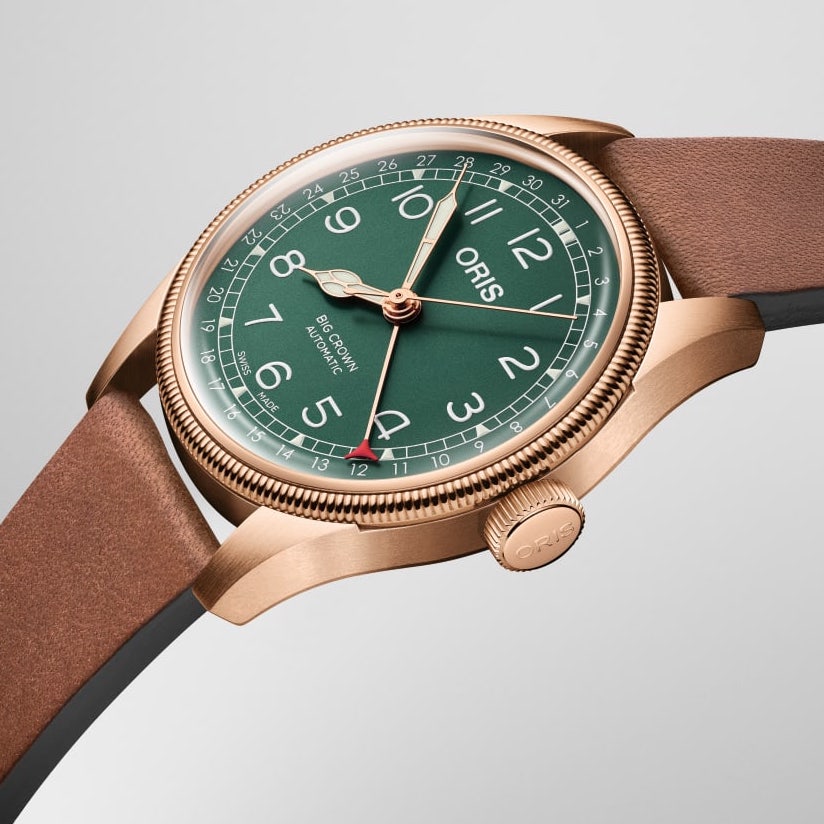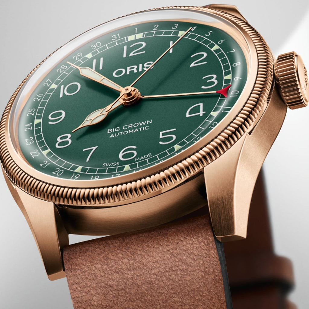 On the 80th anniversary of the Oris Big Crown Pointer Date, Oris is proud to present a special edition in bronze with a green dial. No watch tells the historic tale of independent Swiss watchmaker Oris quite like the iconic Big Crown Pointer Date. It’s a potent symbol of Oris’s philosophy, and some say that without it Oris might not enjoy its current status as a leader in Swiss Made mechanical watches. In 1938, Oris introduced a pioneering watch for pilots. It had an oversized crown so that glove-wearing airmen could easily adjust it, and an unusual complication – a date indicated by a central pointer hand. To mark the 80th anniversary of this landmark watch, Oris has created the Big Crown Pointer Date 80th Anniversary Edition, a special piece with a 40mm case, fluted bezel and oversized crown cast in bronze, and a striking green dial. Bronze patinates naturally as it oxidises, so that each watch will take on a unique finish over time. The deep green of the dial also has a natural feel, complementing the bronze case. Multi-piece bronze case with bronze screw-in security crown, dark brown leather strap made with sustainably sourced and produced materials, bronze buckle. Water Resistance 5 bar.