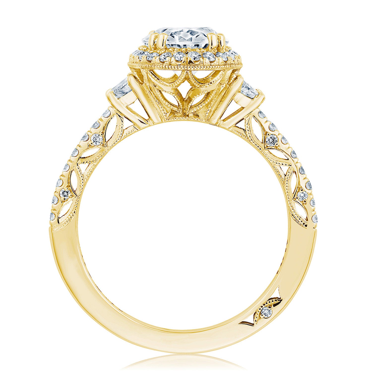 This elegant three-stone setting is exceptionally detailed. A Spotlight Bloom with radiant Cadillac side stones sit atop a meticulous French pavé band with lace-like, milgrain-edged Dantela Crescent Fabric.