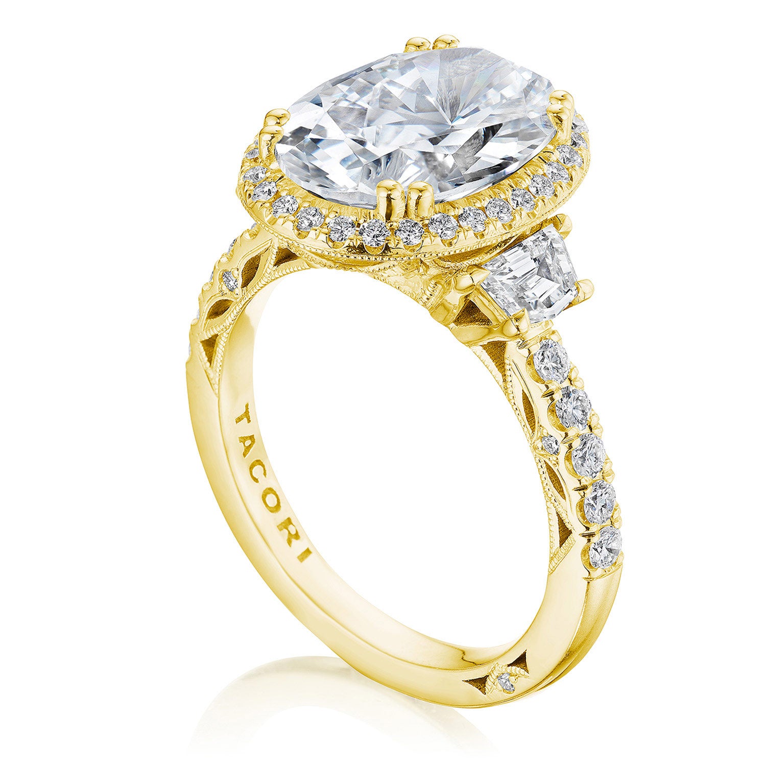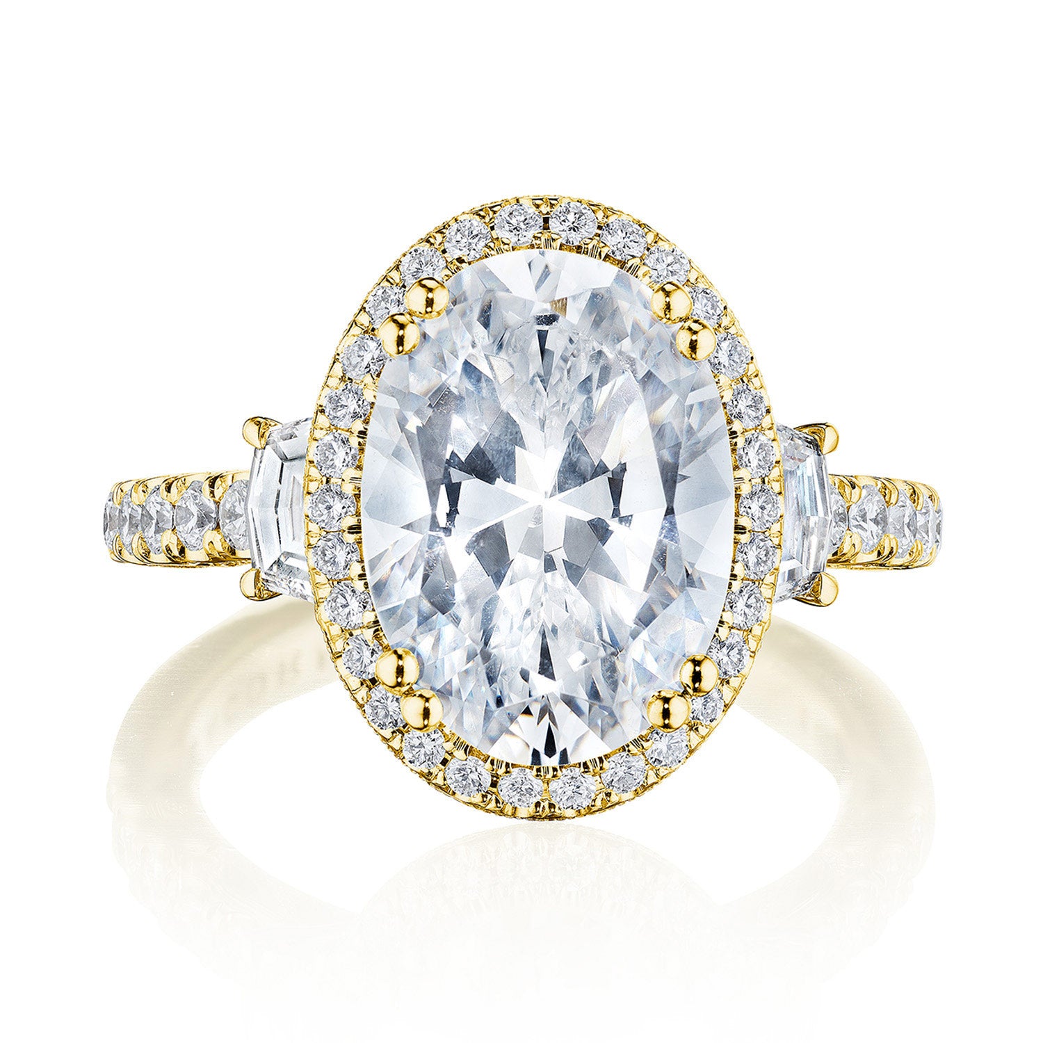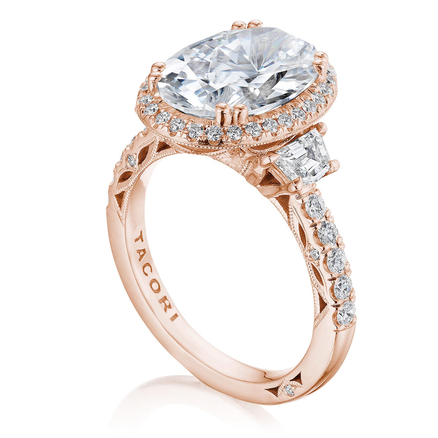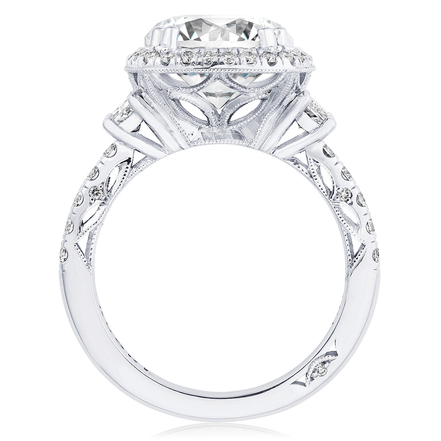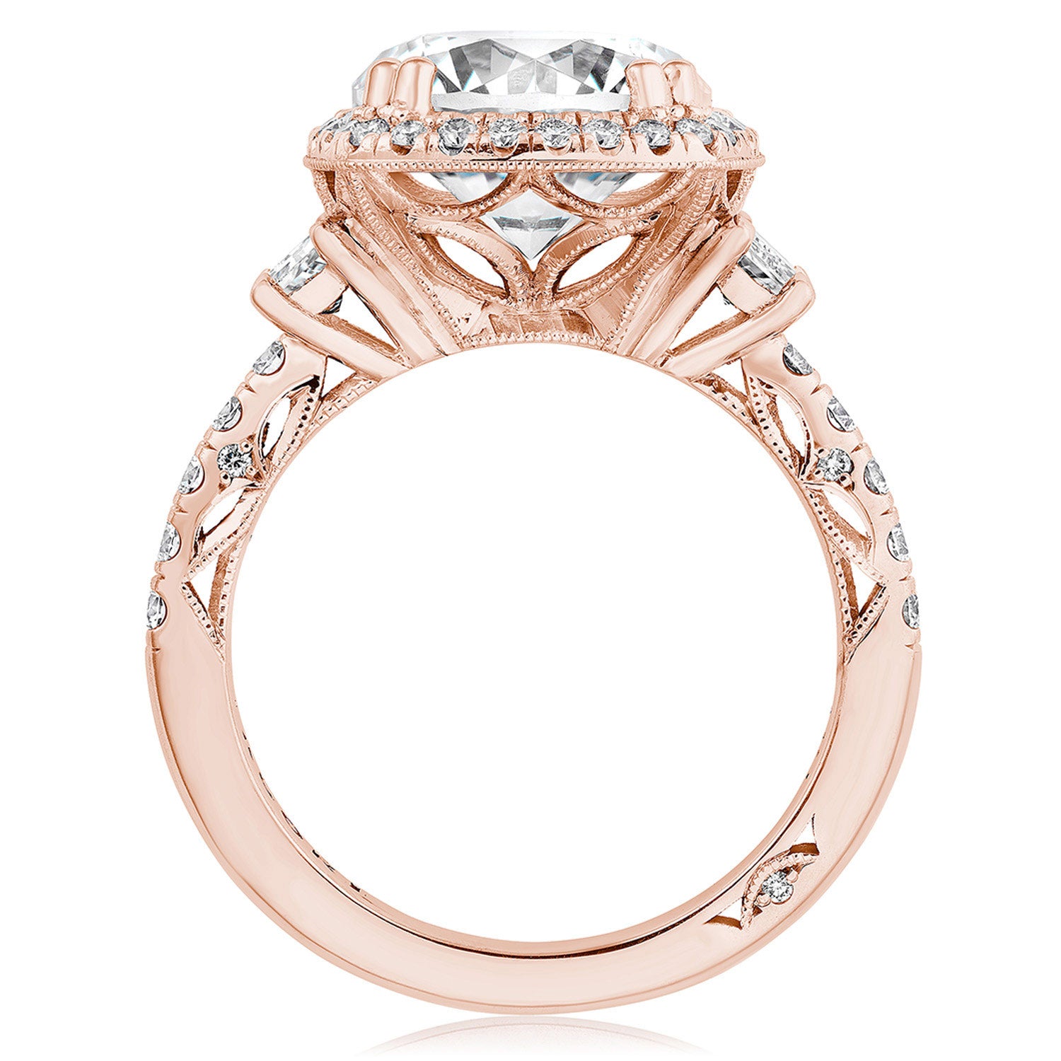 This elegant three-stone setting is exceptionally detailed. A Spotlight Bloom with radiant Cadillac side stones sit atop a meticulous French pavé band with lace-like, milgrain-edged Dantela Crescent Fabric.