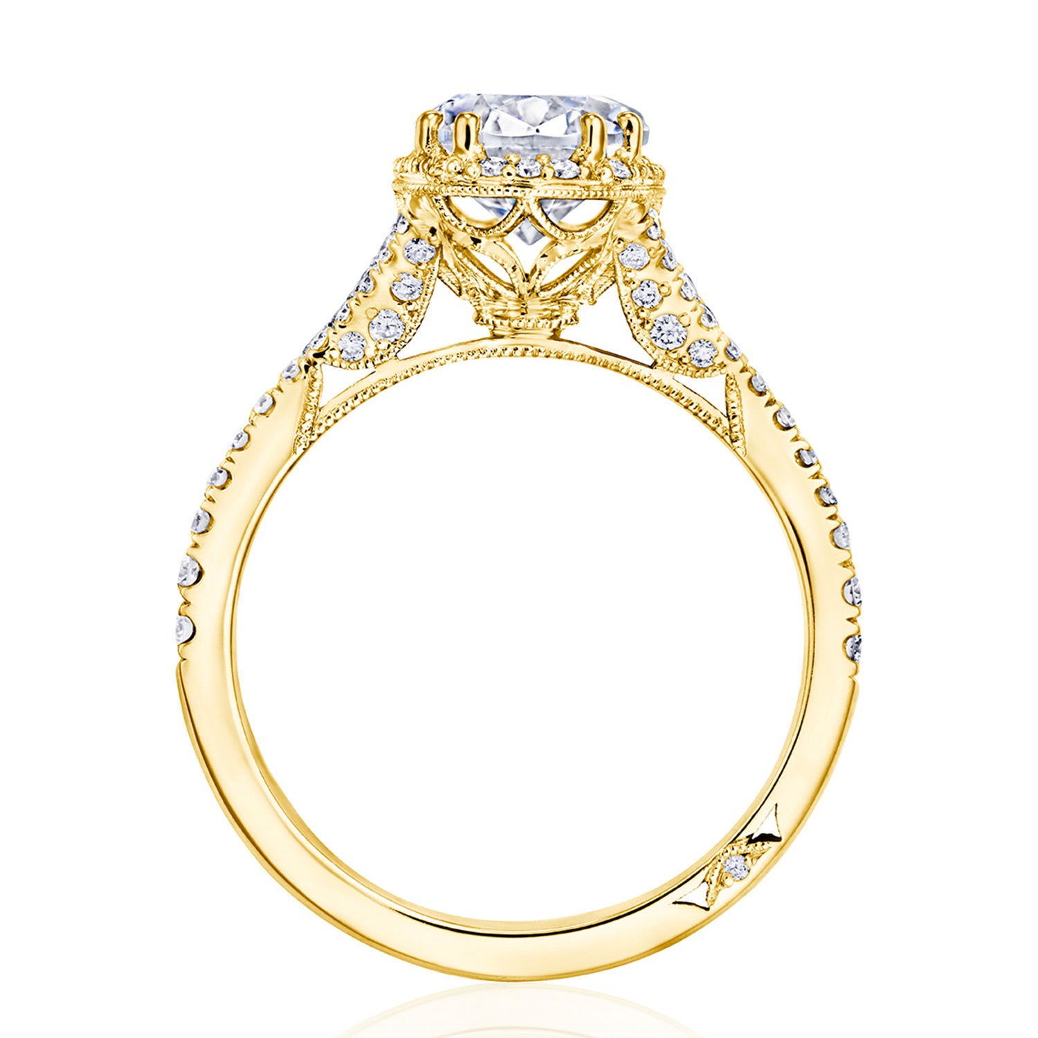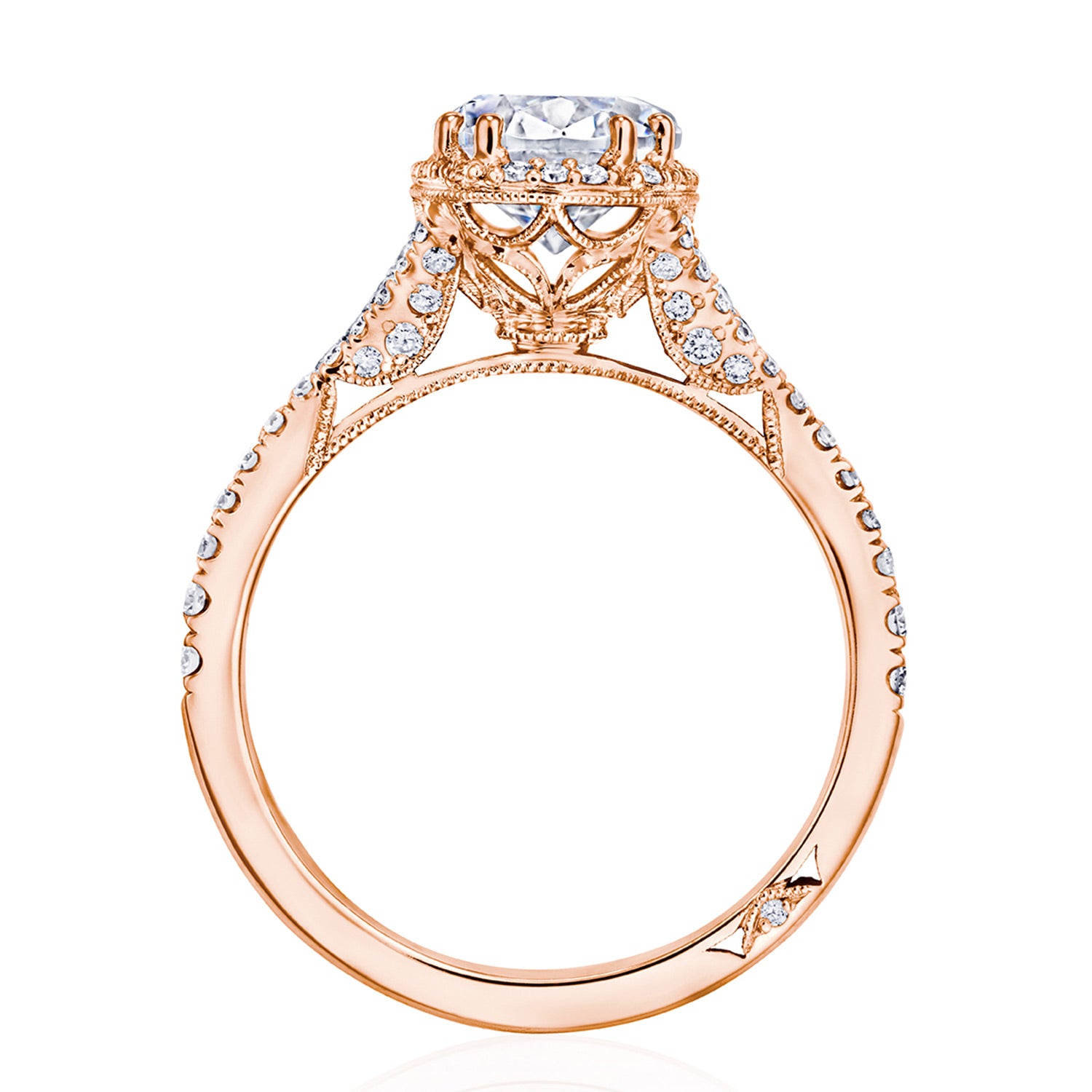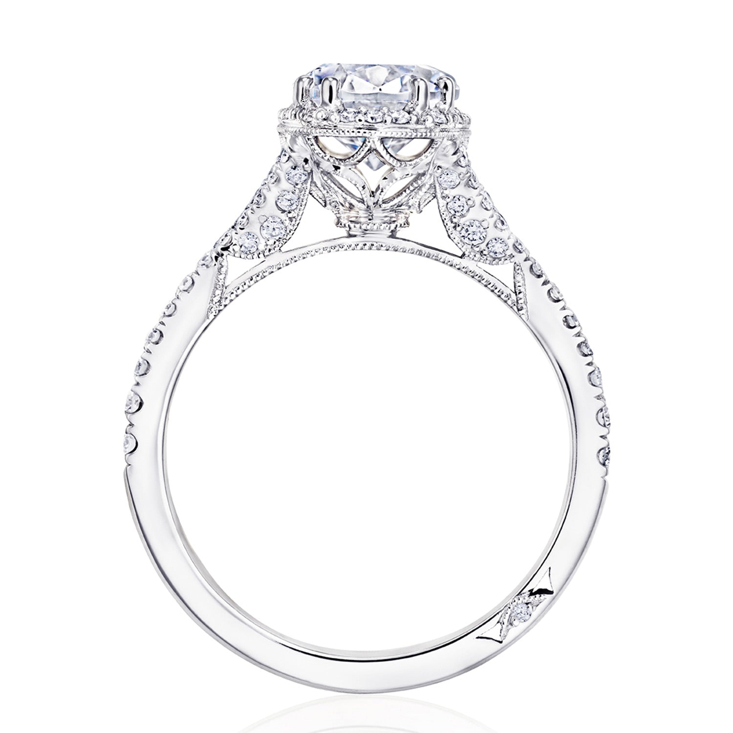 A cushion bloom elevates the center stone, which rests on a lace-like, milgrian-studded Cathedral foundation. A pavé ceiling branches and embraces the solitaire, while a signature crescent marks the resting point of the ring.