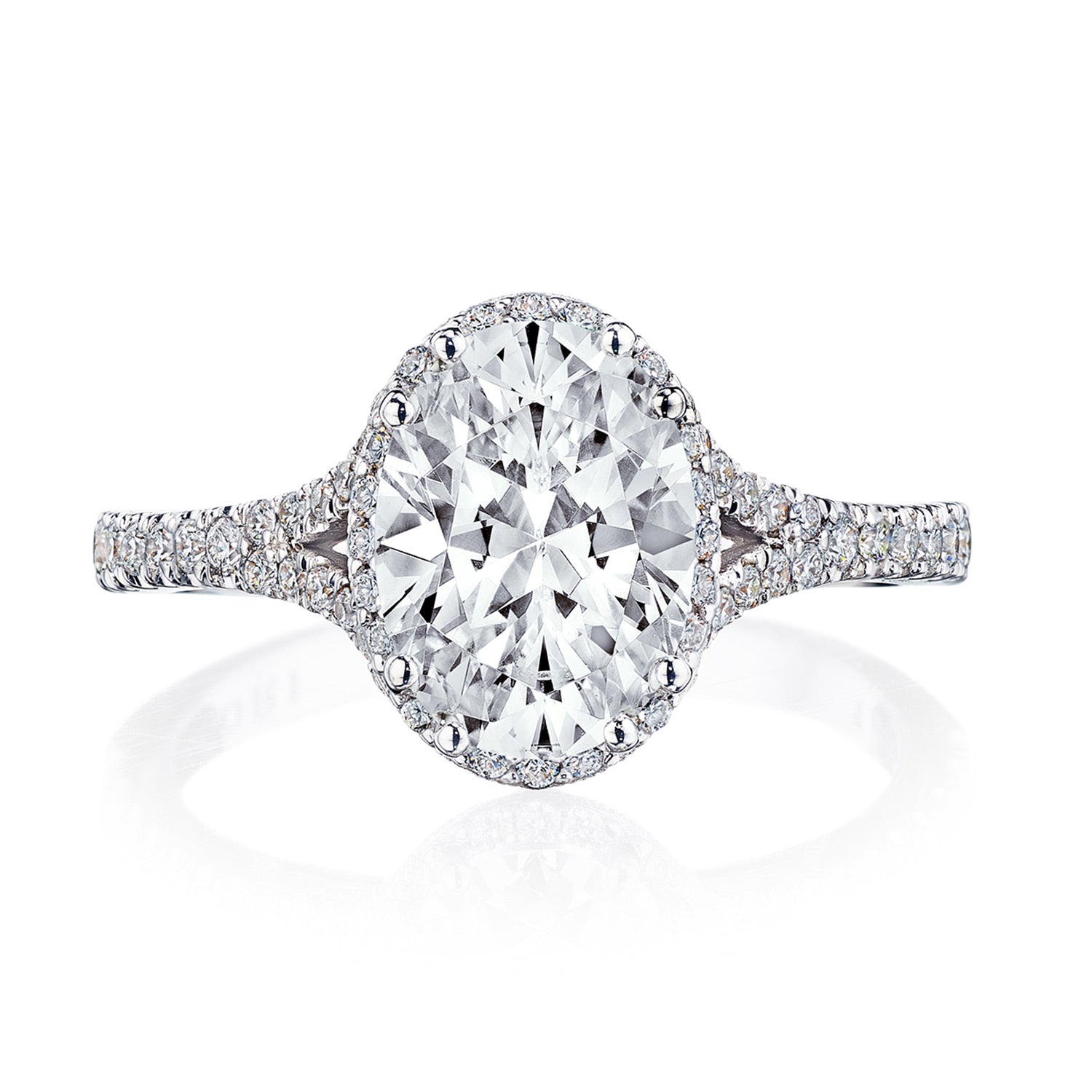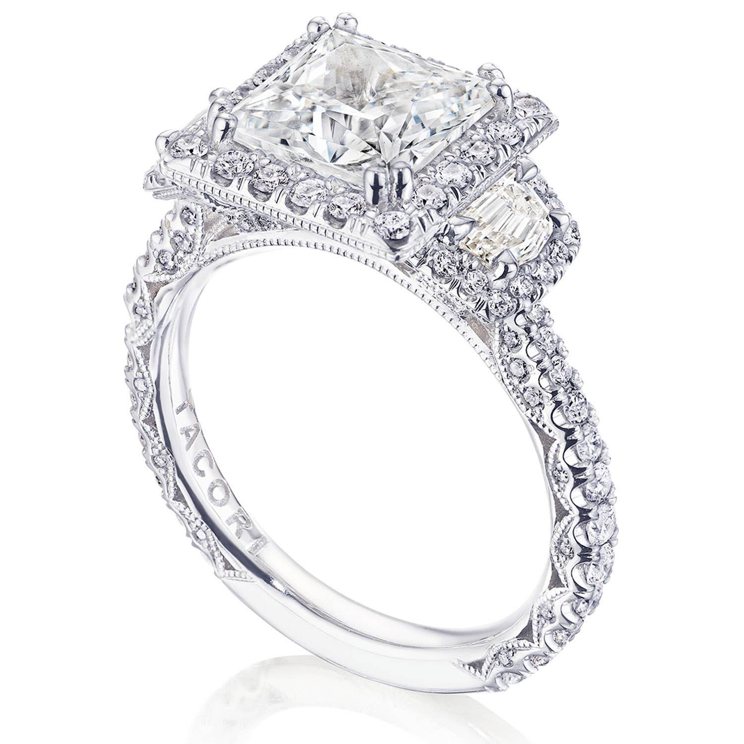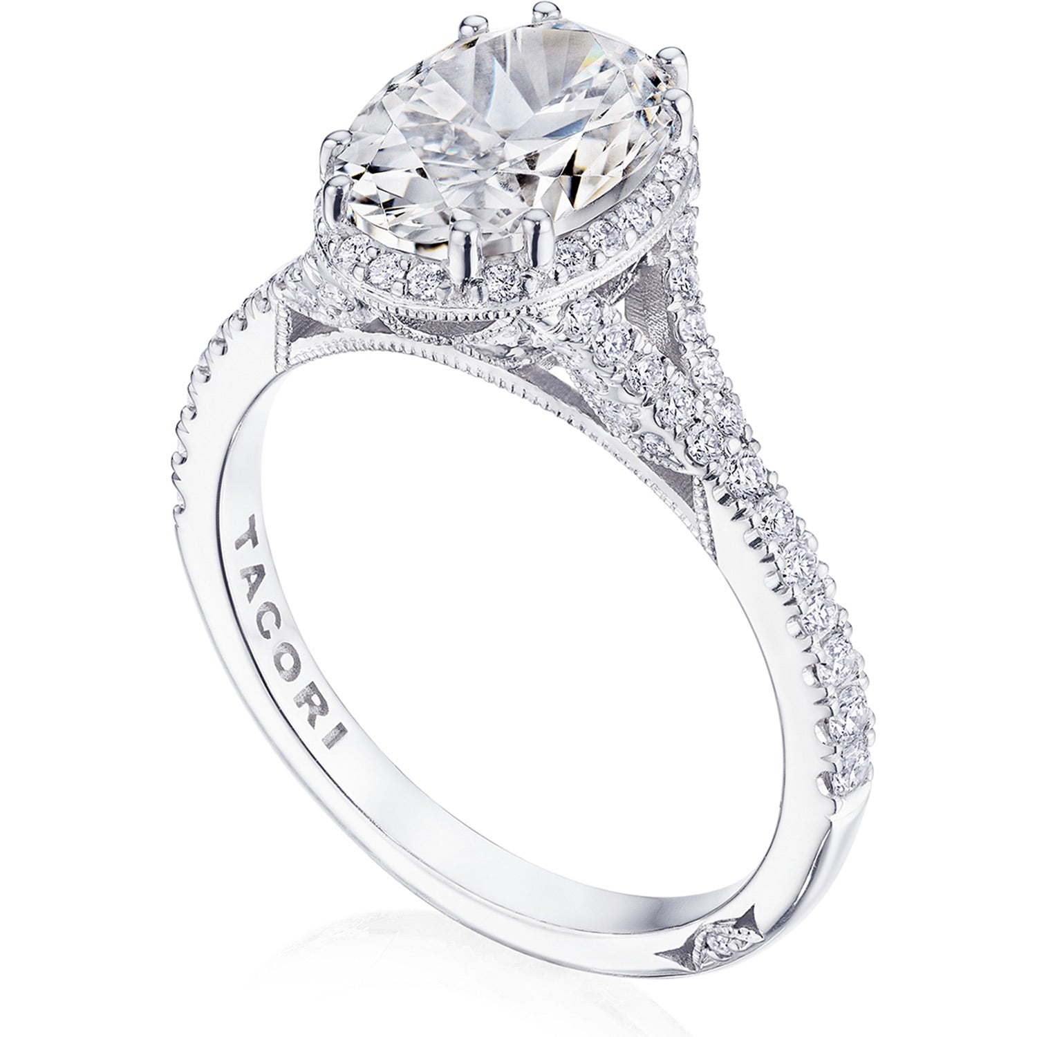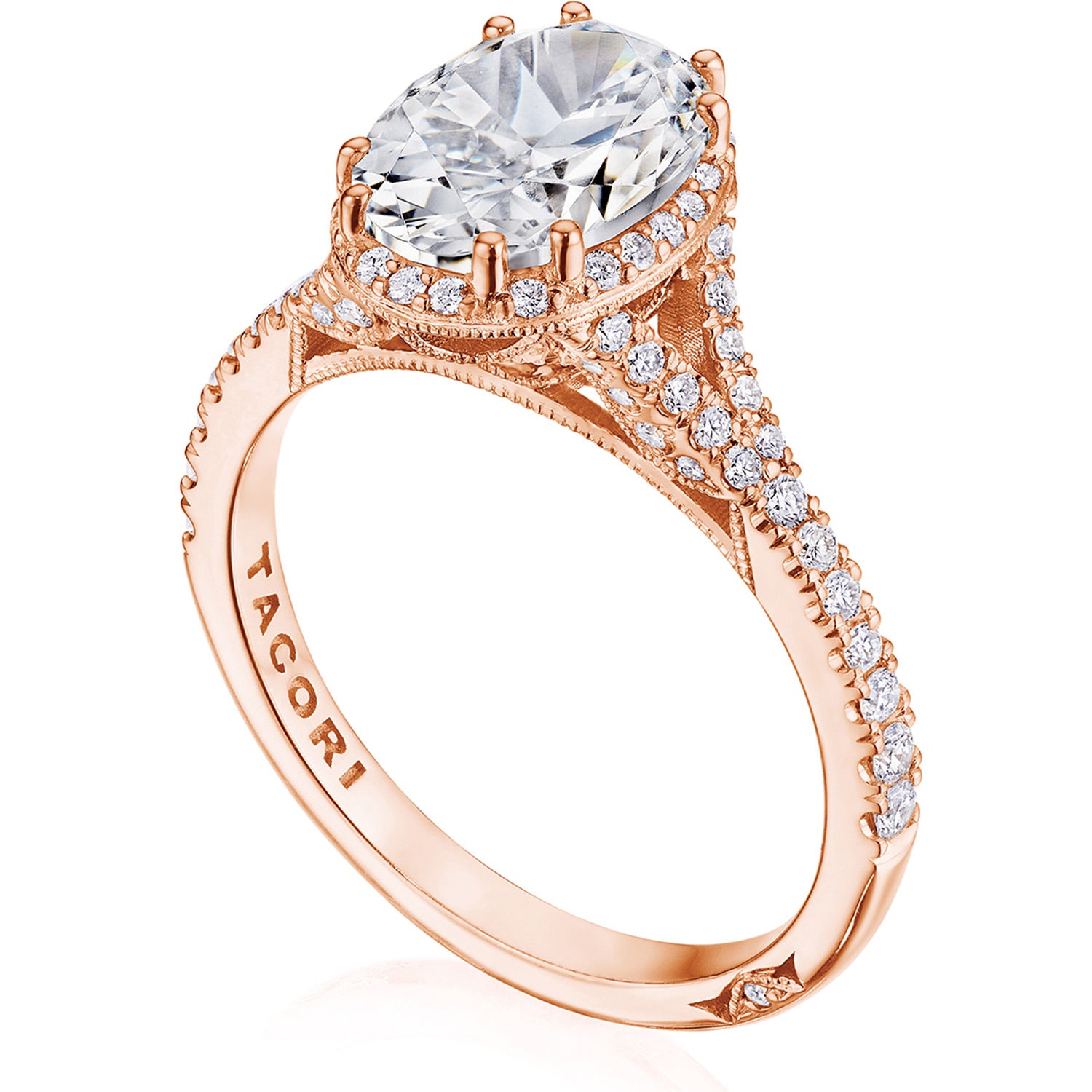 A cushion bloom elevates the center stone, which rests on a lace-like, milgrian-studded Cathedral foundation. A pavé ceiling branches and embraces the solitaire, while a signature crescent marks the resting point of the ring.