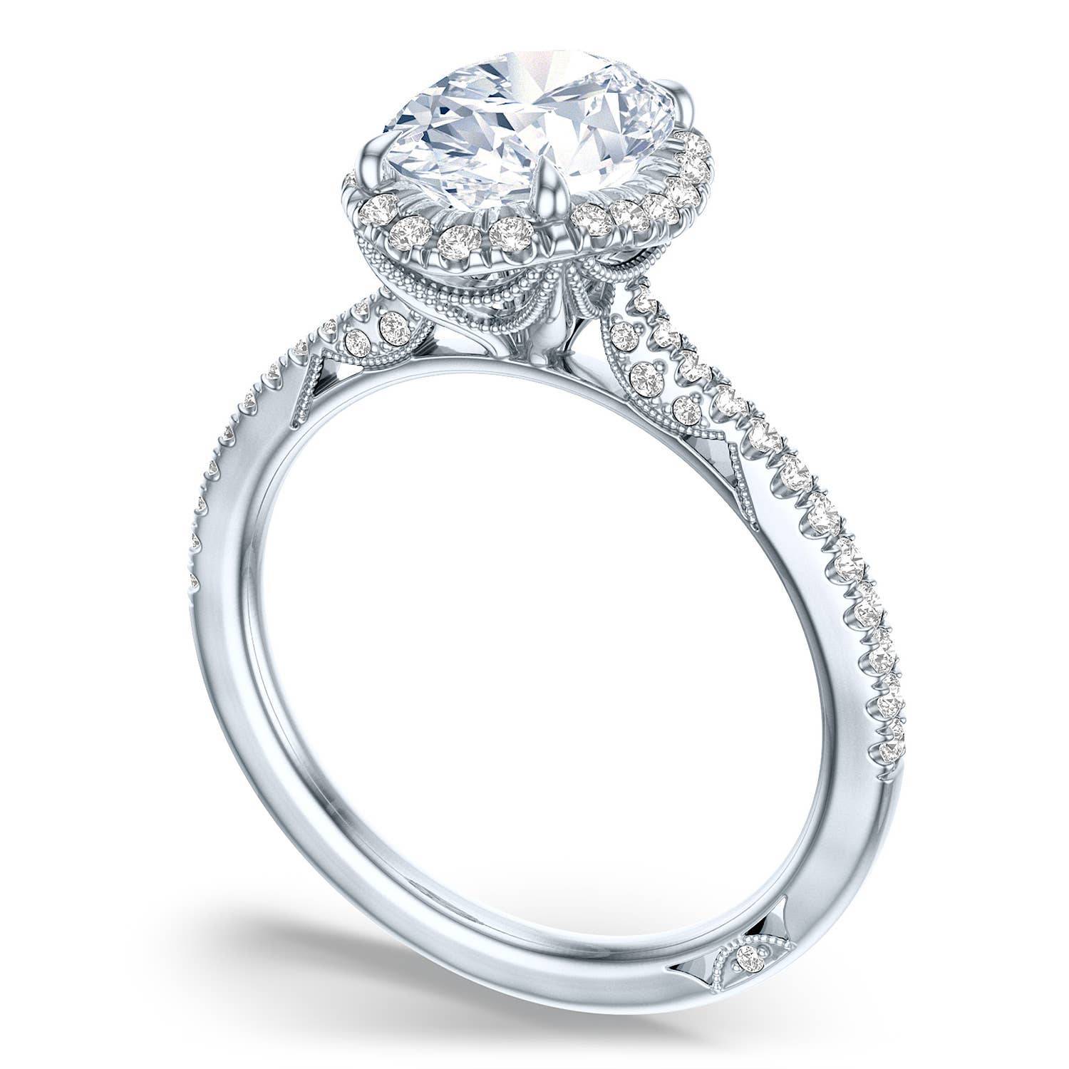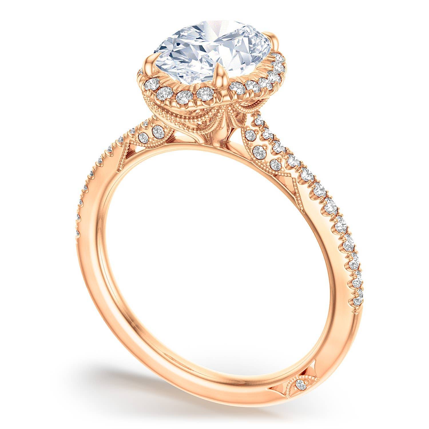 A bloomed oval solitaire rests on a Cathedral foundation above a pavé ceiling and a Simply TACORI inner face. Stunning milgrain is inspired by the draping found in bridal gowns, and evokes couture bridal wear.