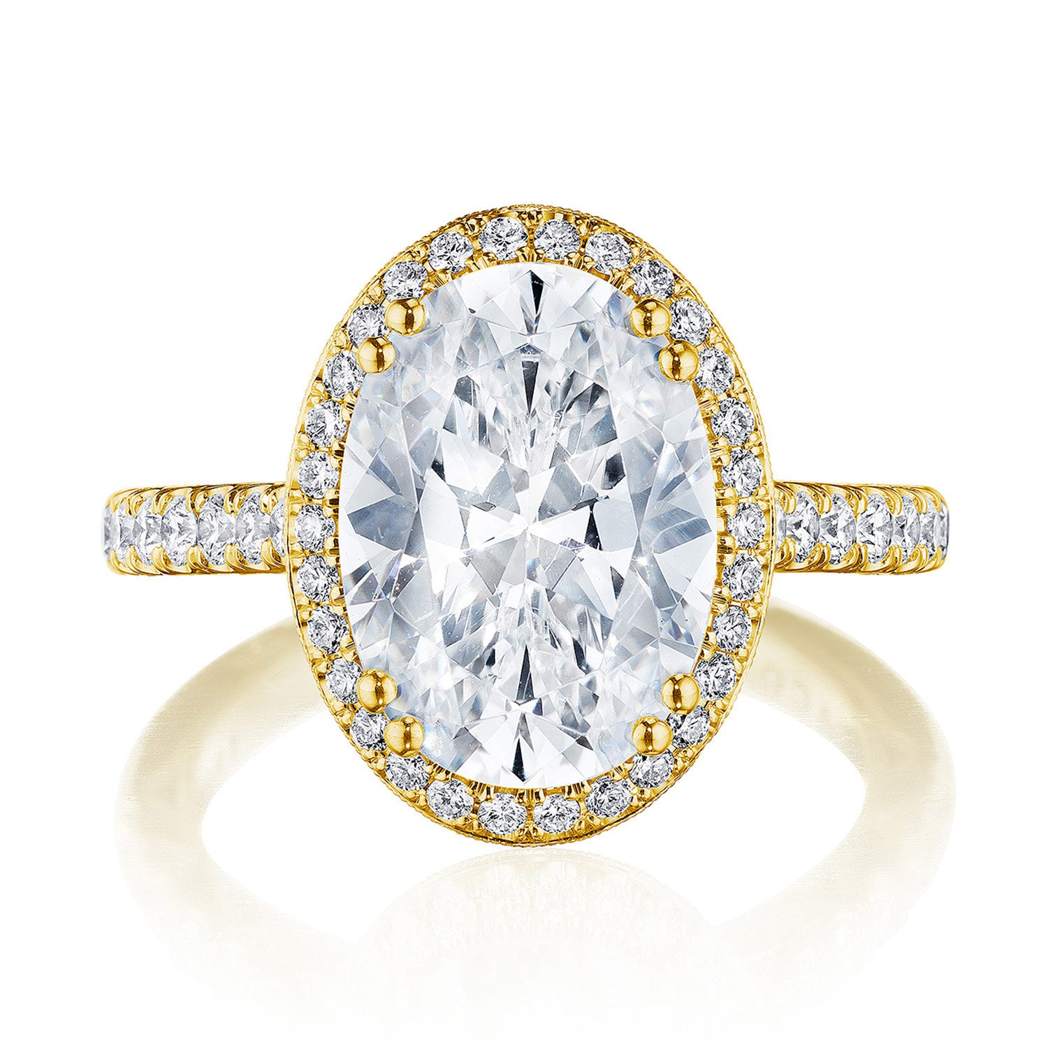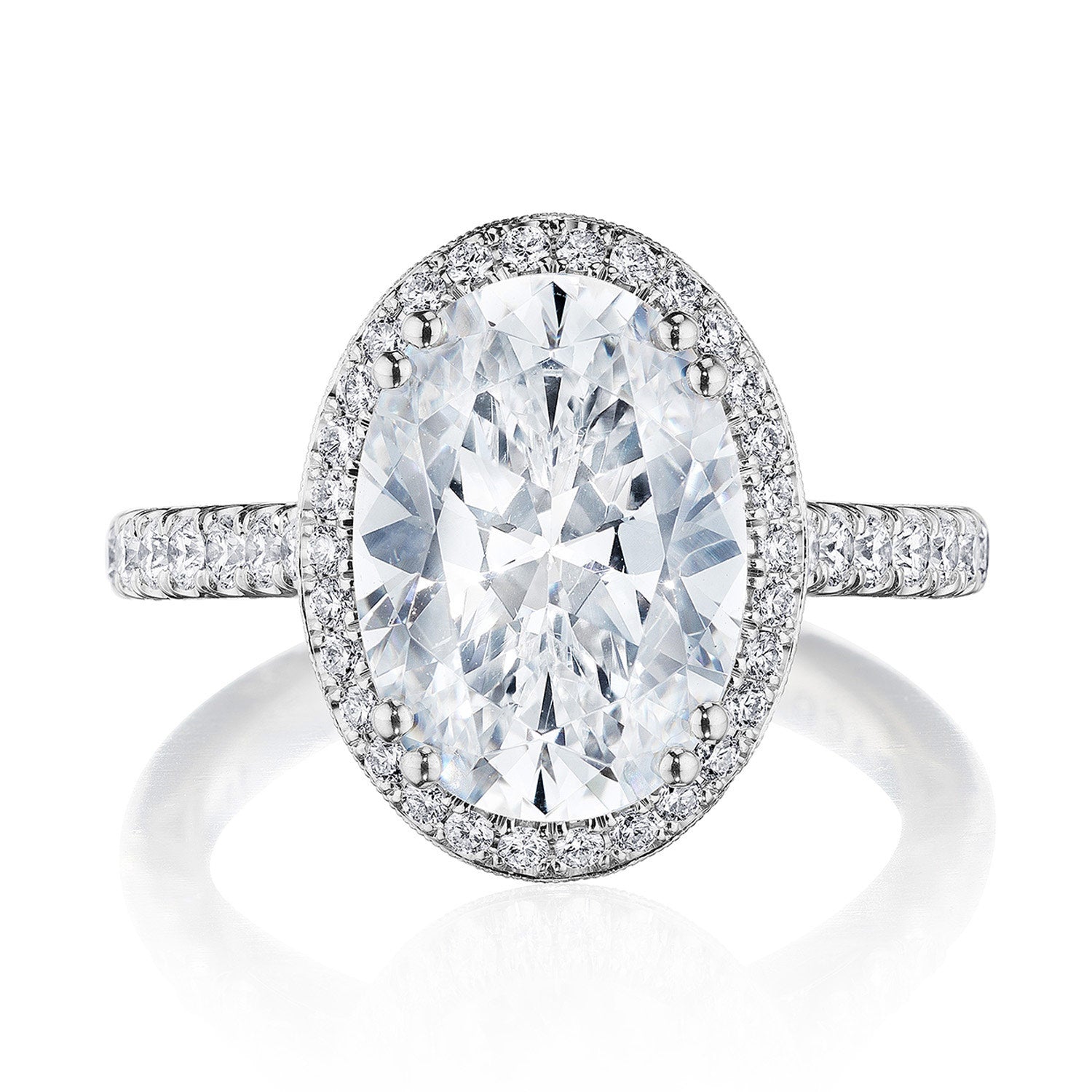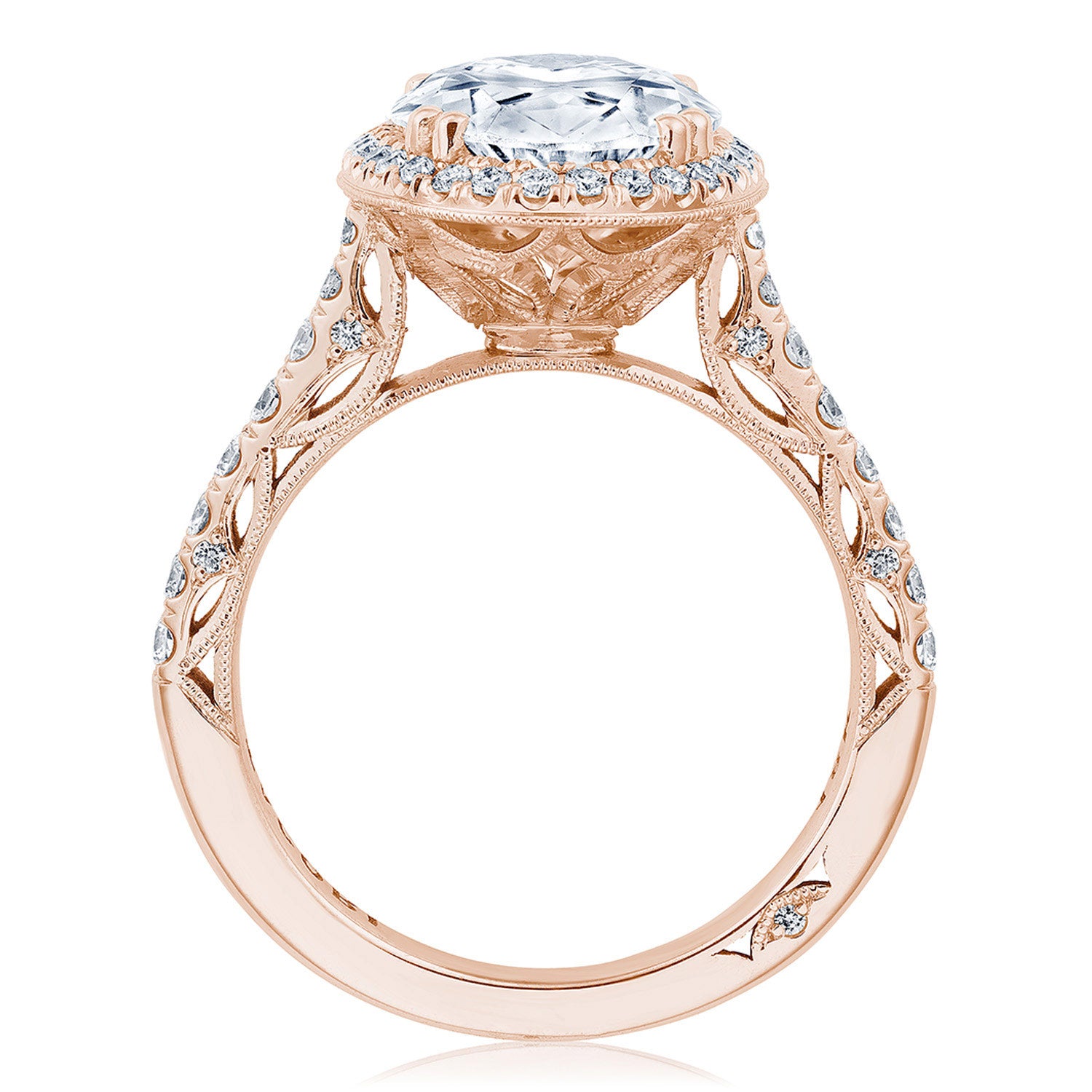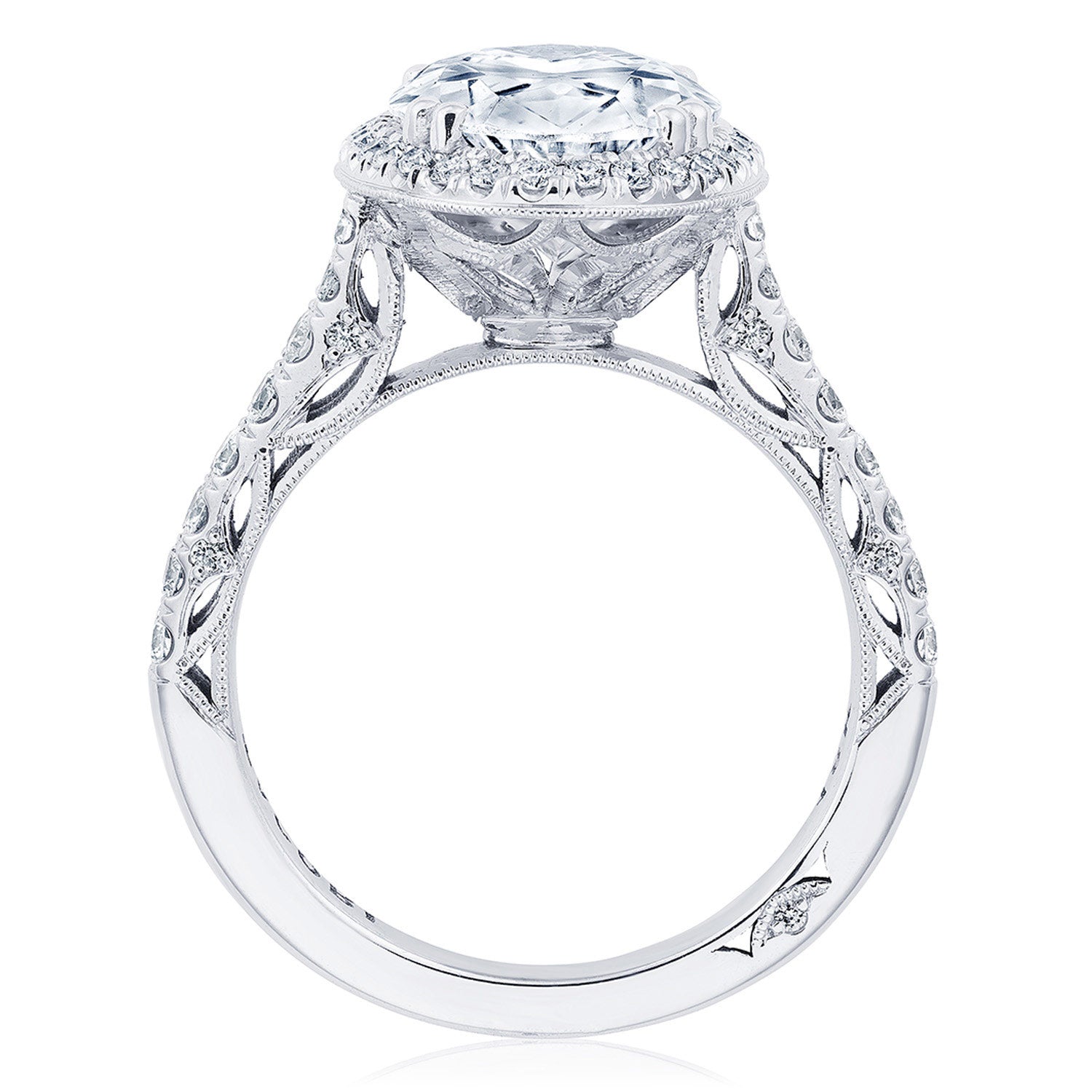A subtle Spotlight Bloom encircles the center stone, and more brilliance is added by the meticulous French pavé that leads up the ceiling. A lace-like Crescent Fabric, edged with milgrain, gives stunning texture to the inner face profile.