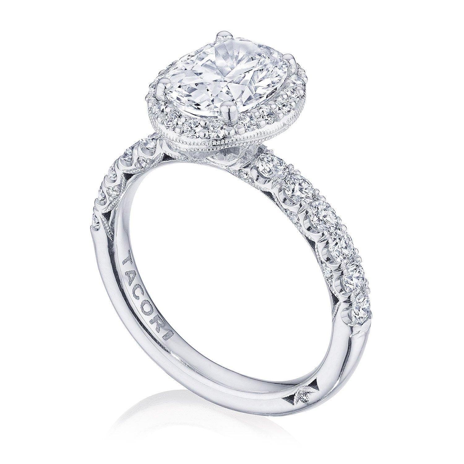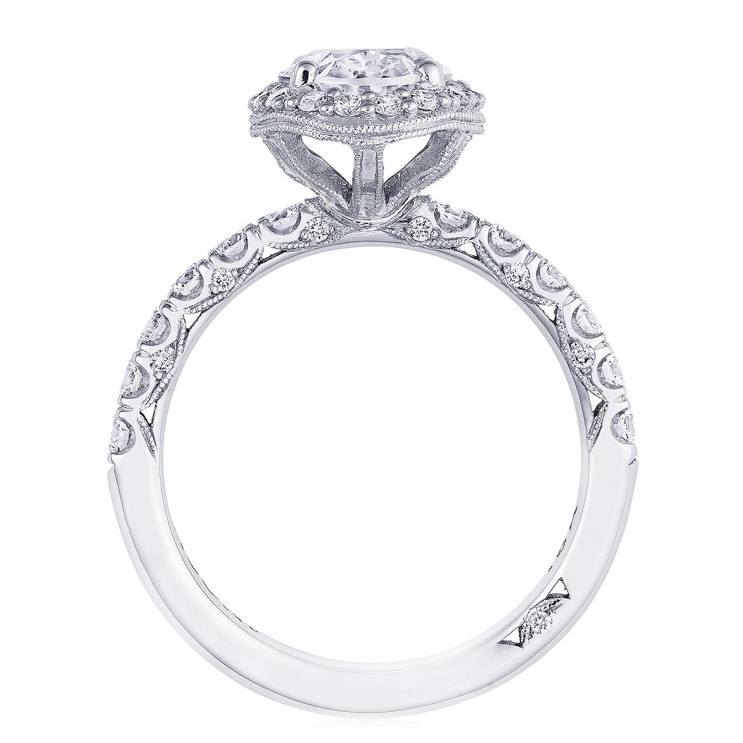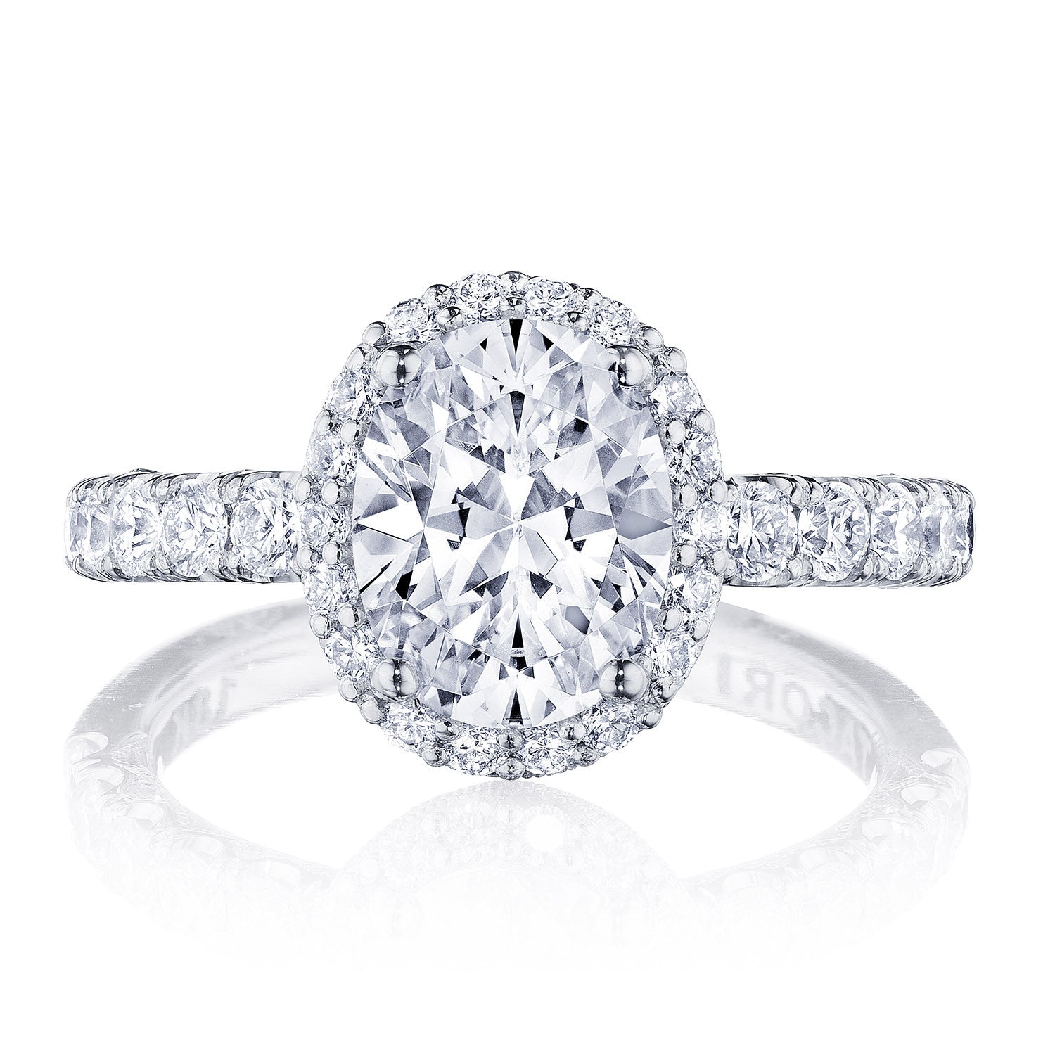 Pave-set diamonds lead towards an oval-bloomed center stone, which floats on a Classic 360 foundation with an open gallery. The innerface of the band is decorated with Petite Crescent fabric, and a Signature Crescent marks the resting point.