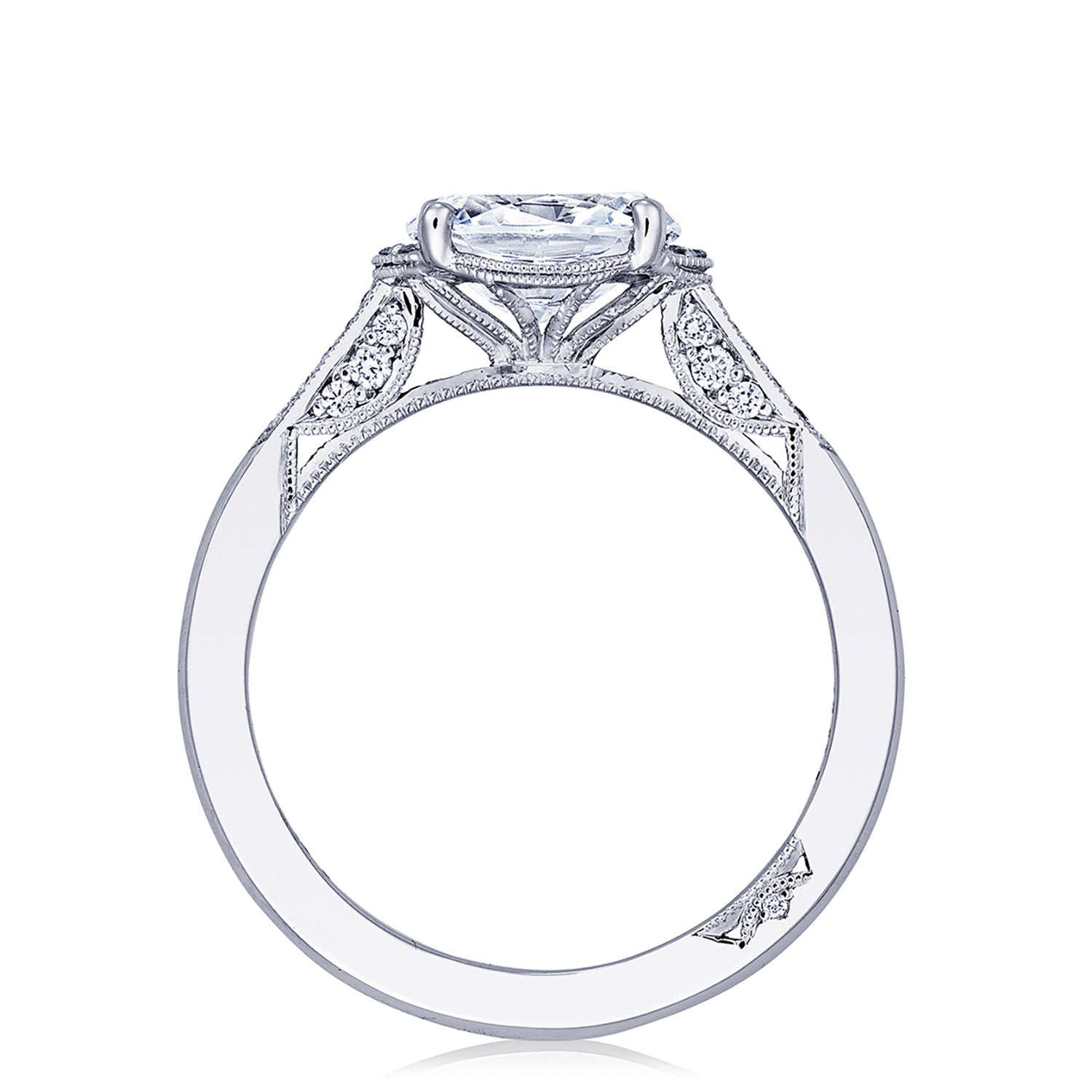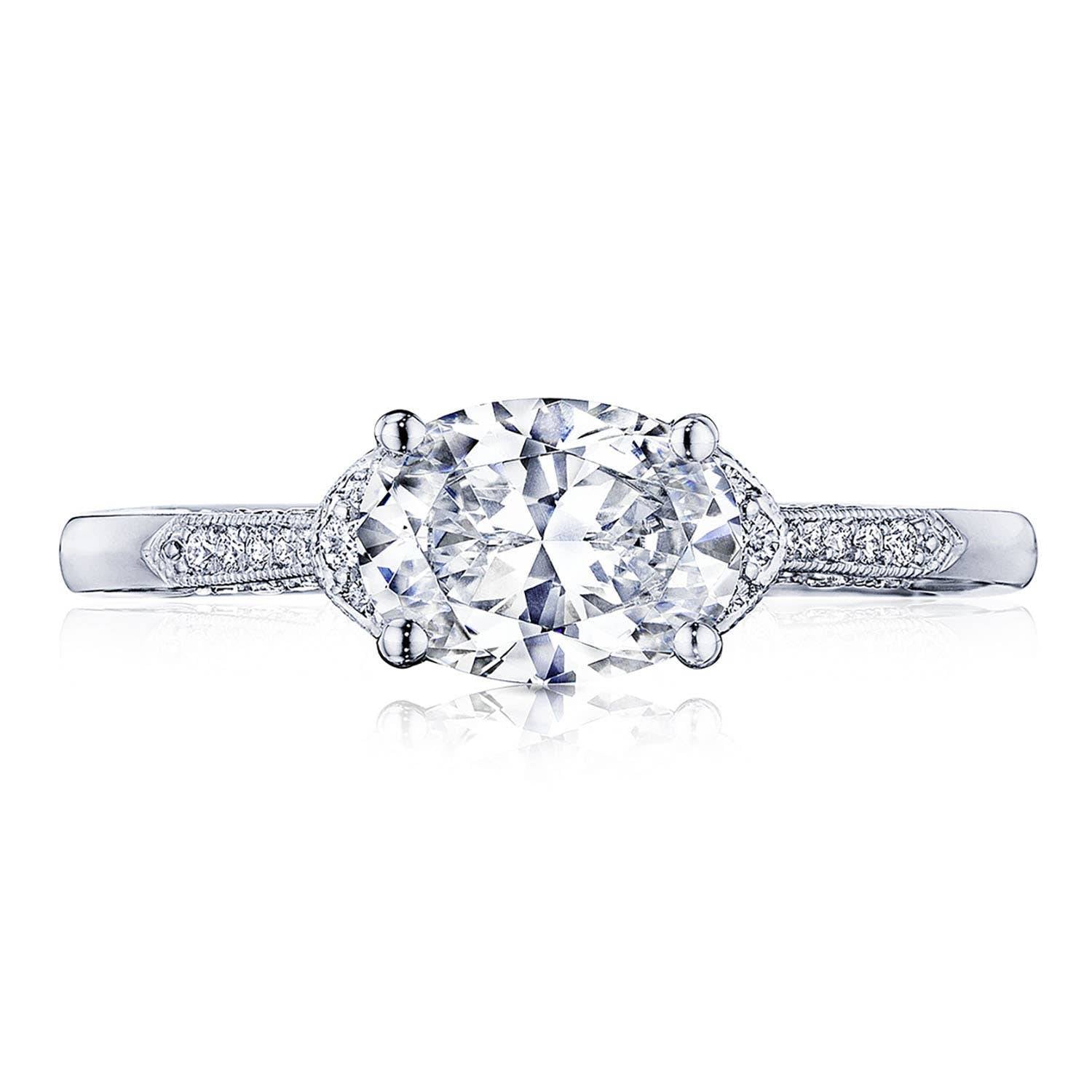 The oval solitaire is set East to West on the band and is accentuated by a diamond-tipped frame and pavé-set diamonds on the ceiling. Simply Tacori crescent fabric adds diamond detail just beneath the crown.