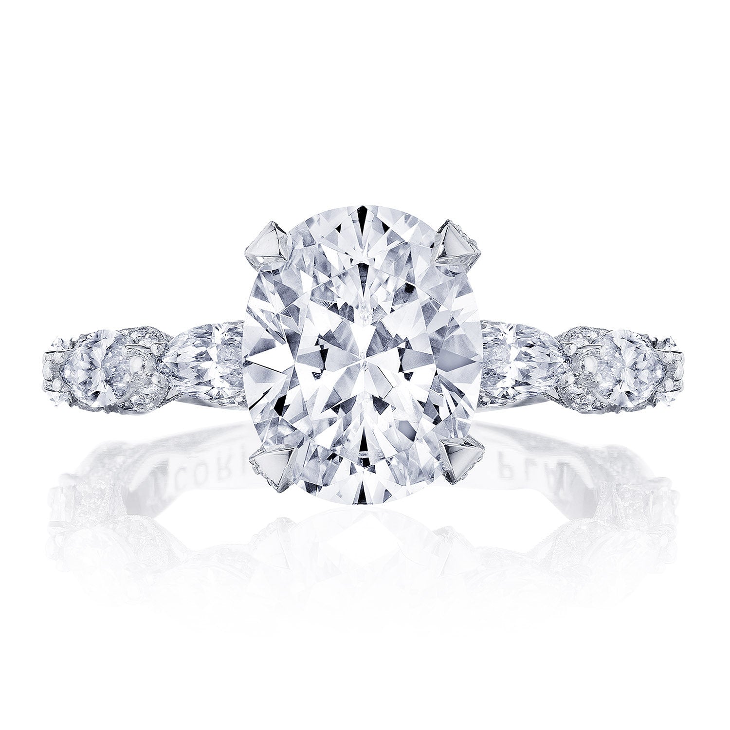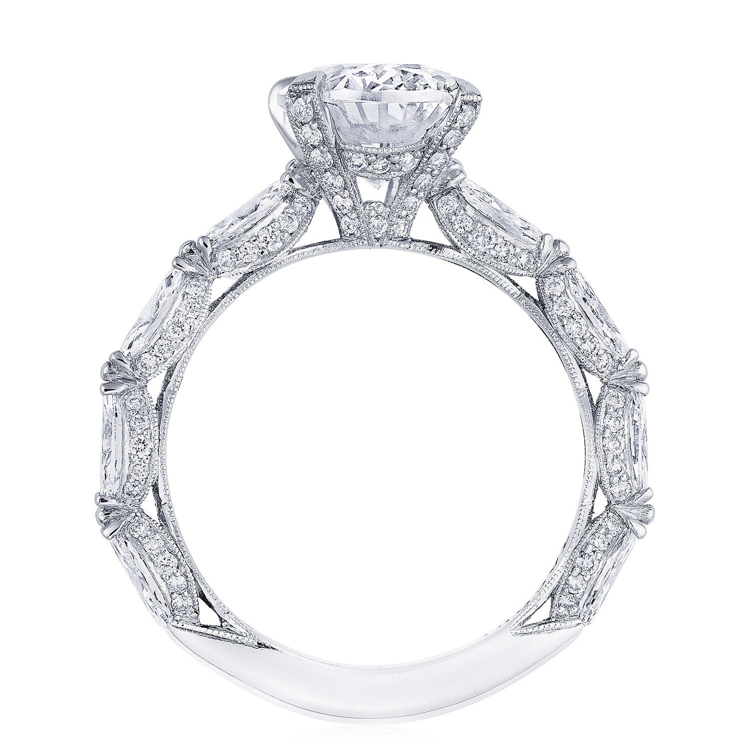 Oval-shape diamonds are set East-to-West on the ceilling, leading towards a solitaire set in a Classic 360 foundation. Delicate diamond studding decorates the prongs, while more diamonds accent the innerface of Classic Crescent fabric.