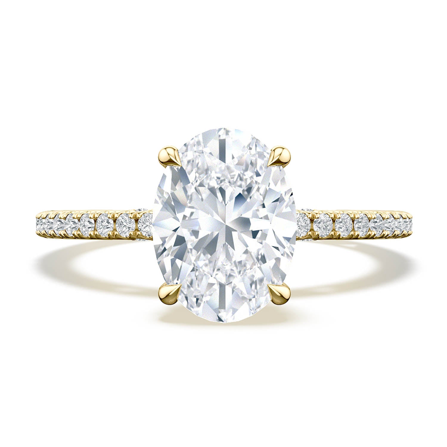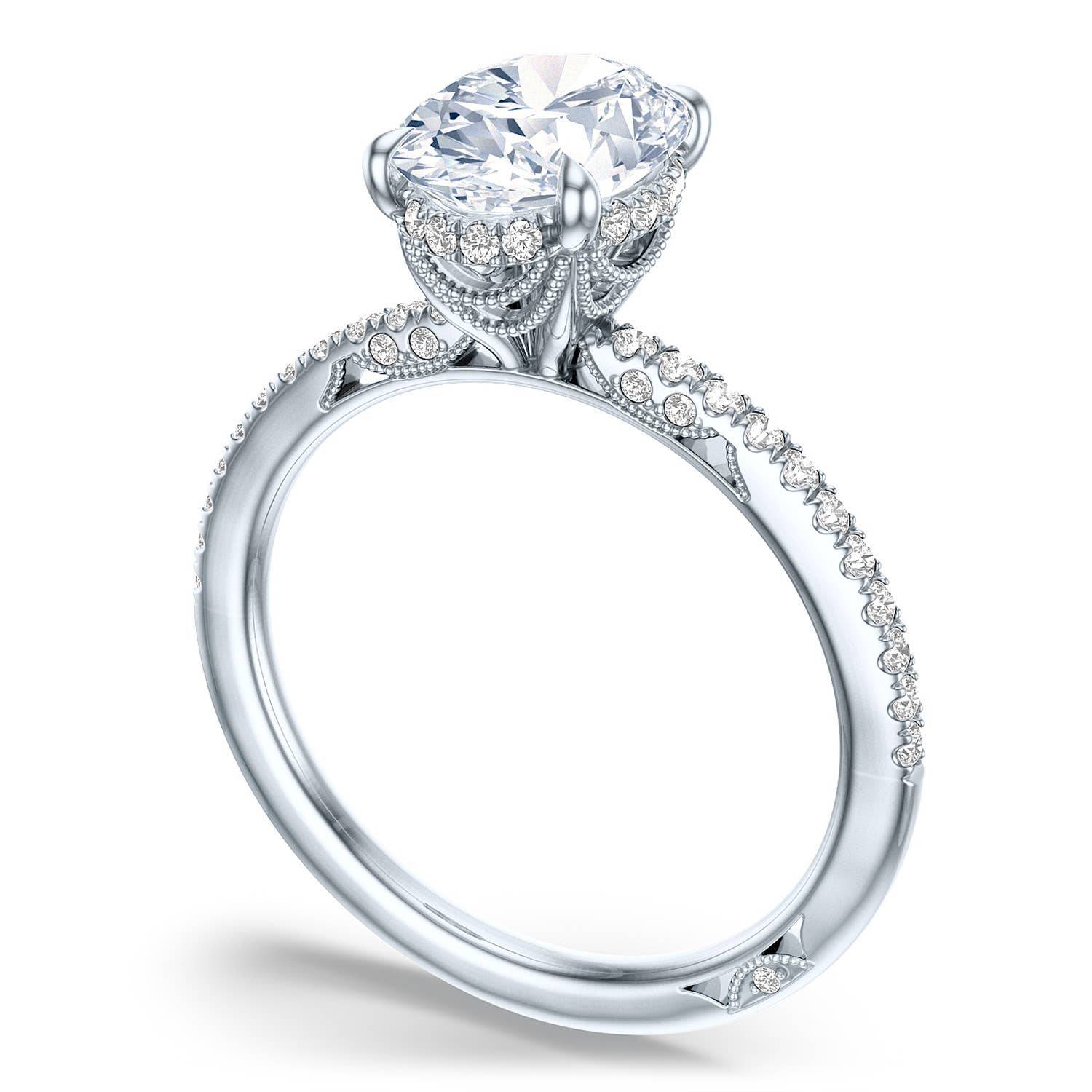 Draping milgrain from the crown is a joyful nod to the wedding day. Delicate pavé diamonds adorn the ceiling, and Simply TACORI crescent fabric decorates the inner face. A hidden bloom complements the high-polish band with an ornamented sparkle.