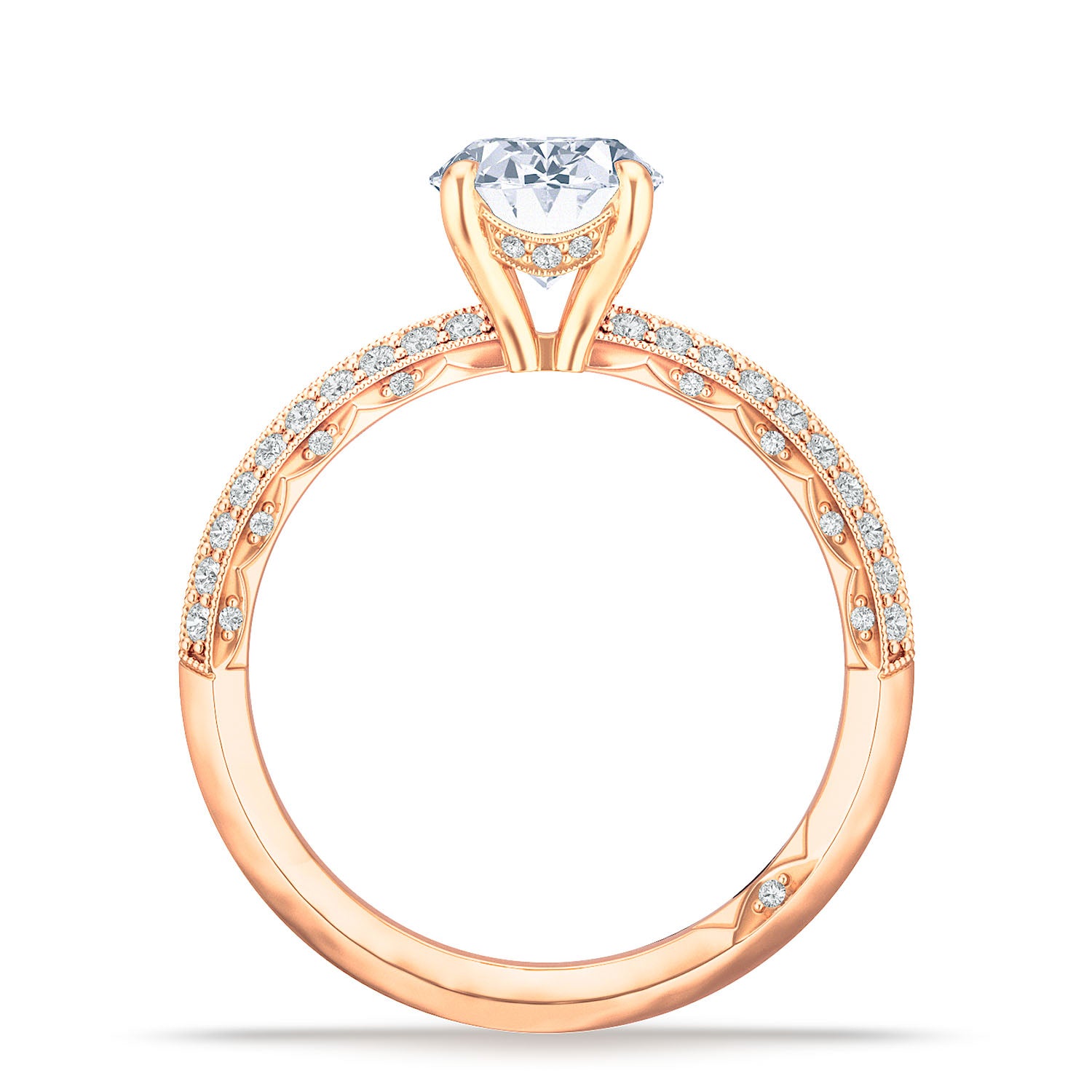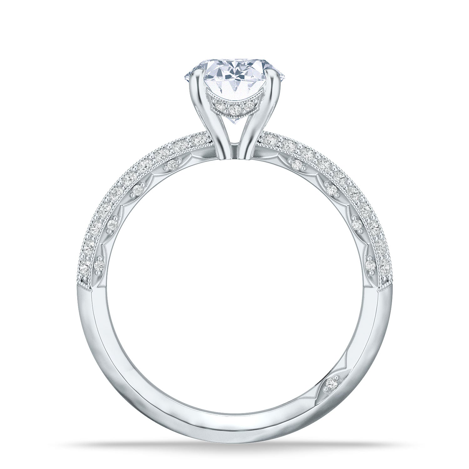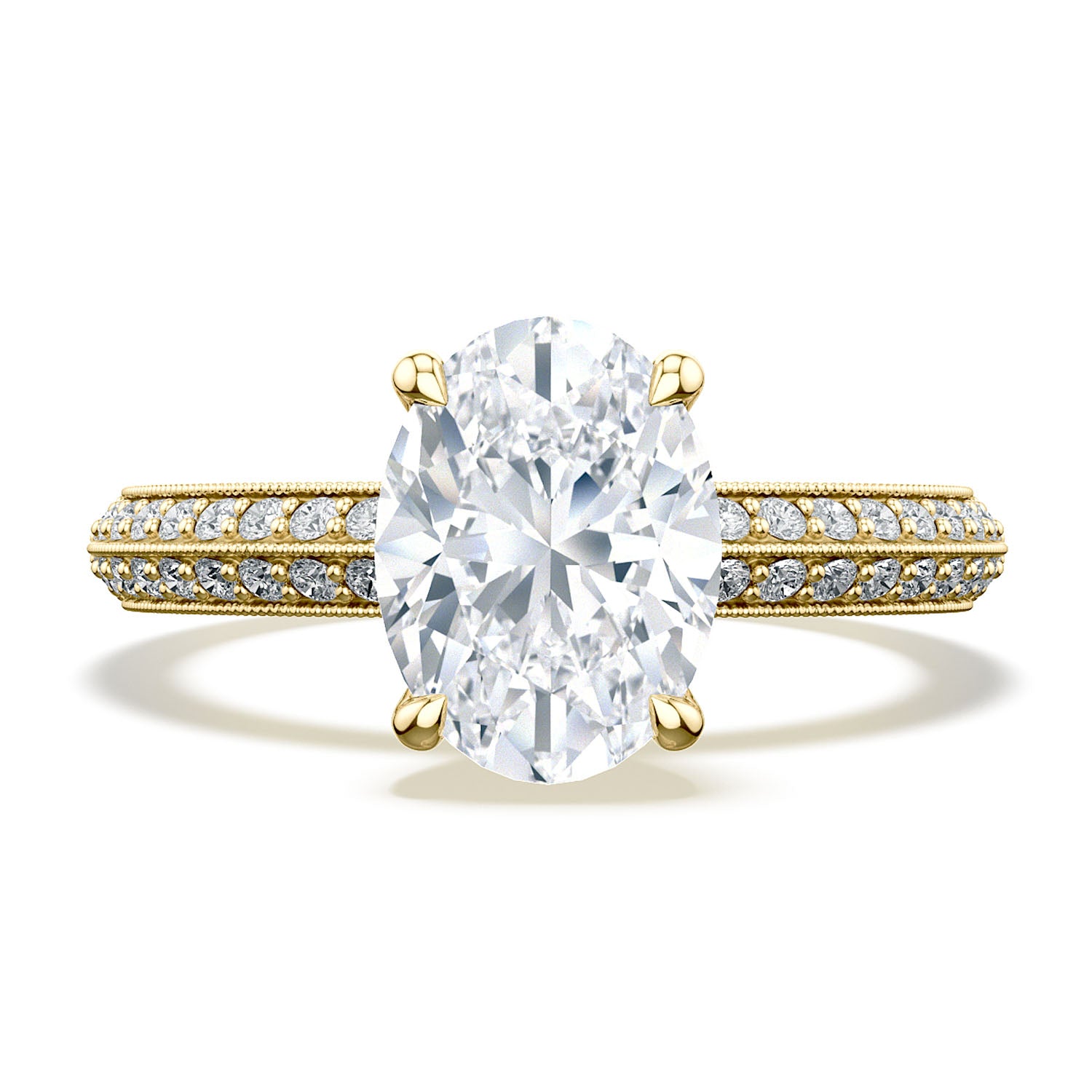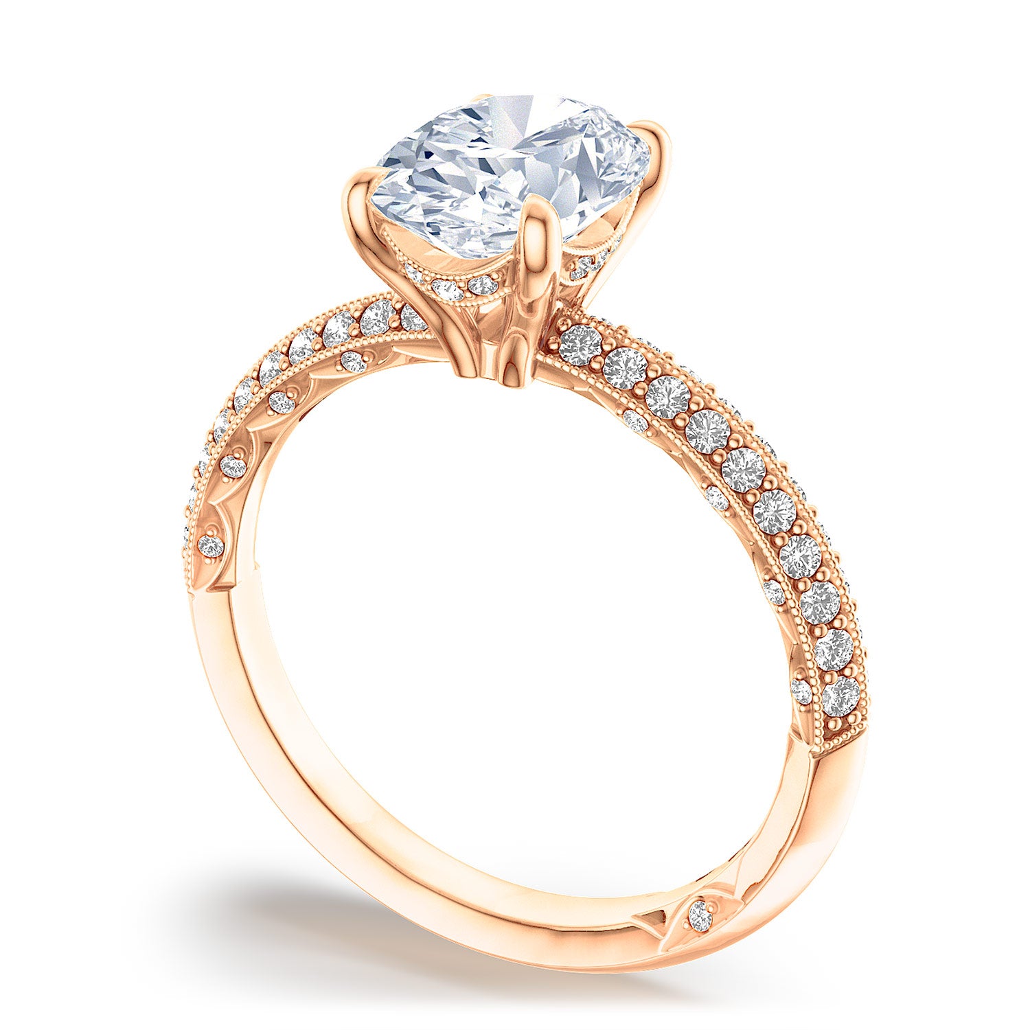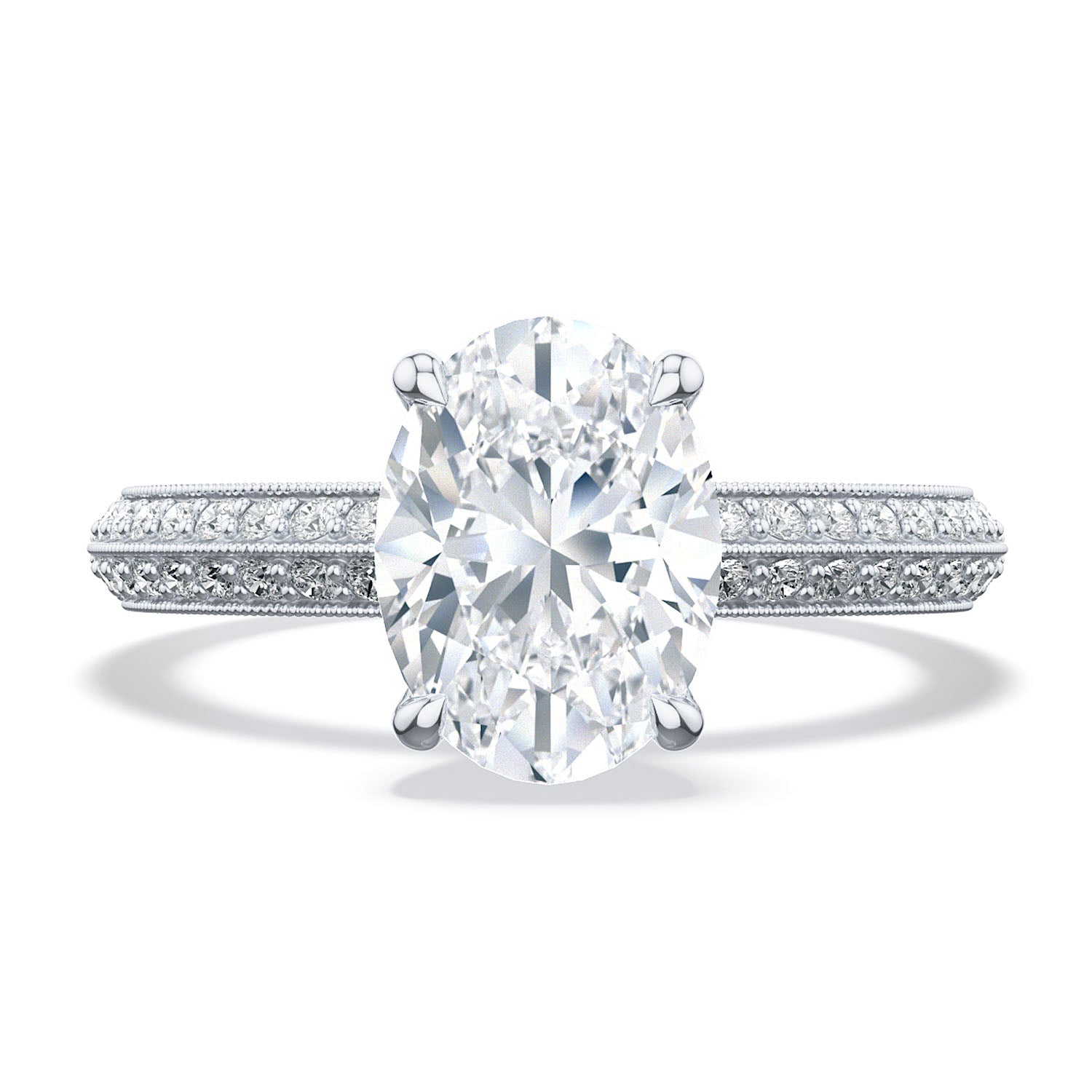 Double pavé lines the ceiling of the angular knife-edge band, while Sculpted Crescent with diamond touches decorate the innerface. The oval solitaire sits on a Classic 360 foundation with a hidden bloom for all-angle sparkle.