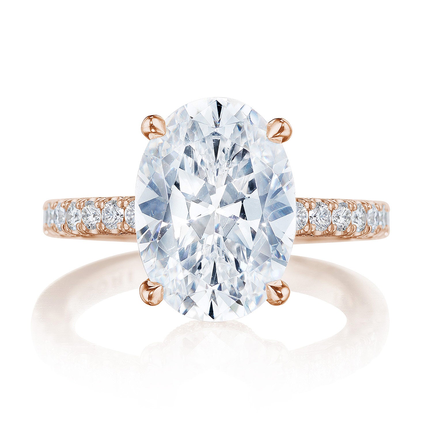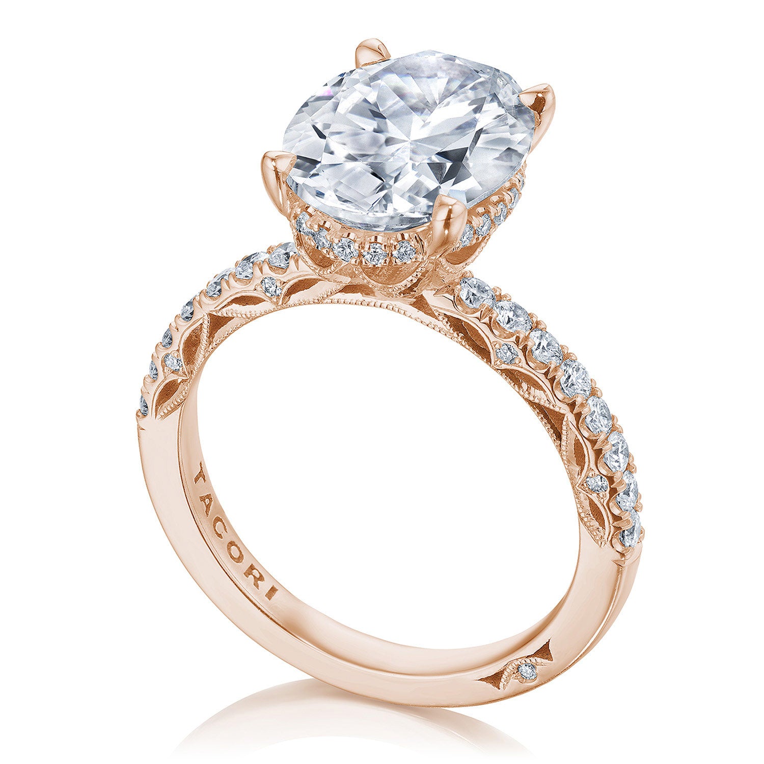 A French pavé ceiling adds dimensional light, while a hidden bloom and open air crown work illuminates the center stone. A complex and alluring lace-like Crescent Fabric gives stunning texture to the inner face profile.