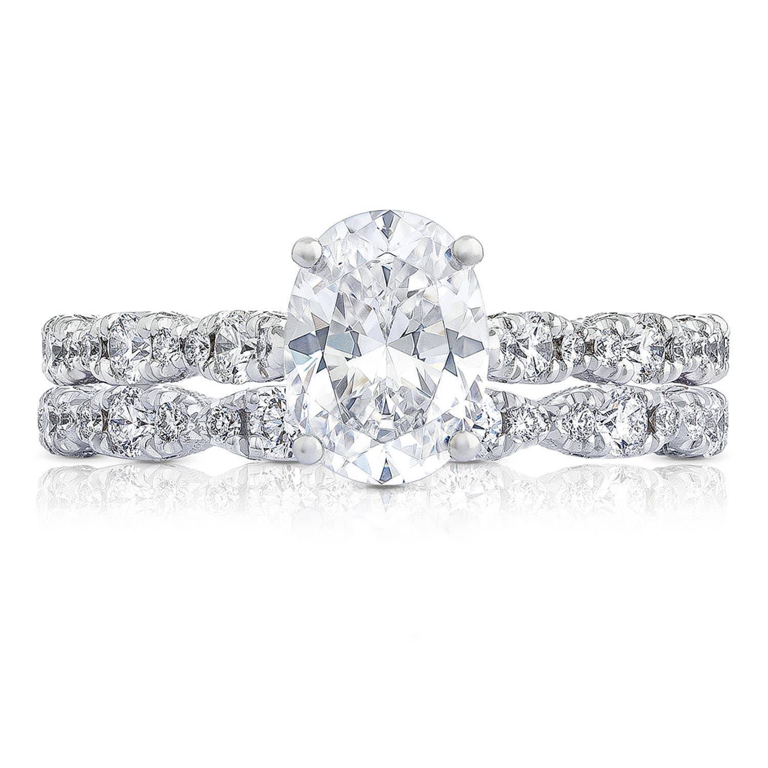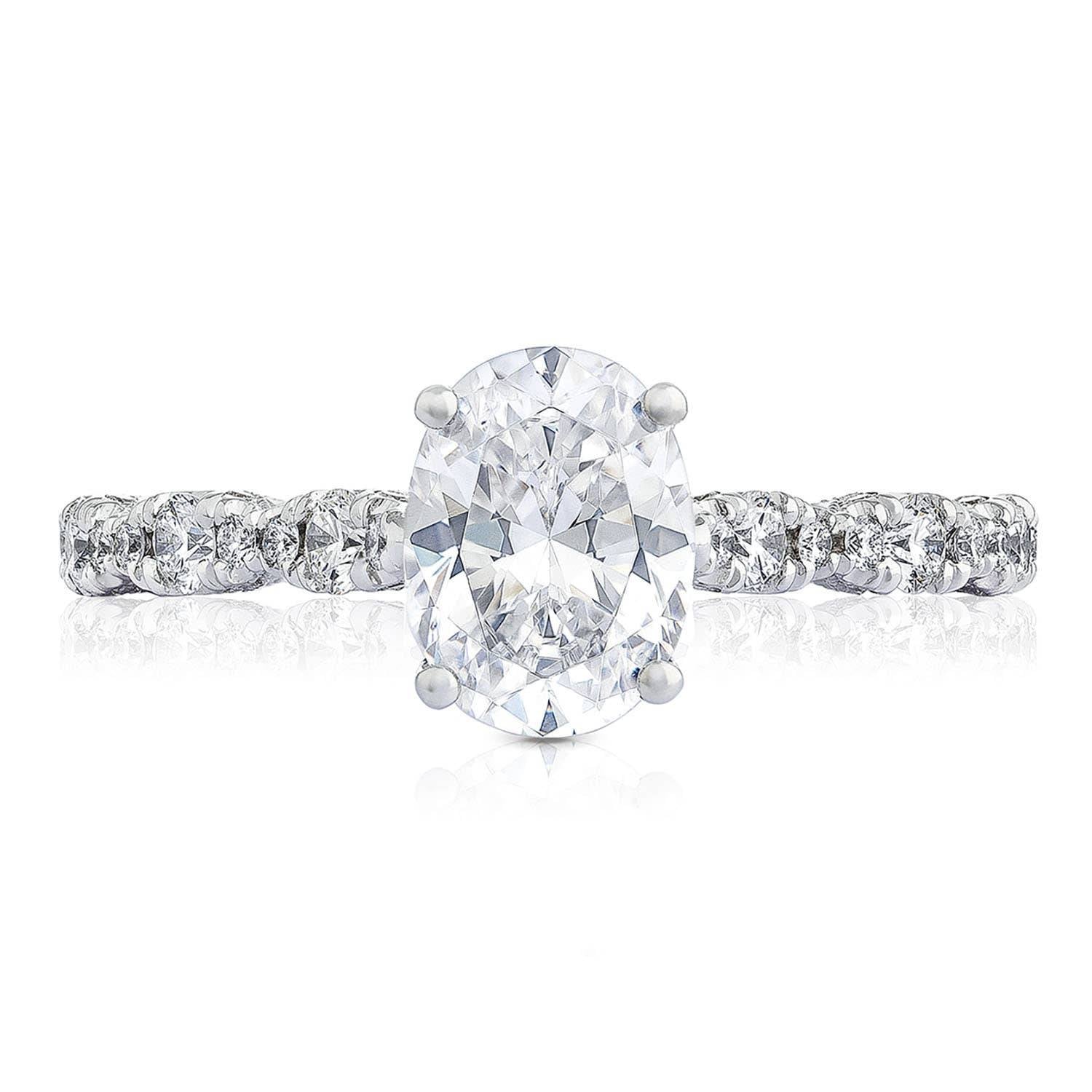 Graduating French pavé-set diamonds form marquise shapes on the ring ceiling, while diamond-studded Petite Crescent fabric decorates the innerface. The solitaire is set on a Cathedral foundation embellished with milgrain detailing.