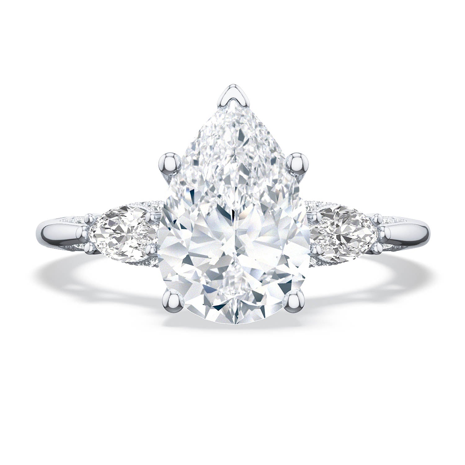 Two marquise side stones embrace the pear-shape center stone, which its on a diamond-decorated Cathedral foundation. Raised TACORI crescents and outlines of delicate milgrain beading are reminiscient of the elegant draping of bridal fabric.