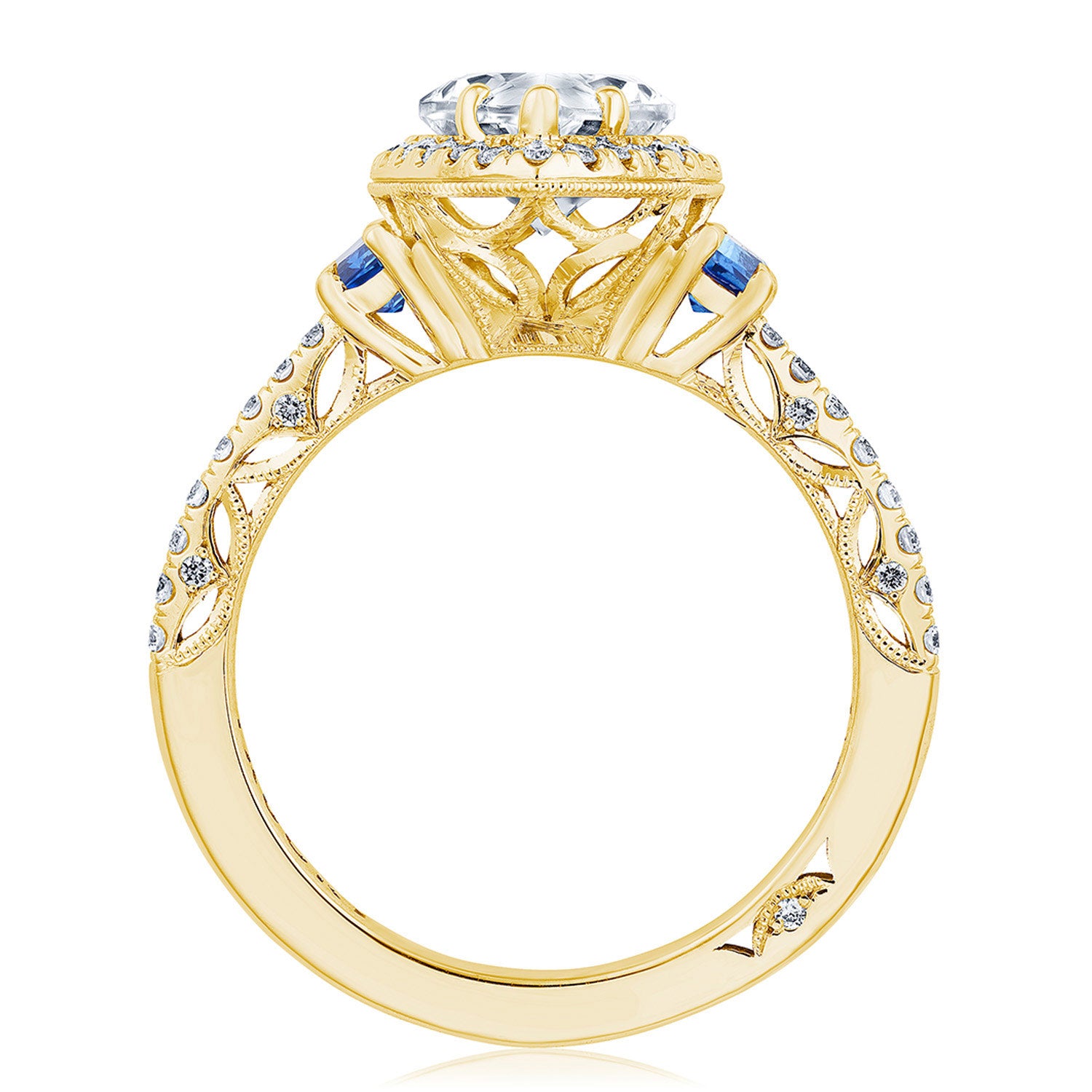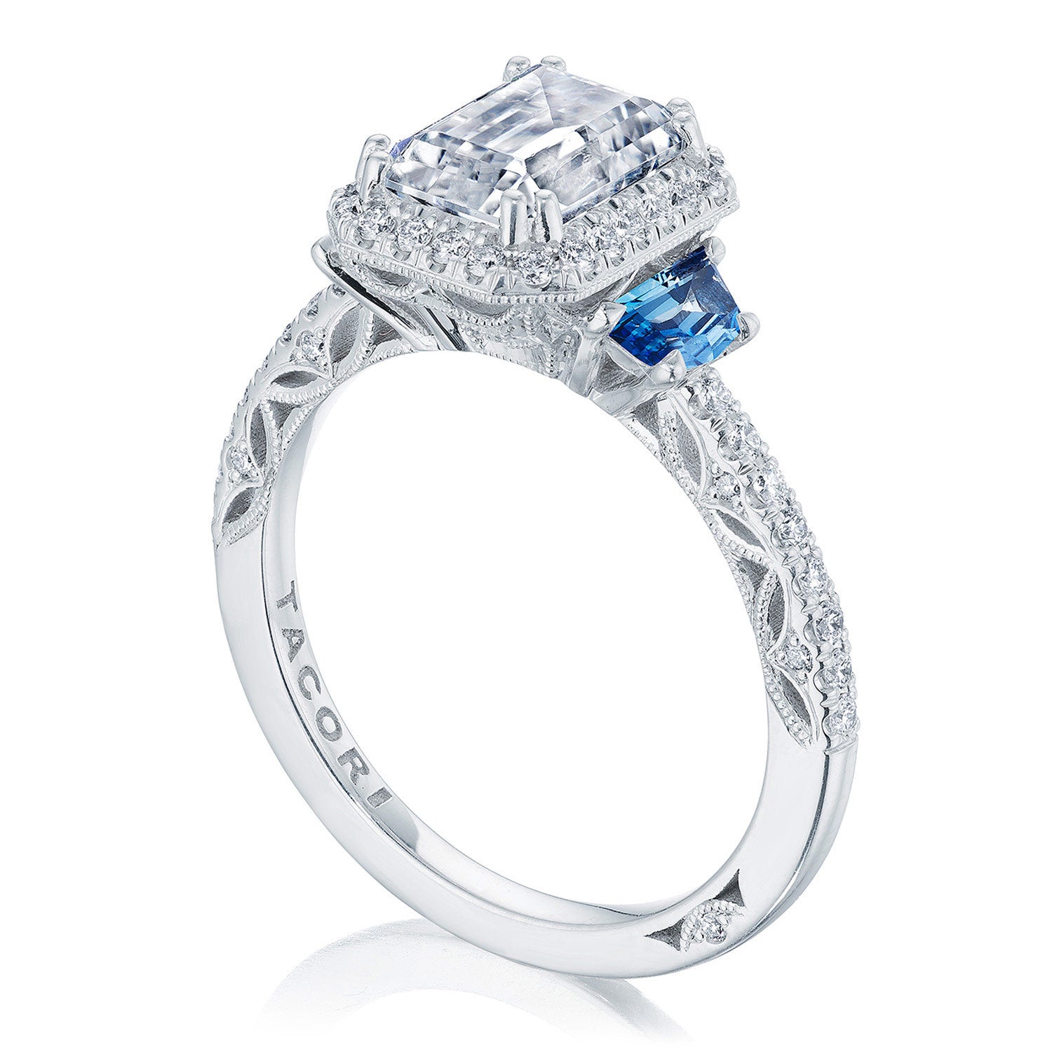 This elegant three-stone setting is exceptionally detailed. A Spotlight Bloom with blue sapphire Cadillac-cut side stones sit atop a meticulous French pavé band enhanced by the lace-like, Dantela Crescent Fabric.