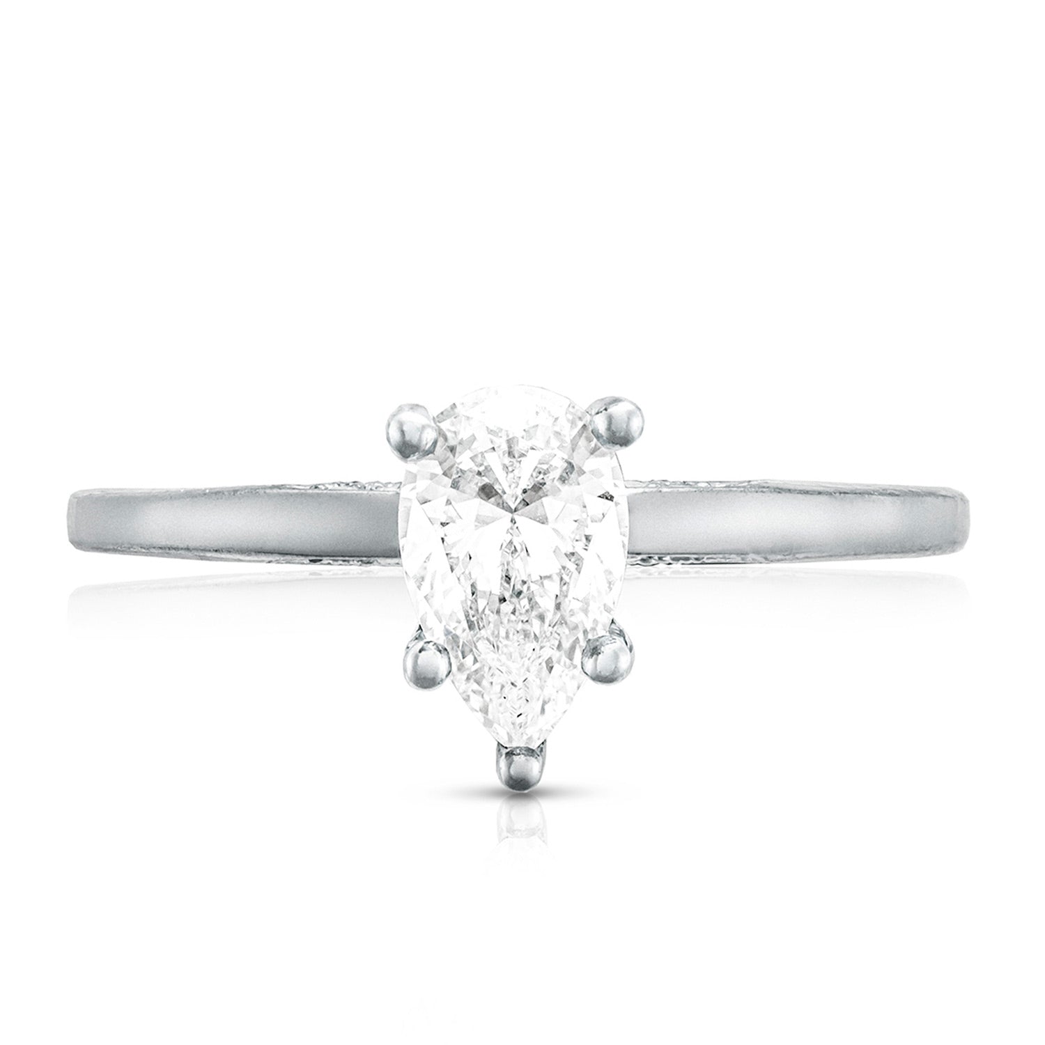 Features a Classic 360 foundation with a high polish finish. The iconic Simply Tacori crescent fabric decorates the ring with delicate diamond and milgrain detailing, while a hidden bloom beneath the crown adds an all-angles sparkle.