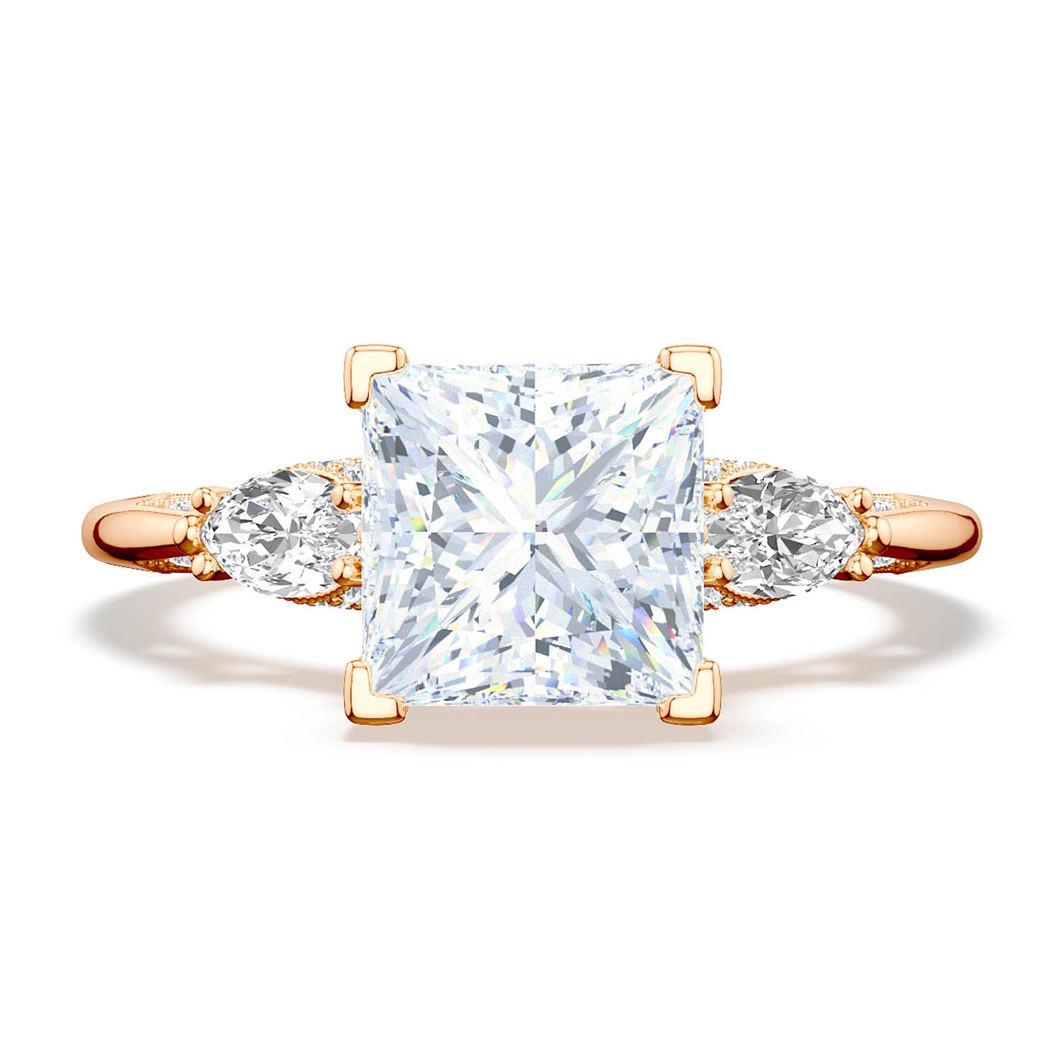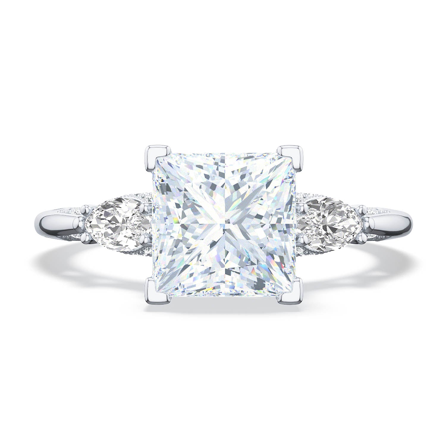 Two marquise side stones embrace the princess-shape center stone, which its on a diamond-decorated Cathedral foundation. Raised TACORI crescents and outlines of delicate milgrain beading are reminiscient of the elegant draping of bridal fabric.