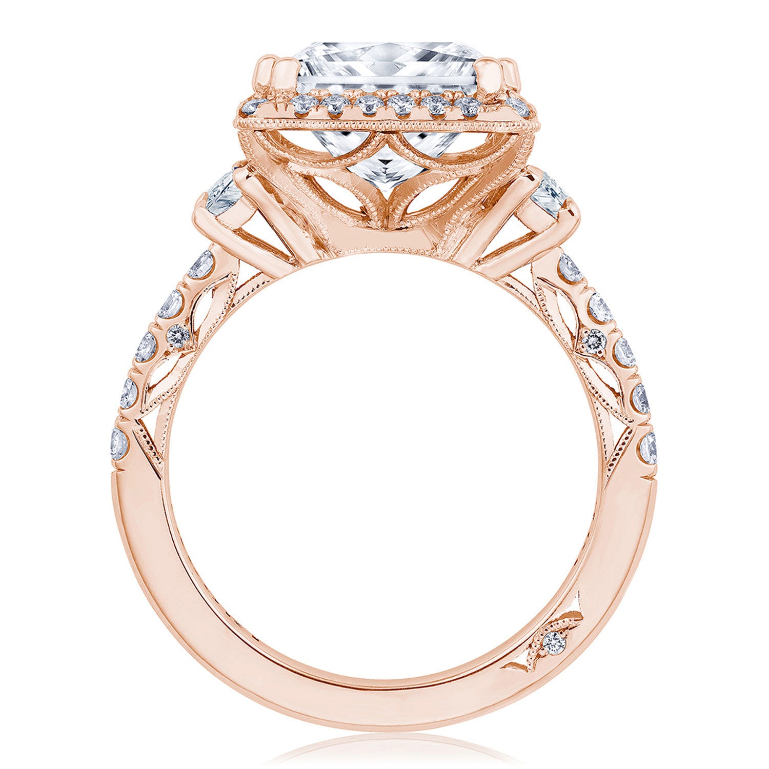 This elegant three-stone setting is exceptionally detailed. A Spotlight Bloom with radiant Cadillac side stones sit atop a meticulous French pavé band with lace-like, milgrain-edged Dantela Crescent Fabric.